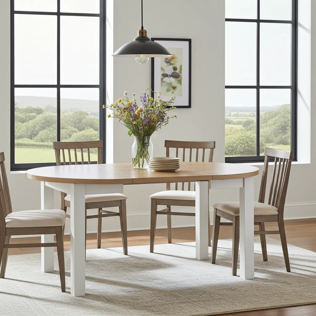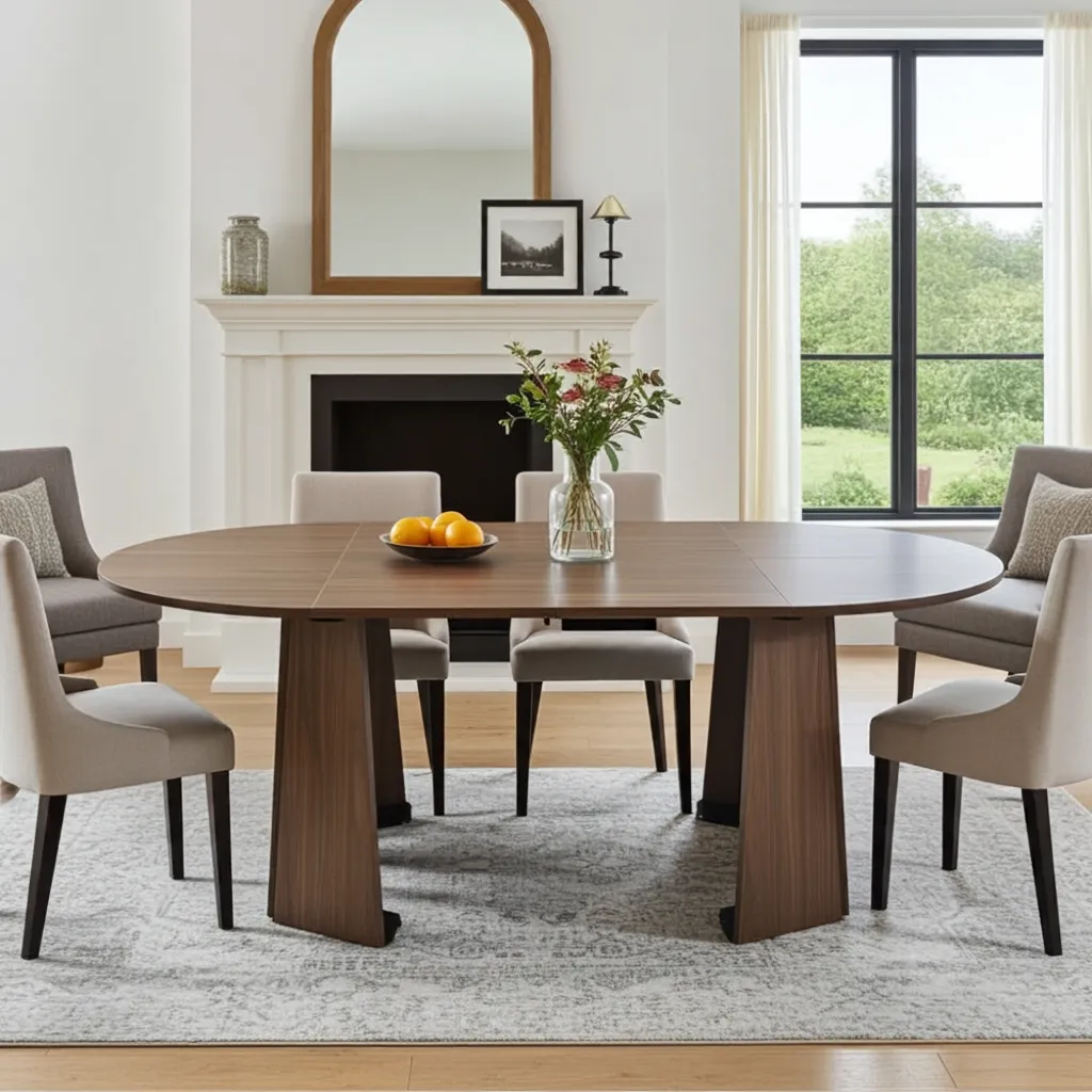 An extendable dining table saves space by offering a reduced collapsed footprint for daily life and a larger extended surface when needed, with leaves that either self-store or are removed and stowed separately. For a studio apartment, a compact oval table with a self-storing butterfly leaf can provide seating for two daily and four when extended without extra storage needs. In an open-plan home, a rectangular table with removable leaves can expand to host larger gatherings while keeping circulation open when collapsed. Consider whether you need self-storing leaves or removable leaves based on your storage availability and frequency of expansion, since that choice affects both convenience and placement planning.