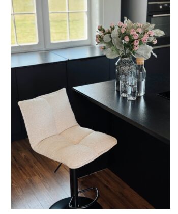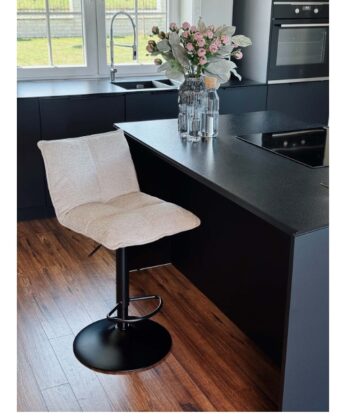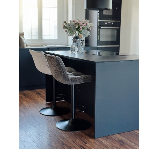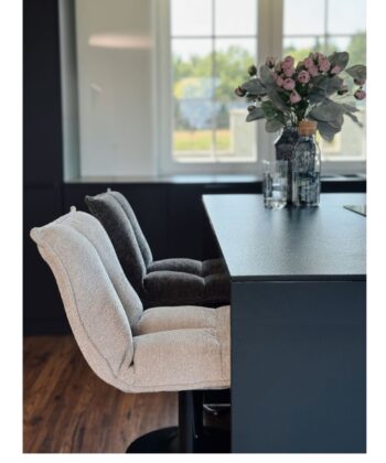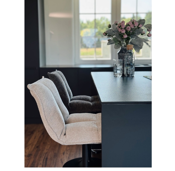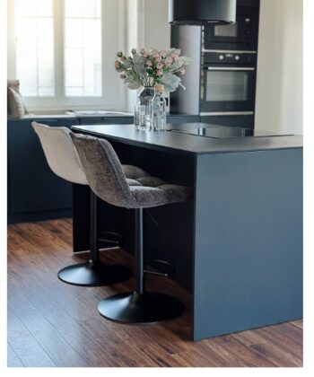 The Raven Urban Bar Stool Kos elevates kitchen islands, breakfast bars and home bars with its soft dark grey chenille upholstery, high supportive backrest and ergonomic design perfect for extended dining or casual gatherings. The height-adjustable mechanism (65-86 cm seat height) accommodates various counter heights while the integrated footrest promotes proper posture and comfort. This sophisticated stool blends seamlessly into modern, glamour and Scandinavian kitchen arrangements.