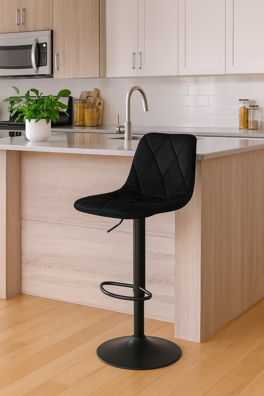 Built on a solid black metal base with height-adjustable mechanism (60-80 cm seat height), the stool features a practical footrest for proper posture and stability. The soft velvet seat (45×36 cm) feels luxurious while maintaining durability for daily use. This versatile hoker transforms utilitarian counter spaces into elegant entertainment zones effortlessly.