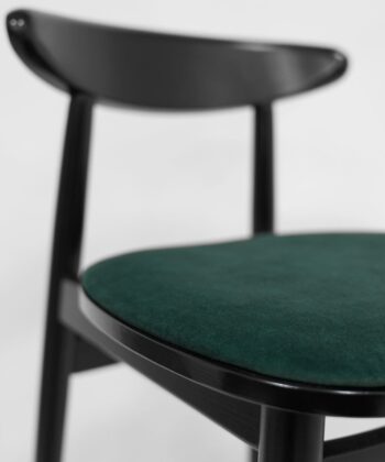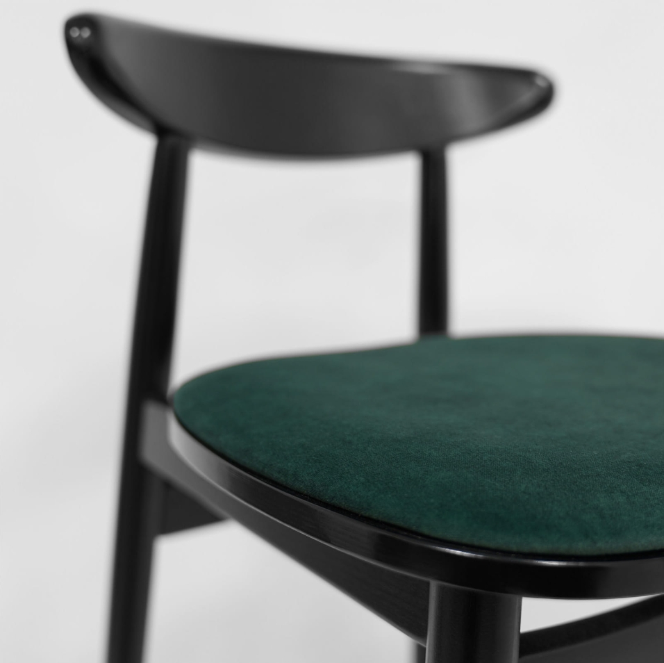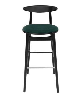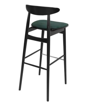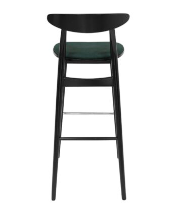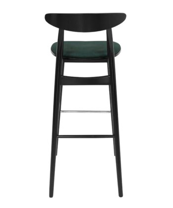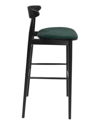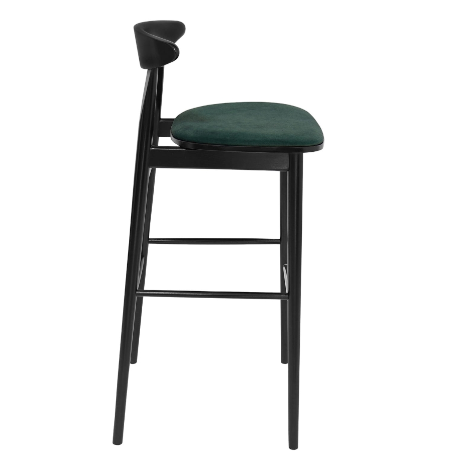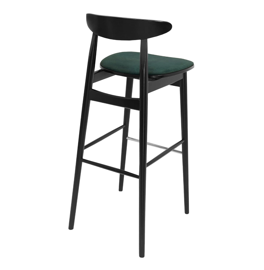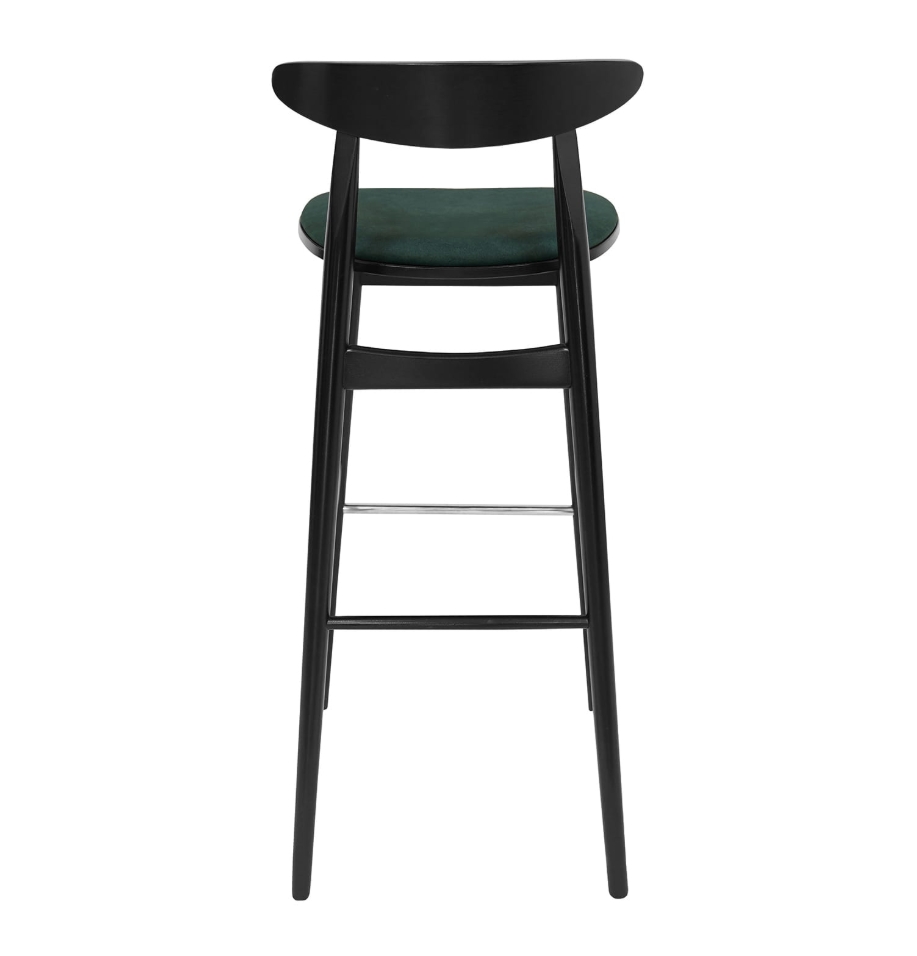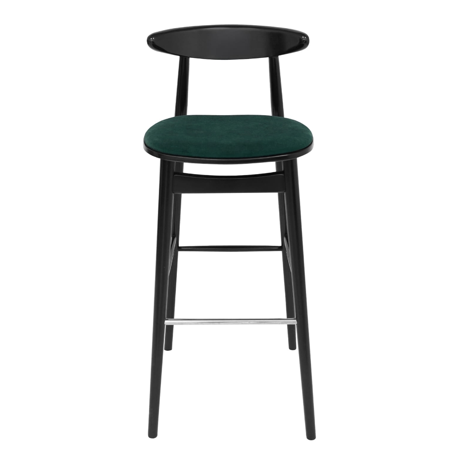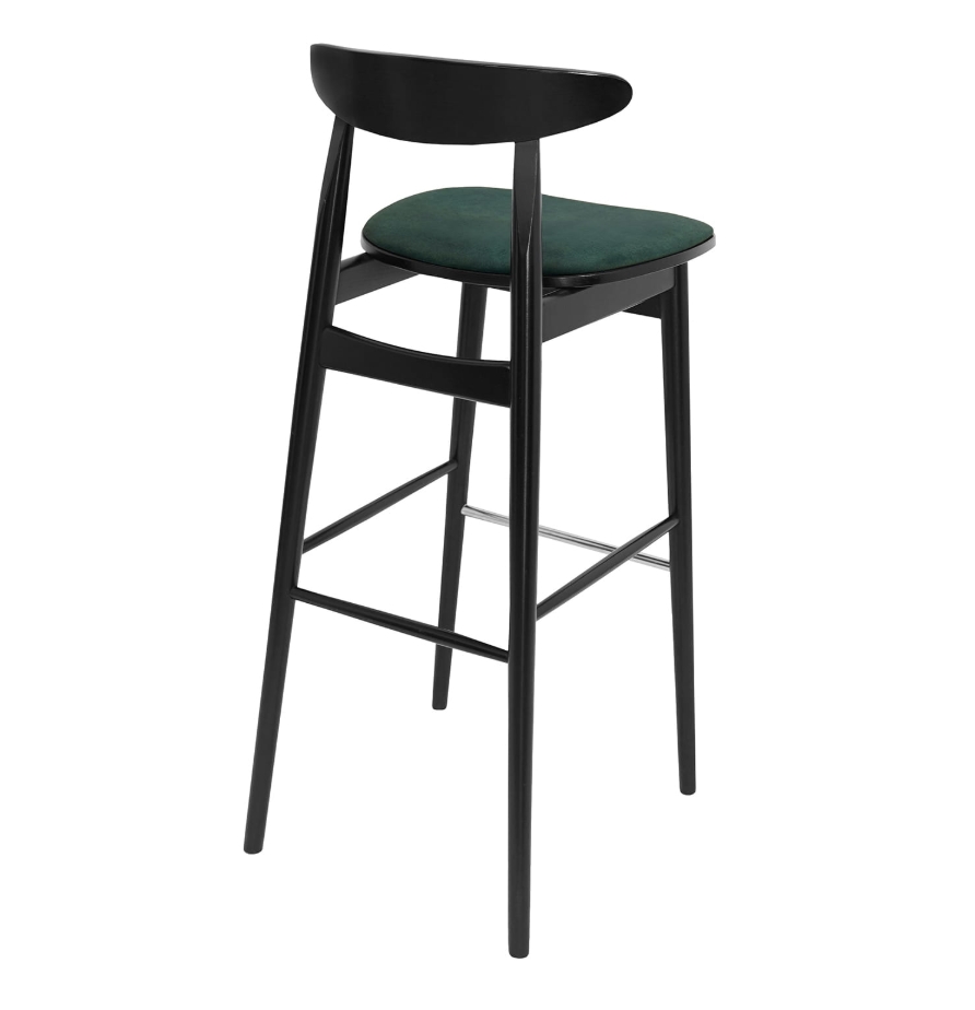 The Nordic Ember Bar Stool blends sleek modern lines with classic craftsmanship, perfect for kitchen islands, stylish home bars and upscale restaurants. Its slender beech wood frame in sophisticated black finish creates visual lightness while the gently curved backrest provides comfortable lumbar support during extended meals or cocktails. The padded chenille seat in rich green adds inviting warmth to Scandinavian, industrial or traditional kitchen designs.