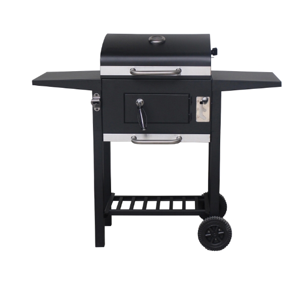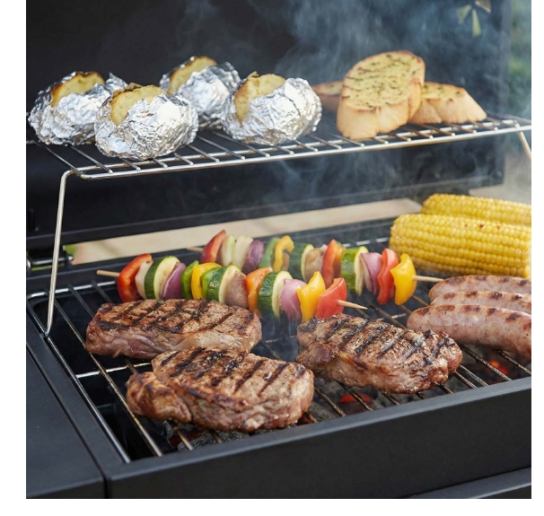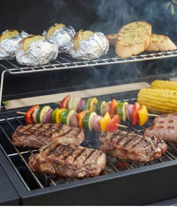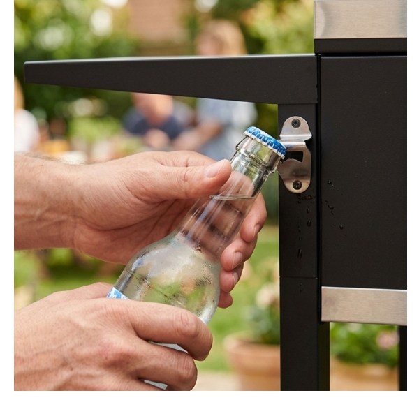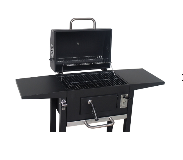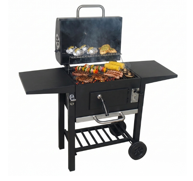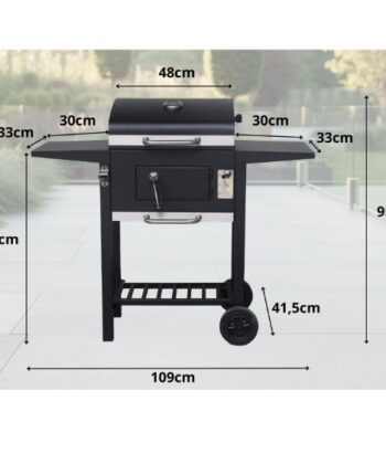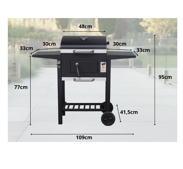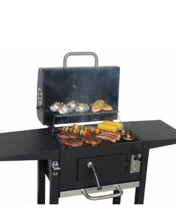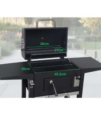 The two side shelves provide extra space for plates, ingredients, and accessories, making food preparation easier. The warming rack keeps finished dishes at the right temperature, so they stay ready to serve. Furthermore, the integrated ash removal system simplifies cleaning after use, while the transport wheels allow you to move the grill without difficulty.