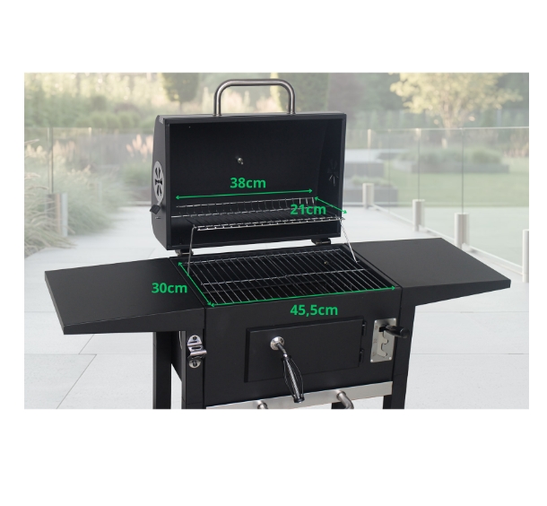 The adjustable coal tray allows you to control the fire height and manage heat with more accuracy. In addition, the stainless steel thermometer built into the lid helps you monitor the temperature during cooking. The two chromed grates make it possible to divide the cooking area into different heat zones, which is especially useful when preparing various dishes at the same time.