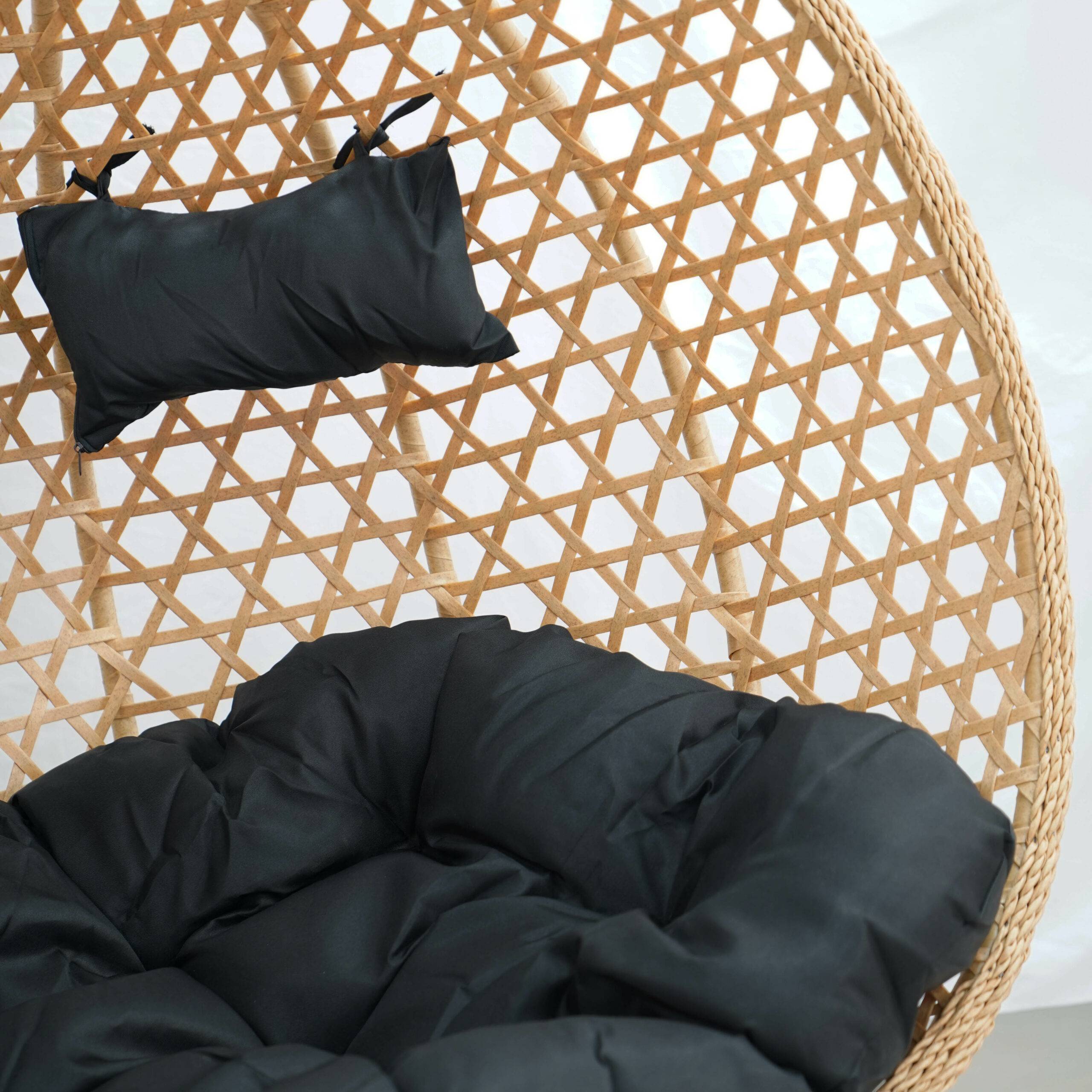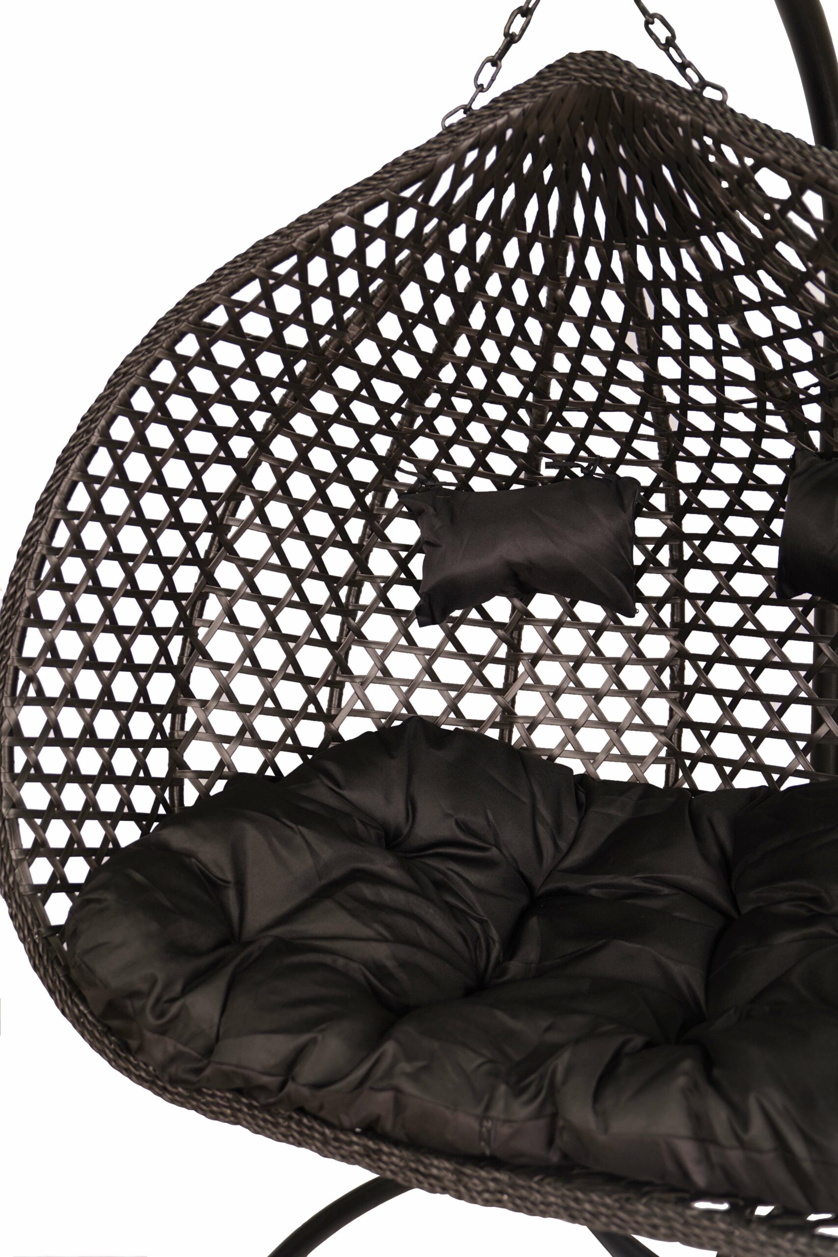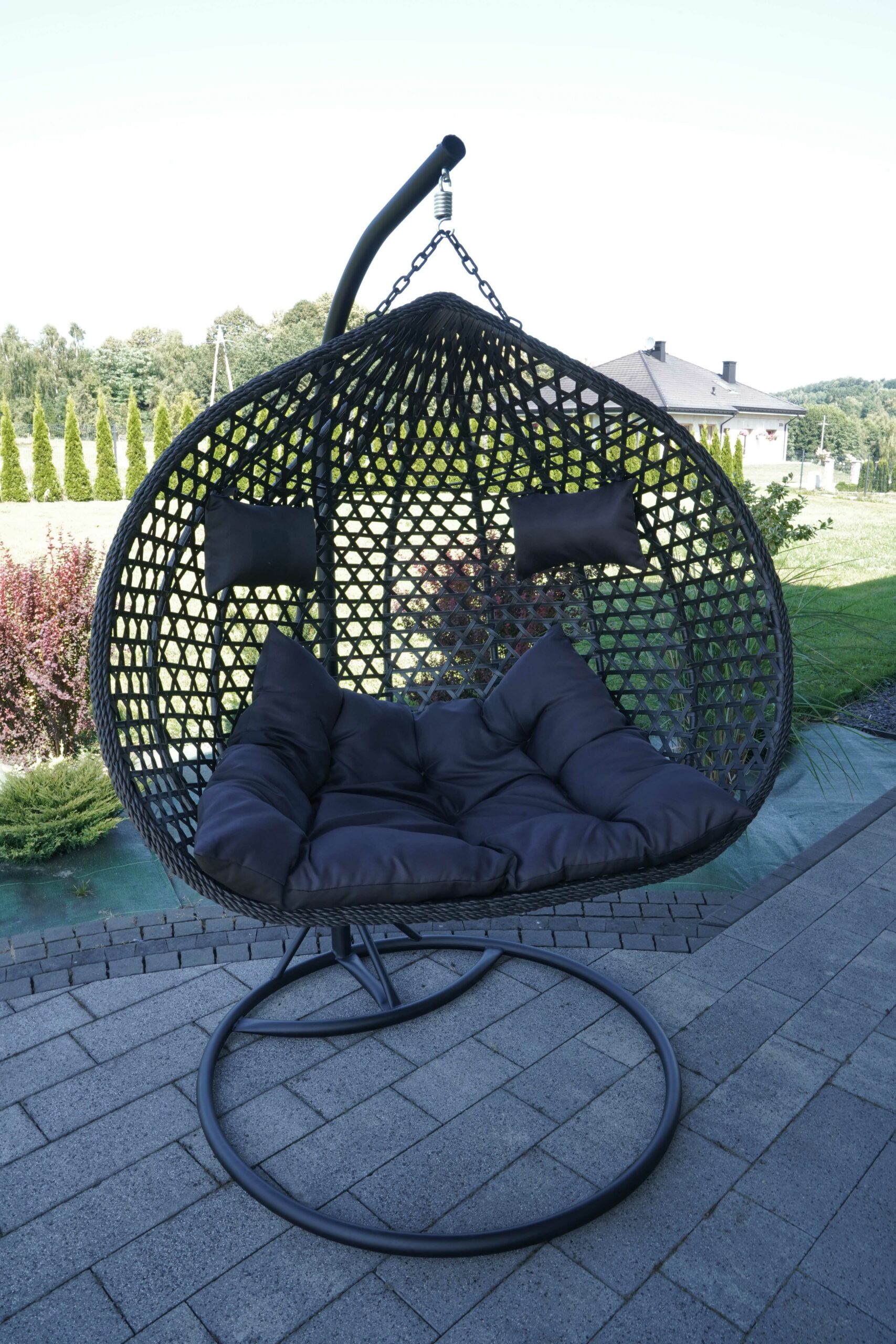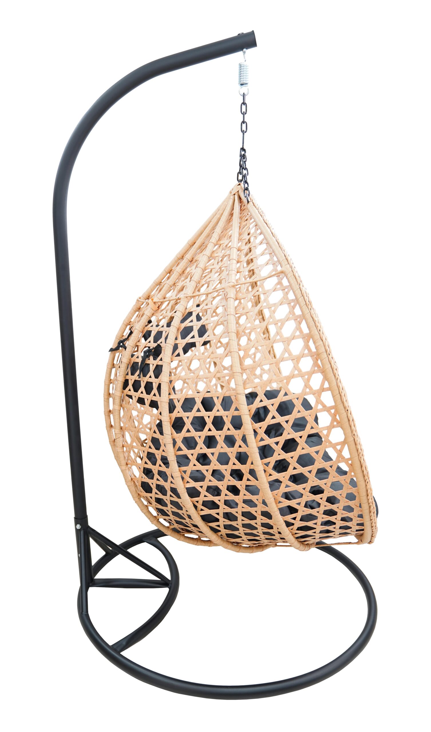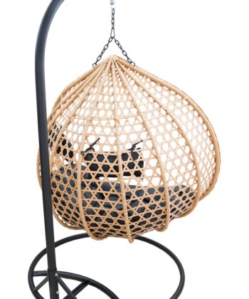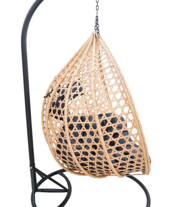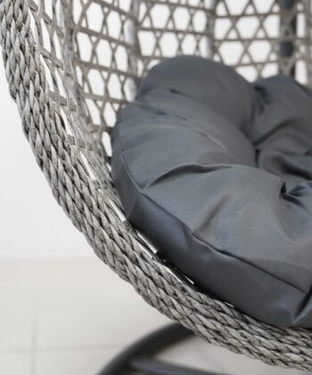 The spacious basket is suspended on a strong black metal stand, which ensures stability and safety during use. Soft outdoor cushions in black invite you to lounge for longer, read a book or enjoy a coffee in the fresh air. The set includes the stand, technorattan/PE basket and cushions, so the chair is ready to use after assembly.
