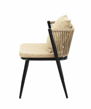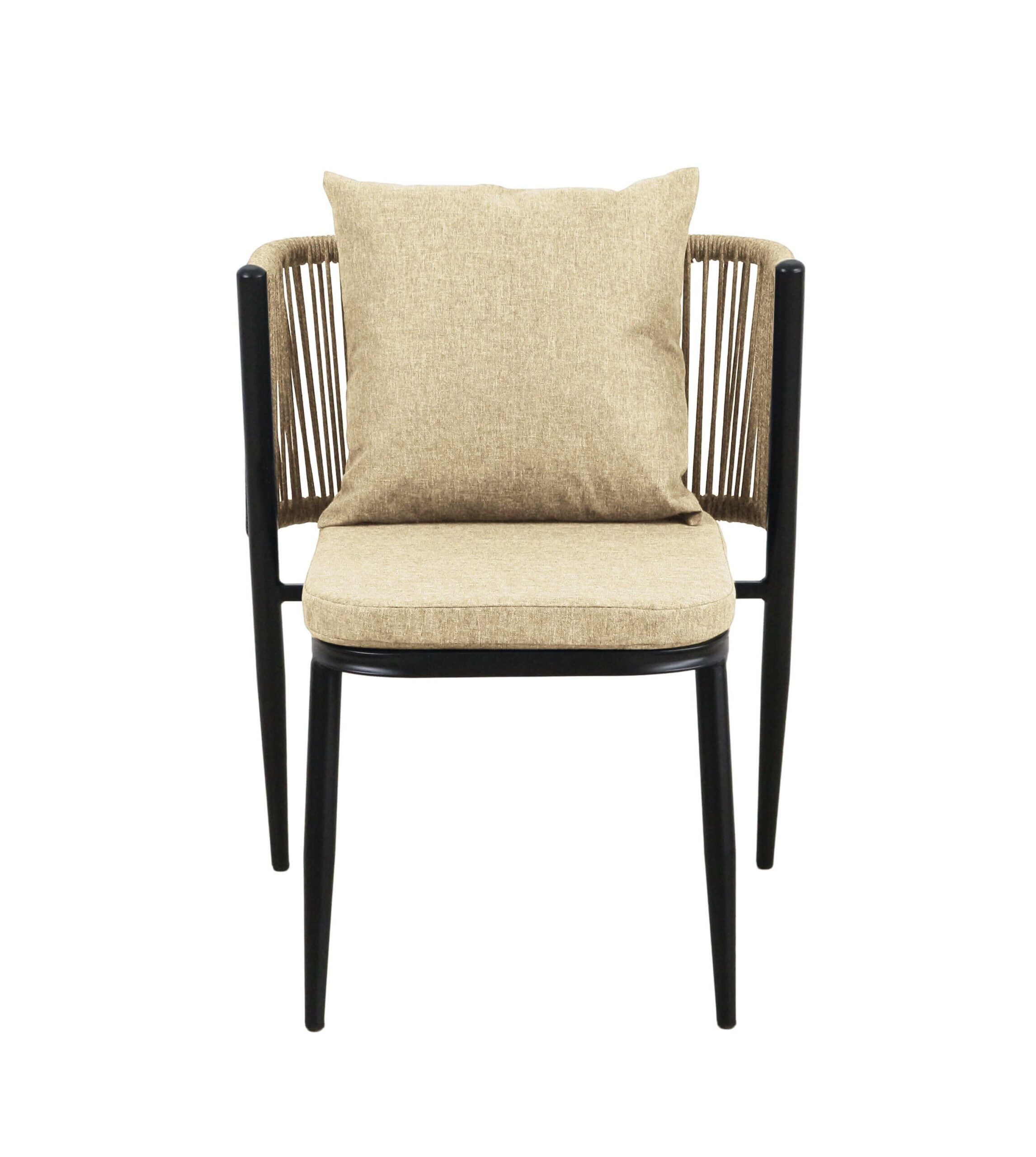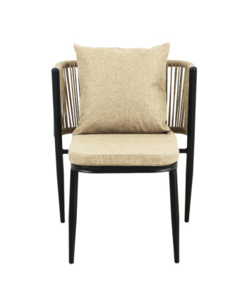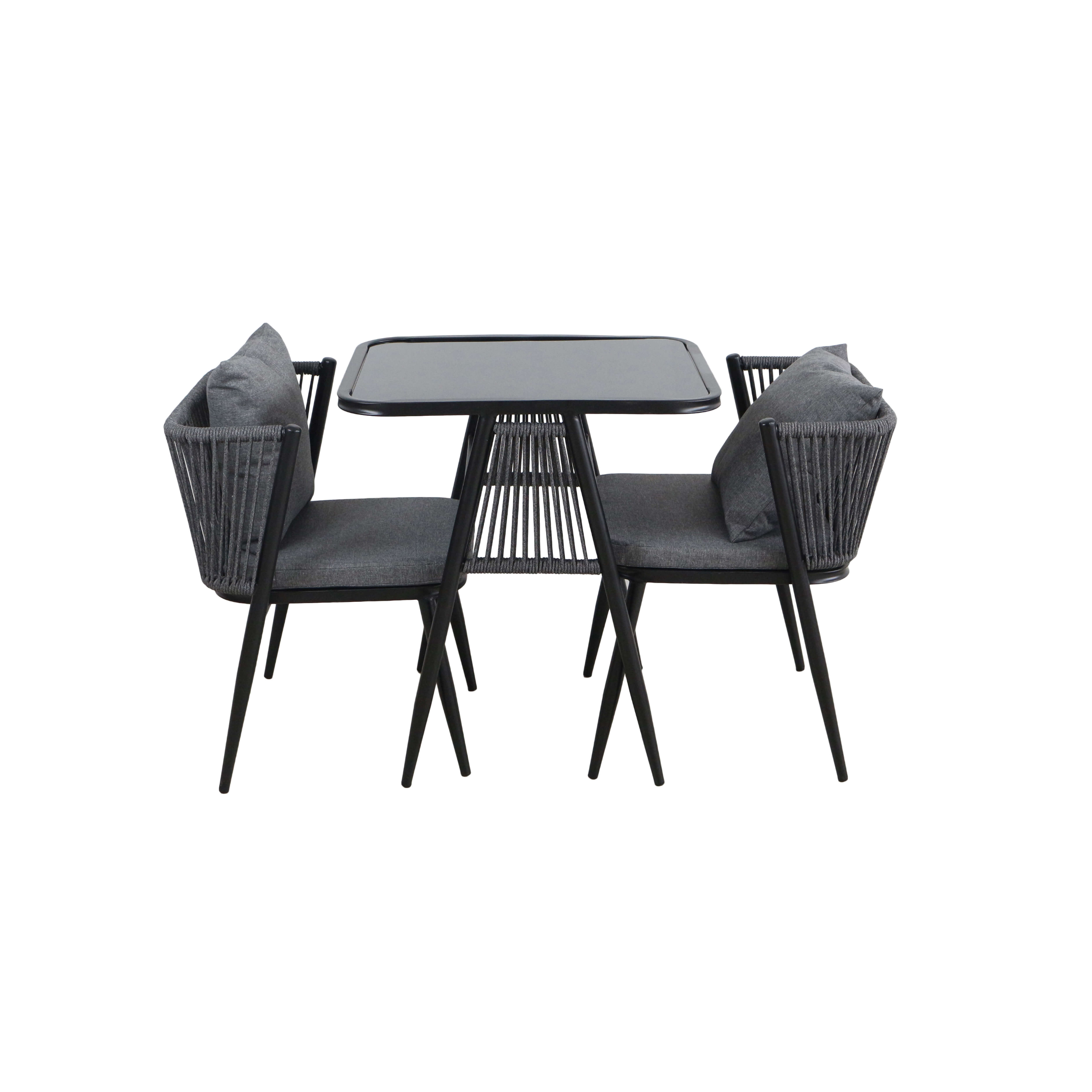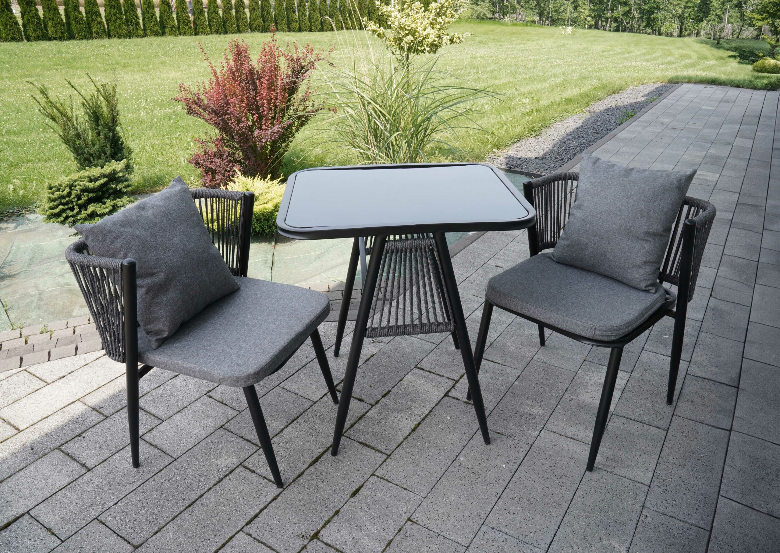 Korfu Coastal Patio Set features sturdy beige table (69.5×58.5x75cm) with two comfortable beige chairs (58x53x70.5cm, seat 50x45cm) on black frames – modern outdoor dining solution for patios, terraces and gardens with cushions and space-saving chair storage.