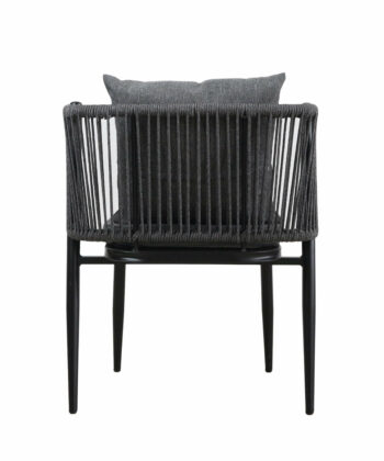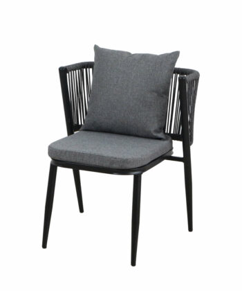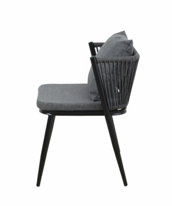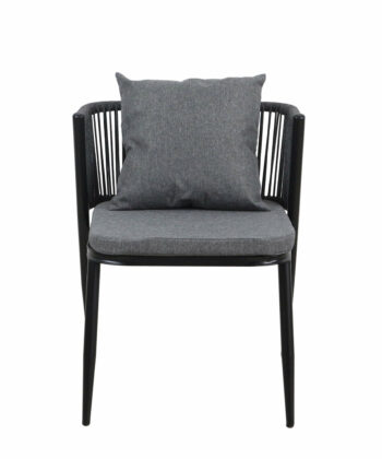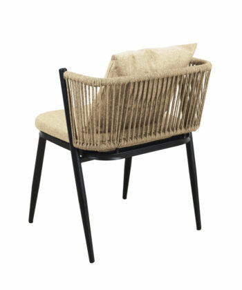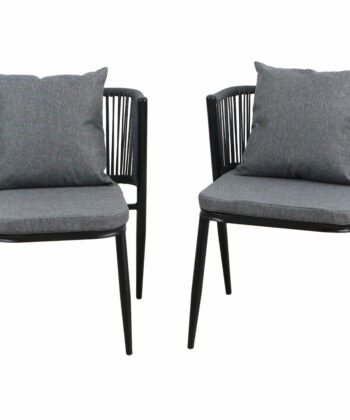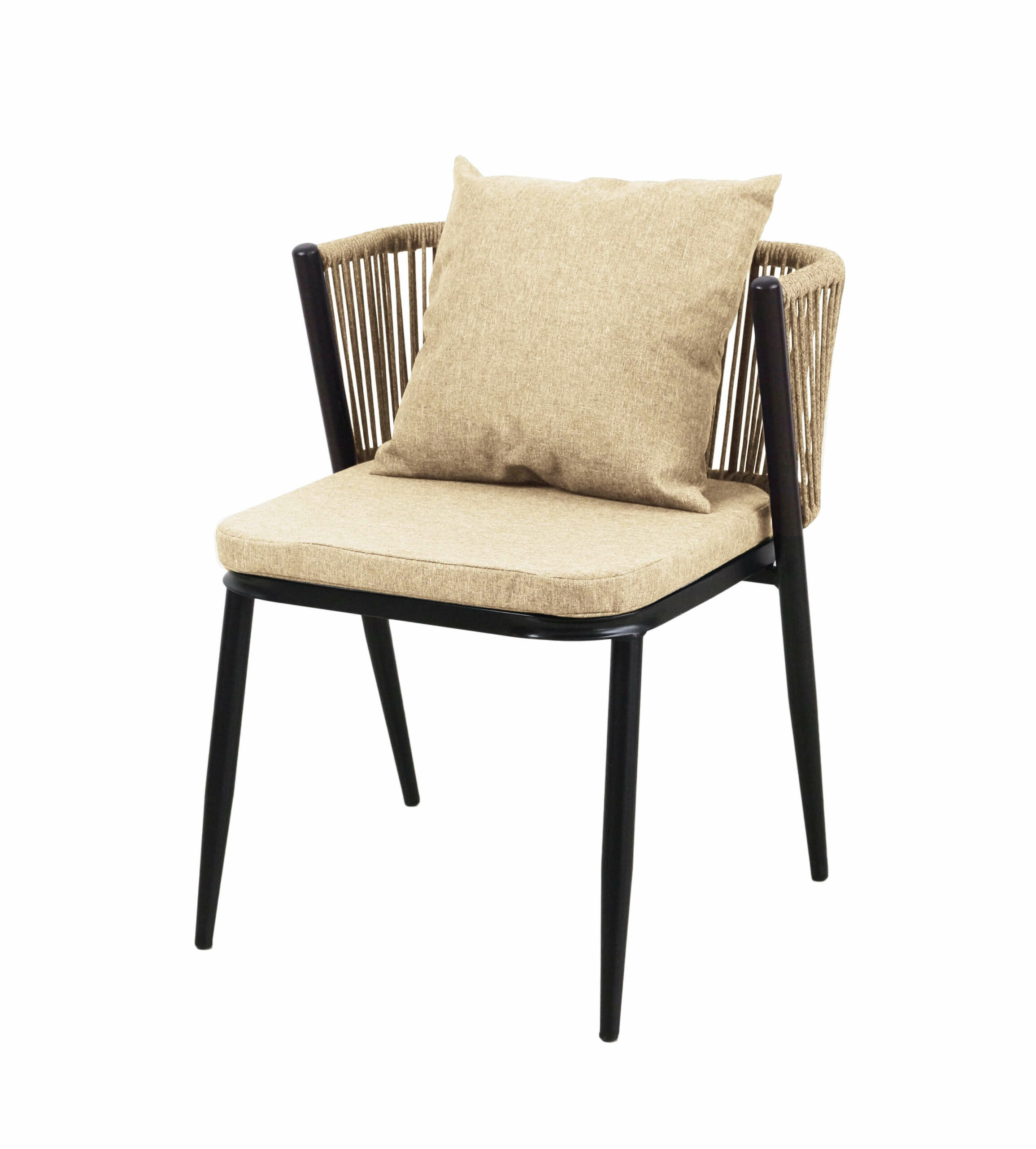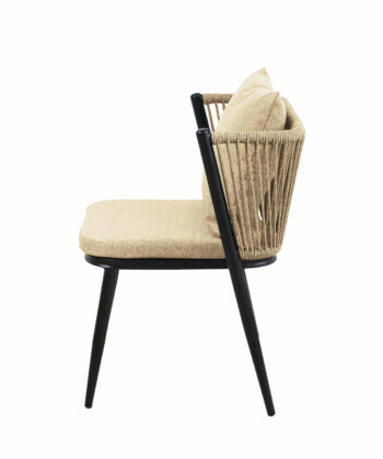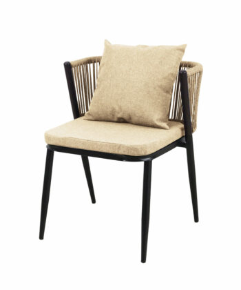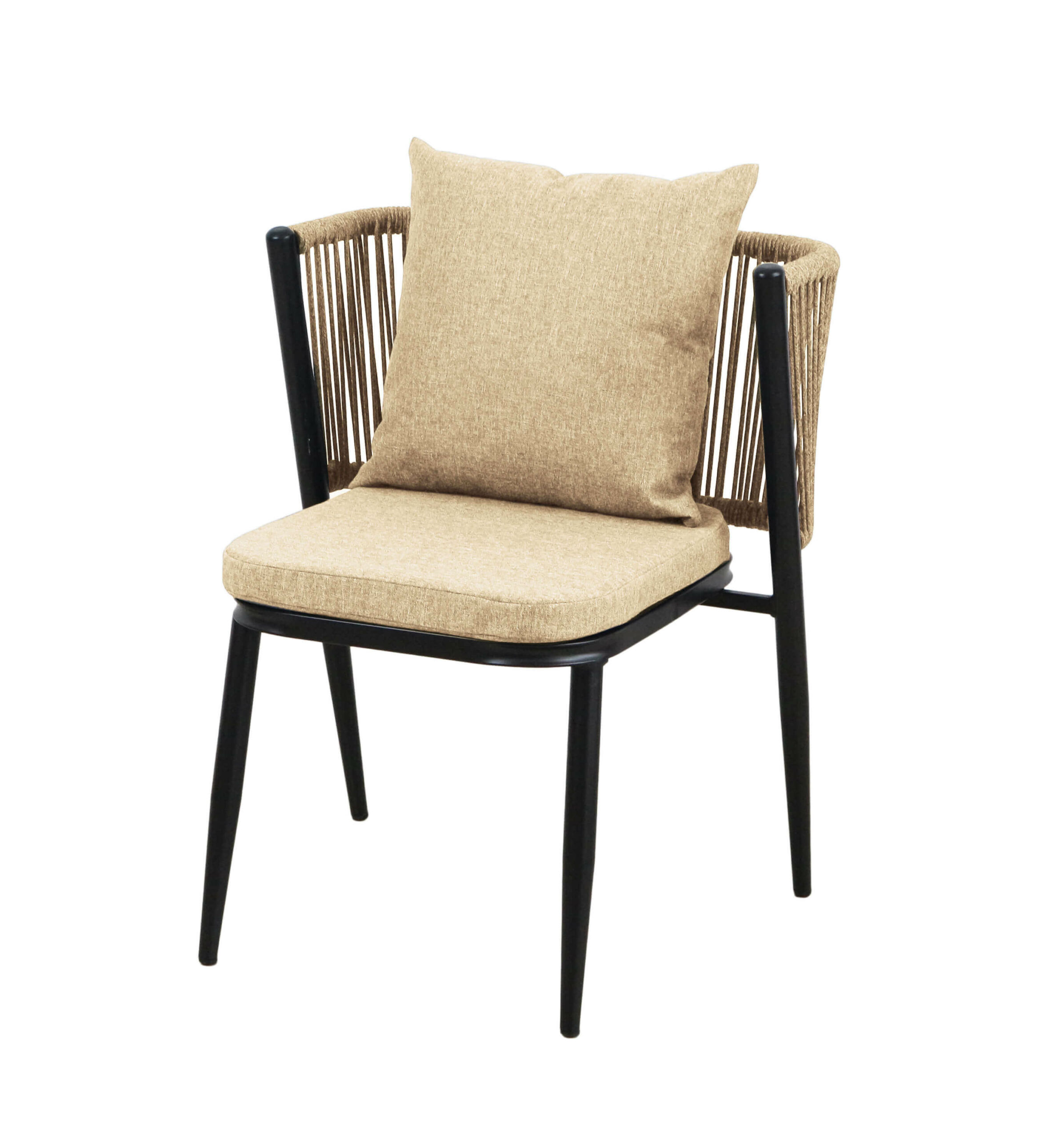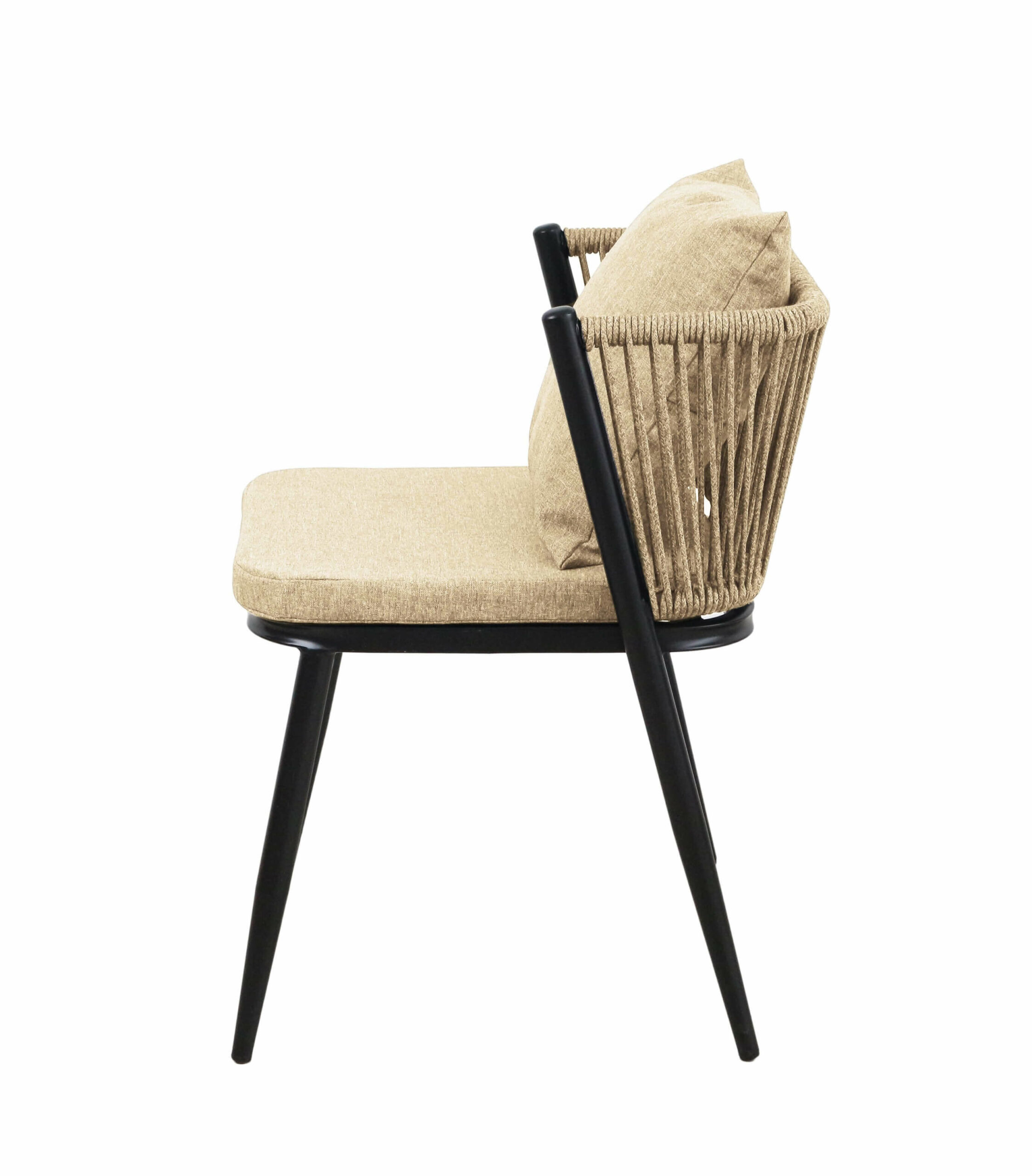 Korfu Coastal Patio Set features sturdy beige table (69.5×58.5x75cm) with two comfortable beige chairs (58x53x70.5cm, seat 50x45cm) on black frames – modern outdoor dining solution for patios, terraces and gardens with cushions and space-saving chair storage.