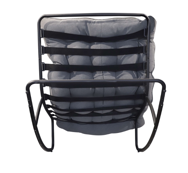 The strong metal frame in black ensures stability and durability for years of use. The wide, grey outdoor fabric cushion provides a soft and supportive seat, increasing comfort while reading, napping, or simply enjoying quiet time. Thanks to its well‑profiled construction, the chair offers a natural, ergonomic position that helps the body relax.