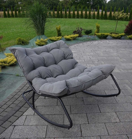 Model: Meksyk Type: Rocking chair Frame material: Metal Frame colour: Black Upholstery type: Outdoor fabric Fabric colour: Grey Width: 80 cm Depth: 120 cm Height: 68 cm Footrest: No