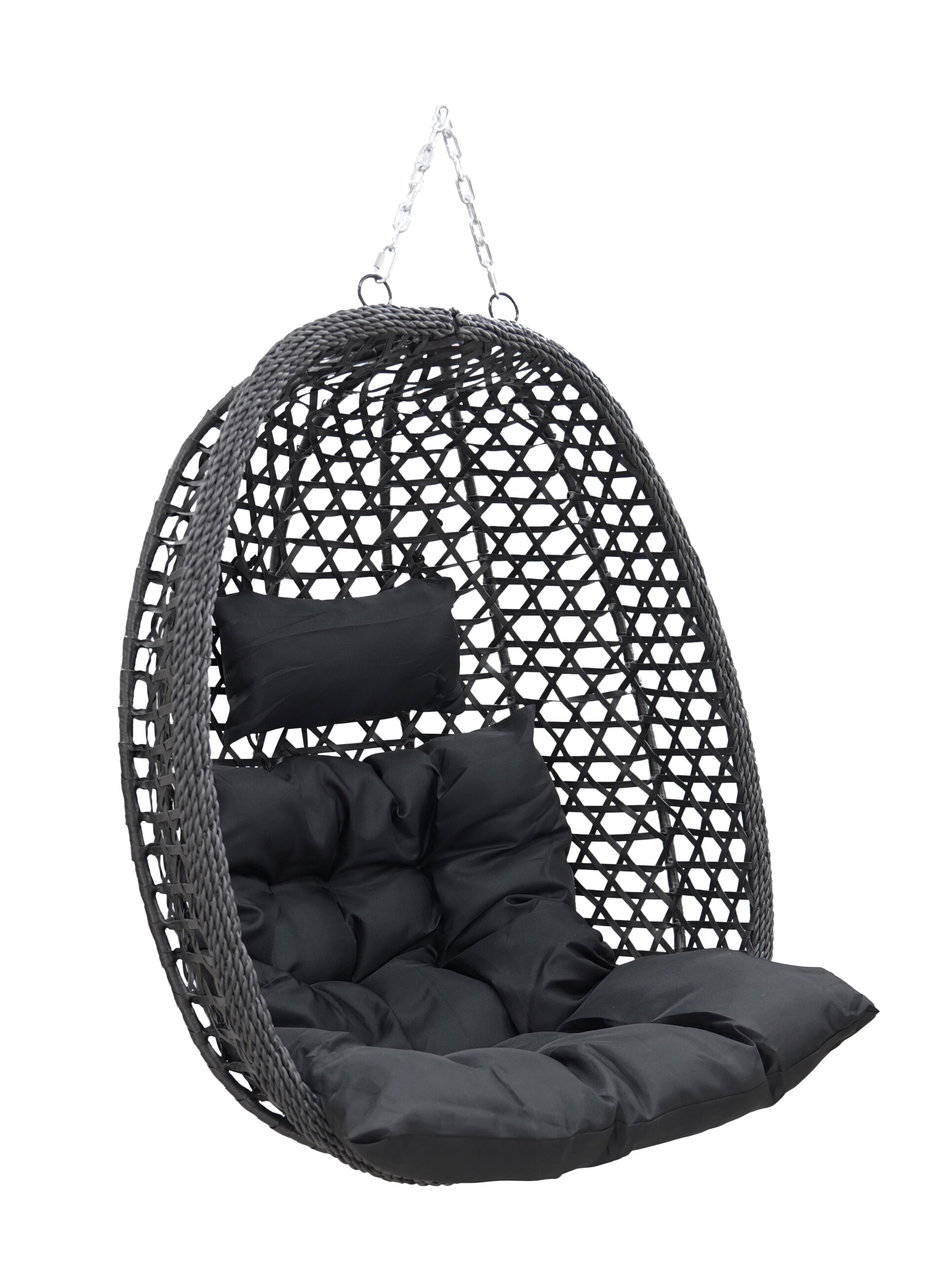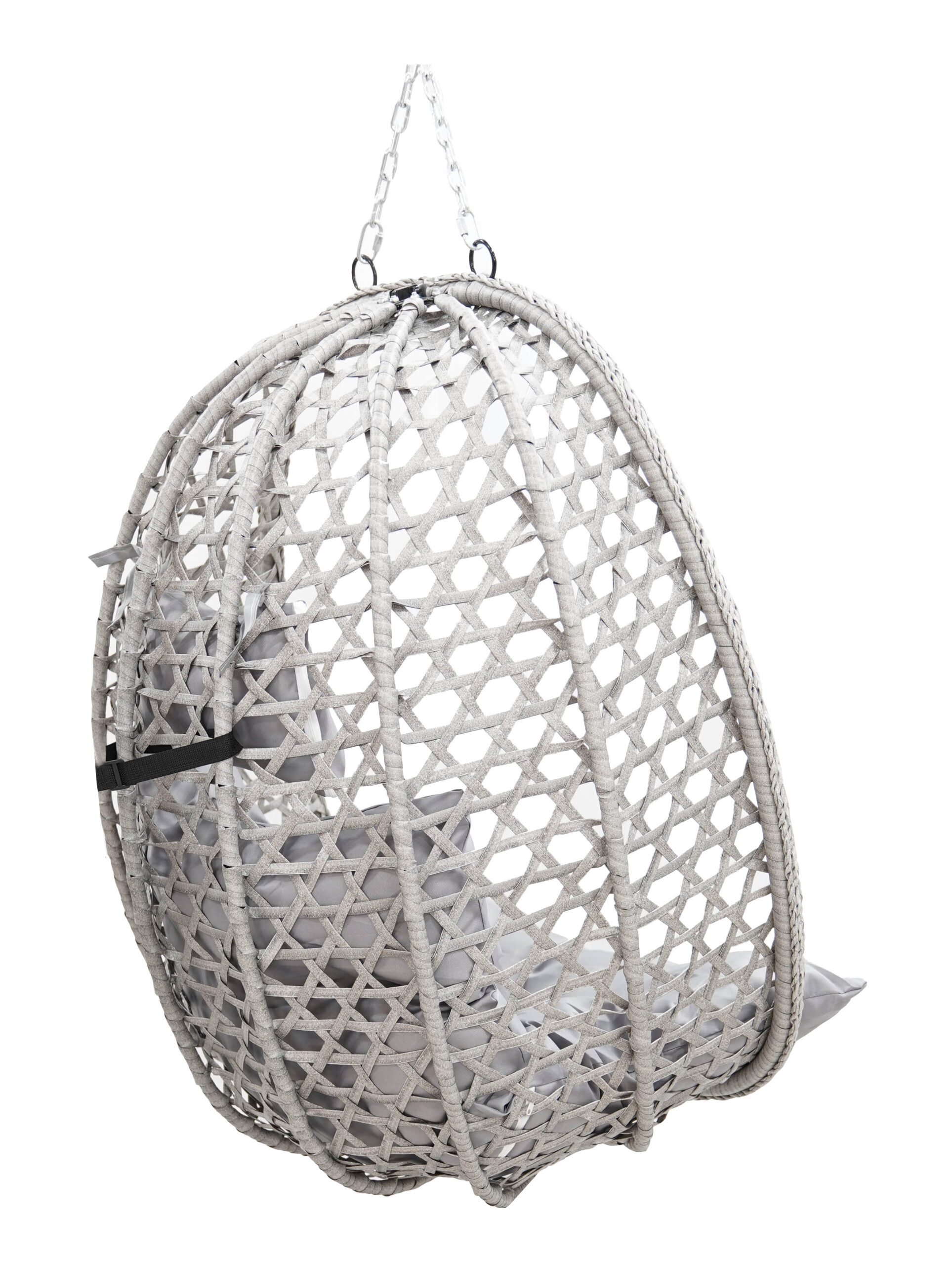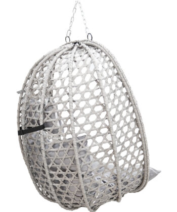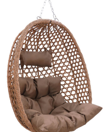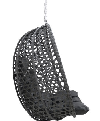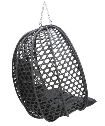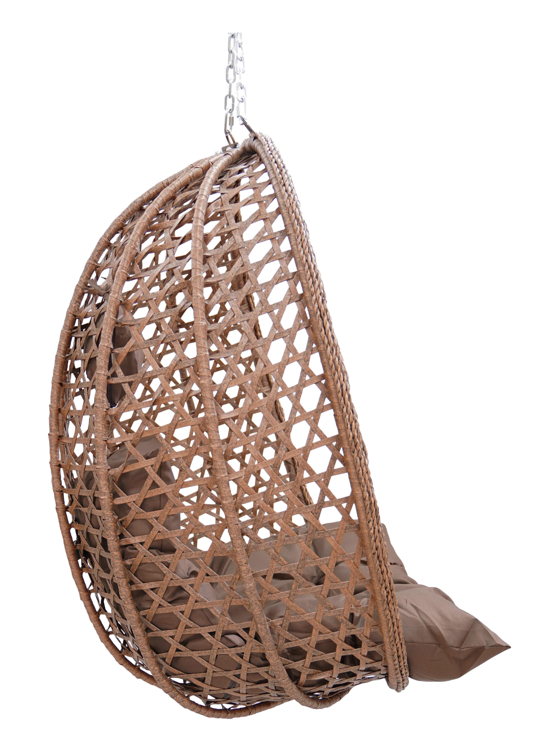 The Oris hanging cocoon chair is a comfortable outdoor seat designed for relaxation on balconies, terraces, and in gardens. Its natural PE rattan basket creates a soft, organic look, while the included black outdoor cushions add comfort and support. The compact size makes this hanging chair easy to place in many different spaces.