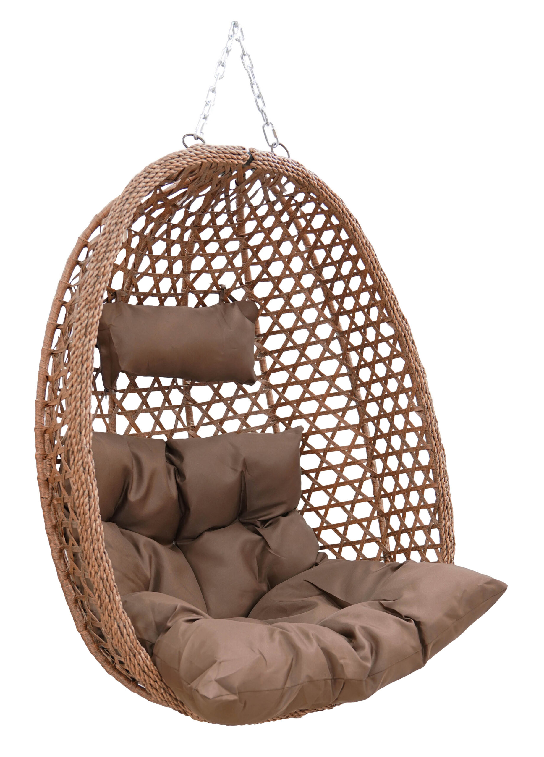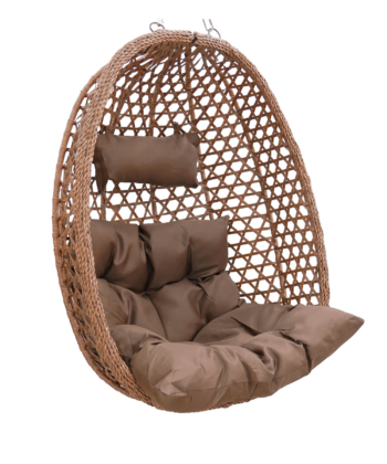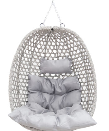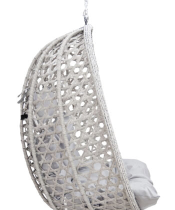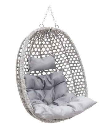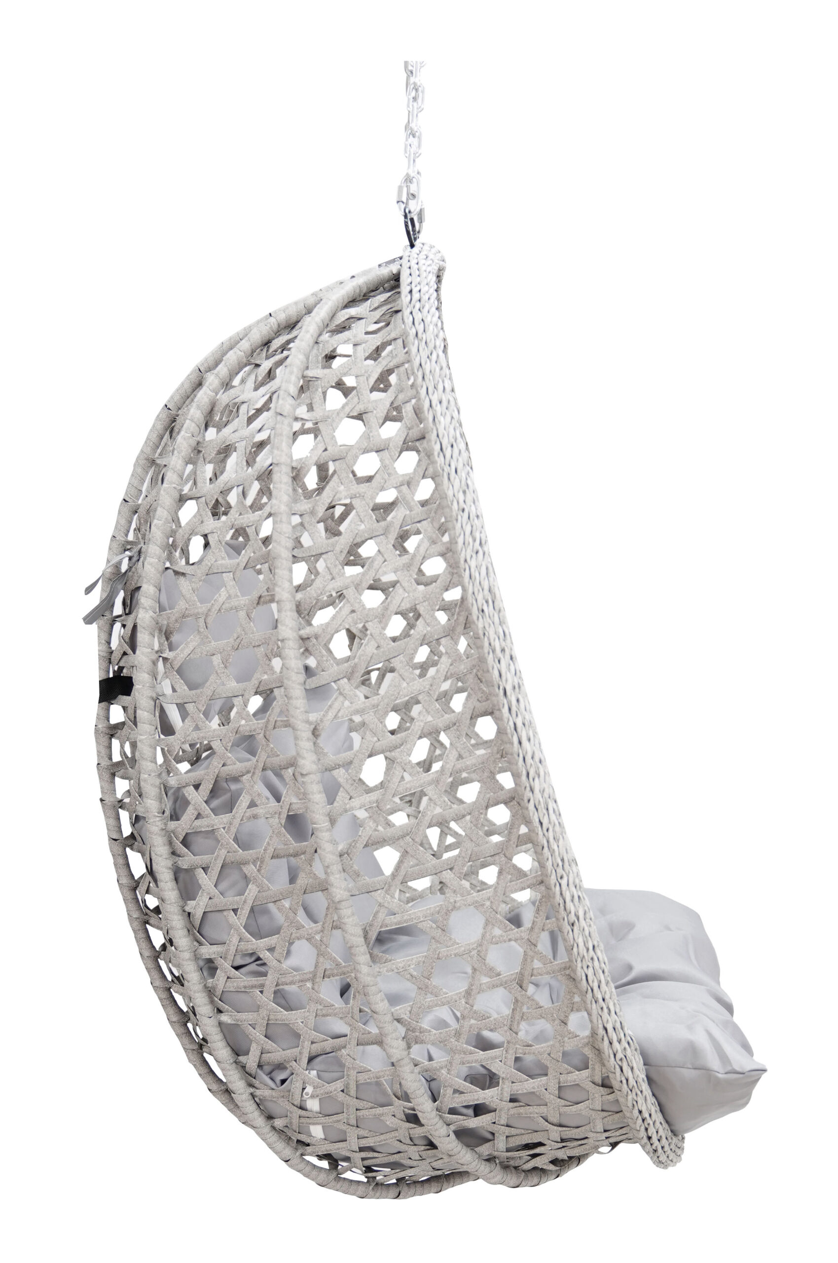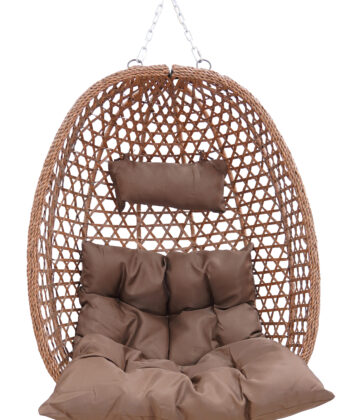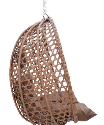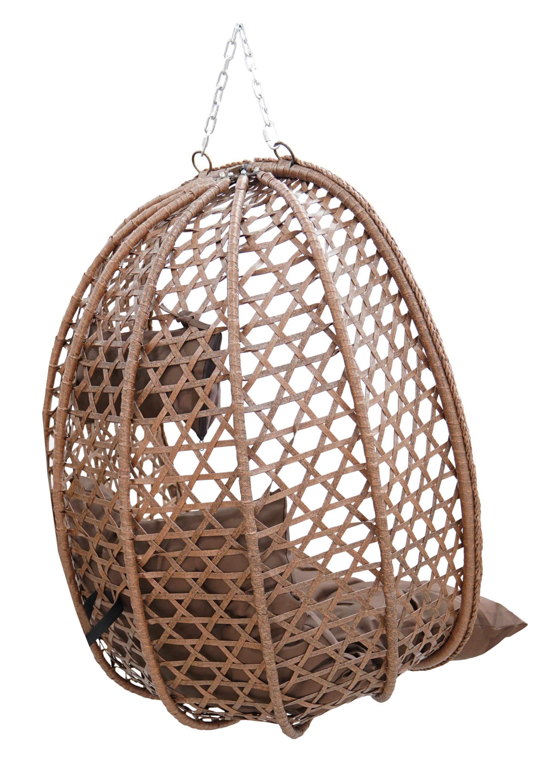 The Oris hanging cocoon chair is a comfortable outdoor seat designed for relaxation on balconies, terraces, and in gardens. Its natural PE rattan basket creates a soft, organic look, while the included black outdoor cushions add comfort and support. The compact size makes this hanging chair easy to place in many different spaces.