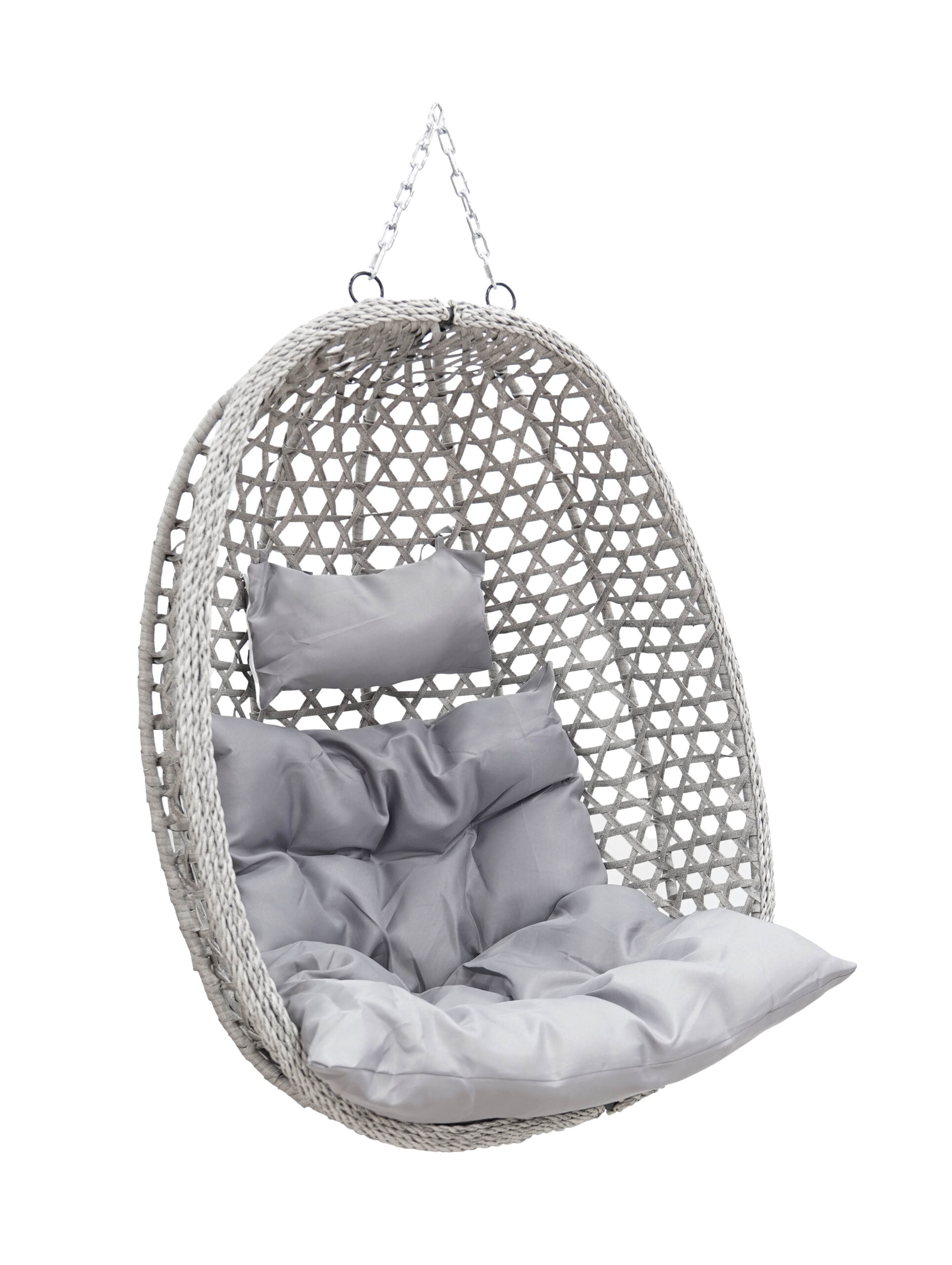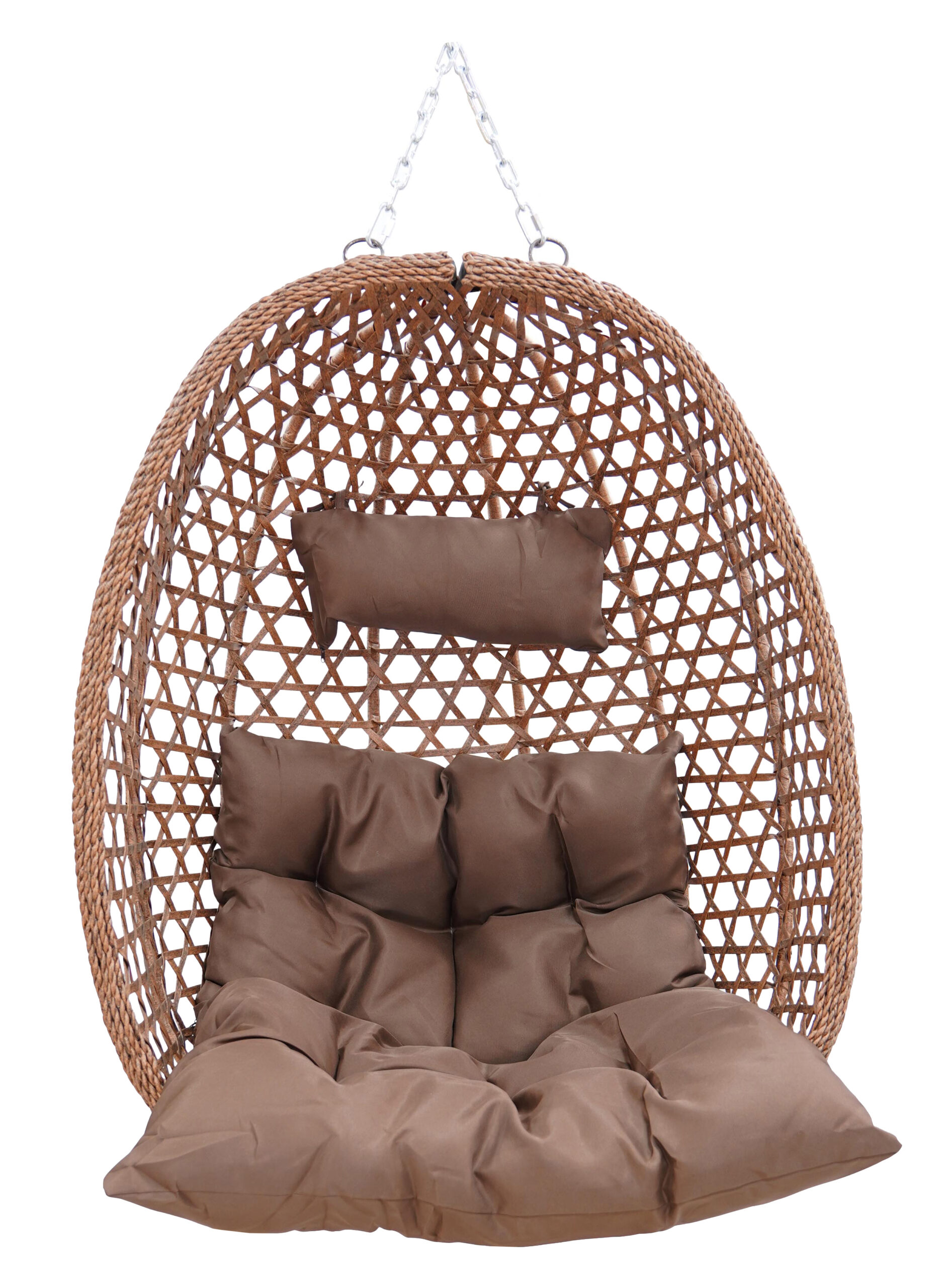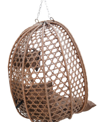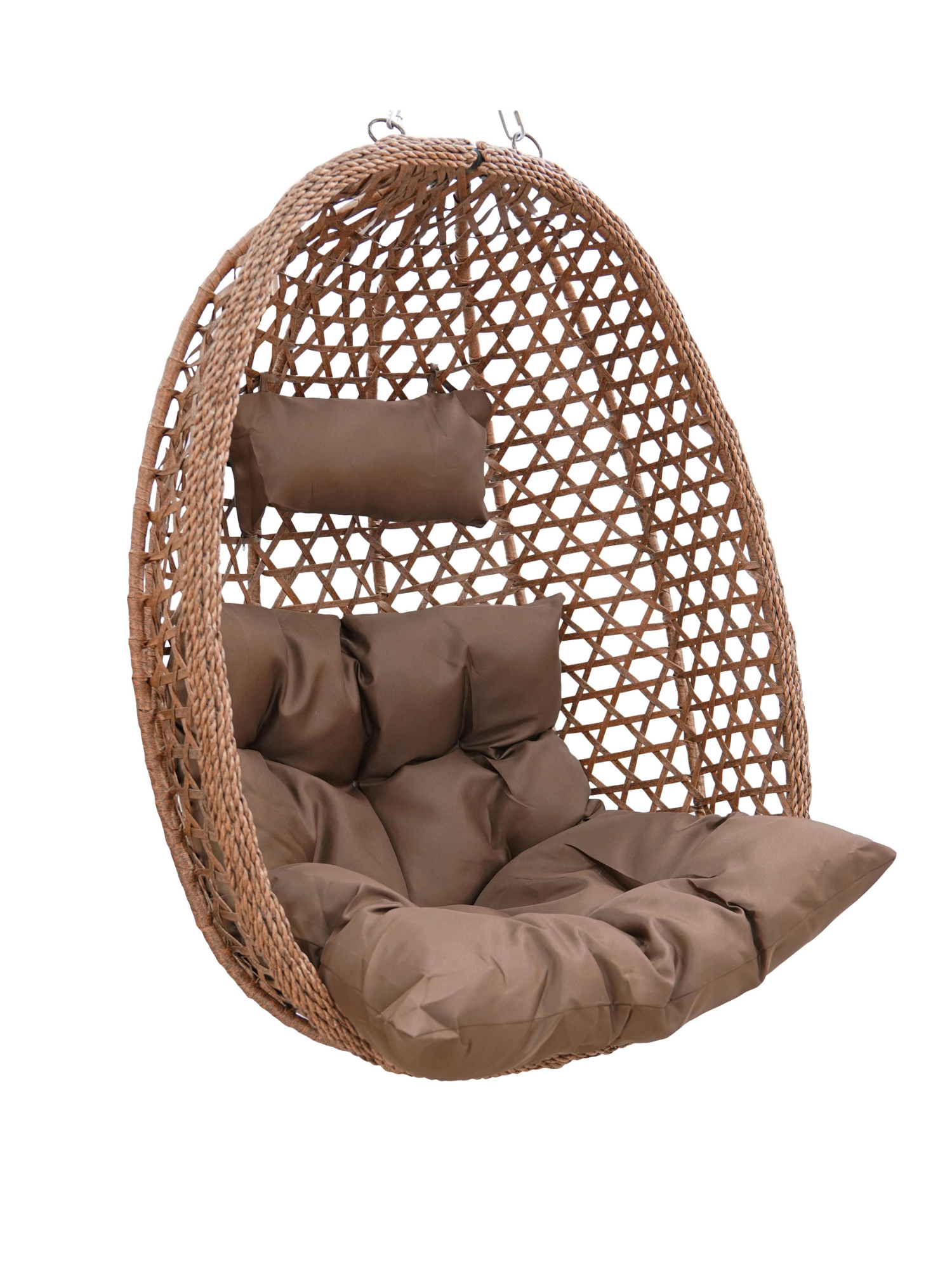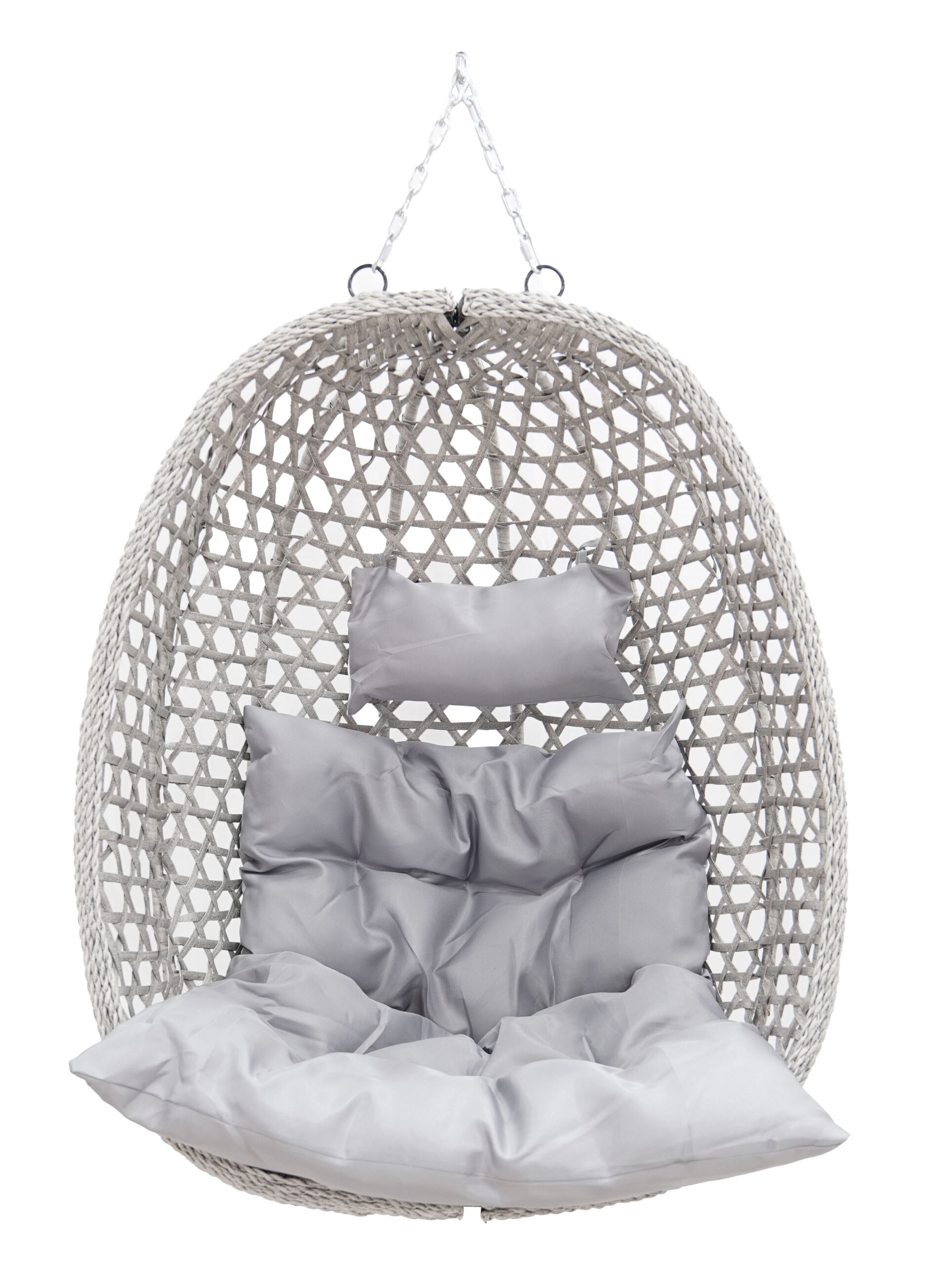 The Oris hanging cocoon chair is a comfortable outdoor seat designed for relaxation on balconies, terraces, and in gardens. Its natural PE rattan basket creates a soft, organic look, while the included black outdoor cushions add comfort and support. The compact size makes this hanging chair easy to place in many different spaces.