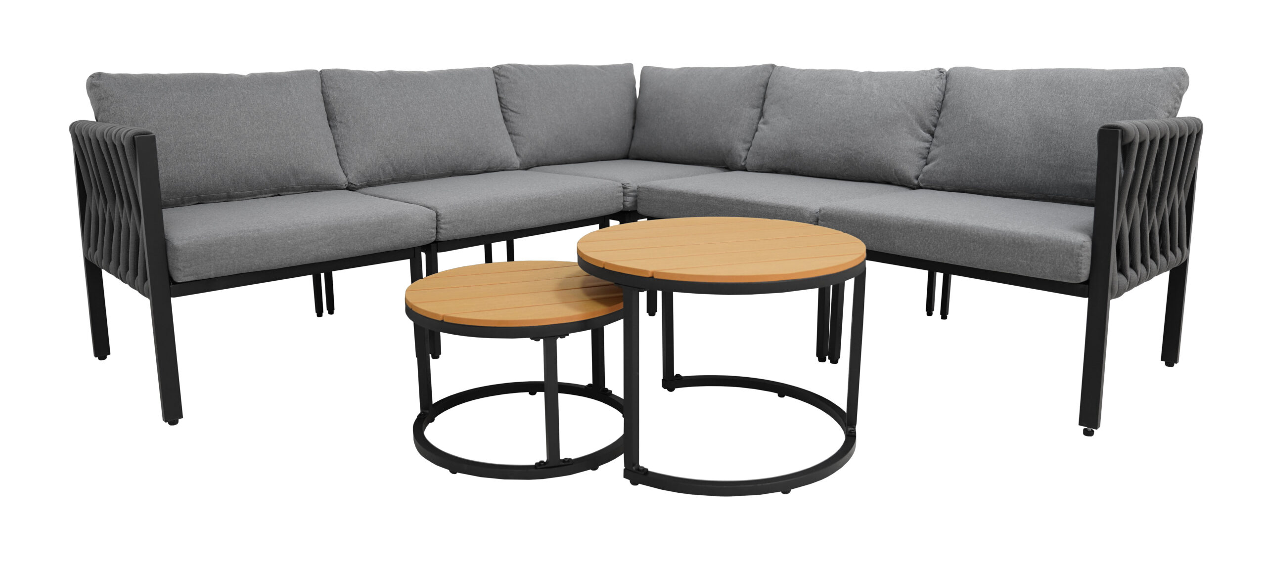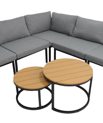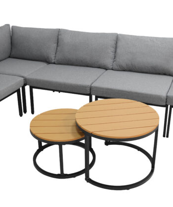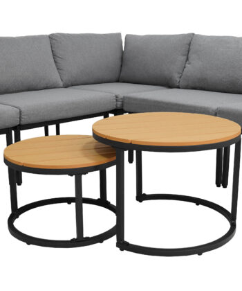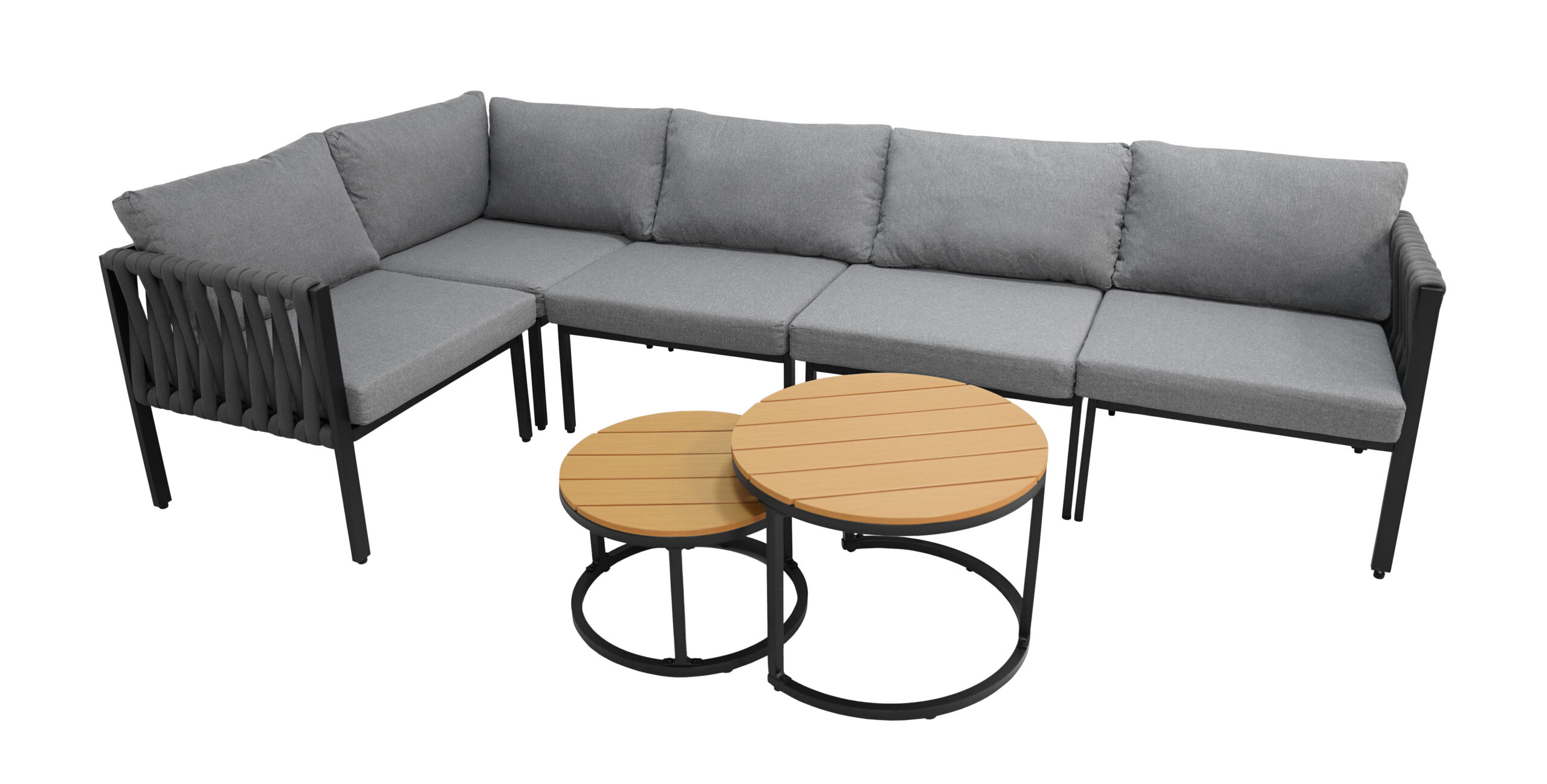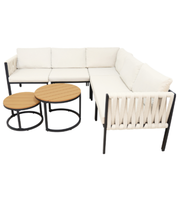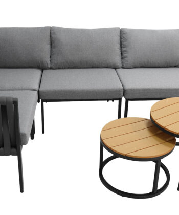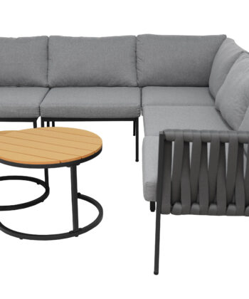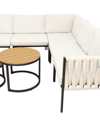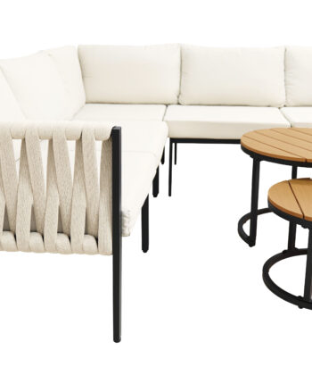 The Rodos modular garden corner set is ideal for social moments in the open air. Its wide seating area fits several people comfortably, making it perfect for chatting, coffee breaks, or light meals outdoors. In addition, the two round coffee tables provide handy surfaces for drinks, snacks, and small accessories. Because of this layout, the set turns any terrace or patio into a welcoming relaxation zone.