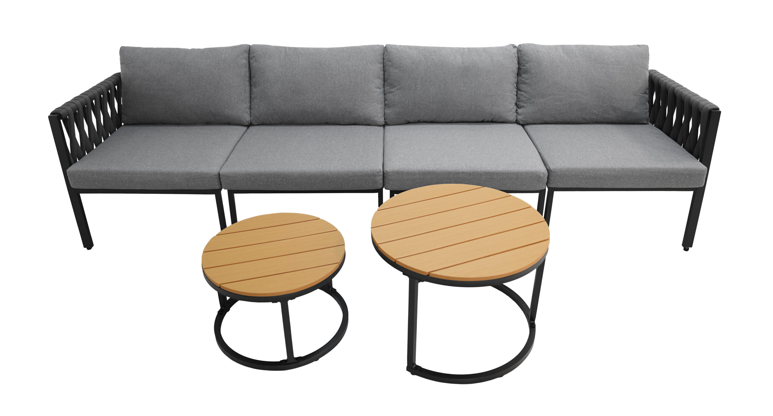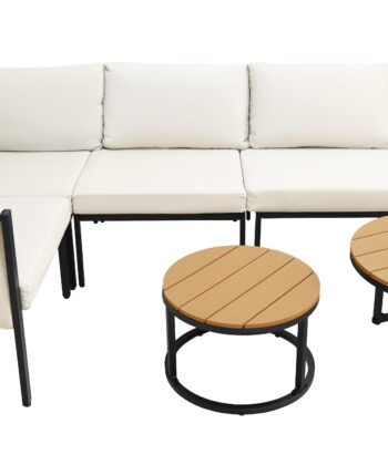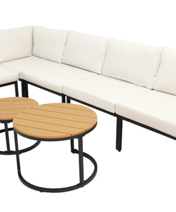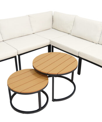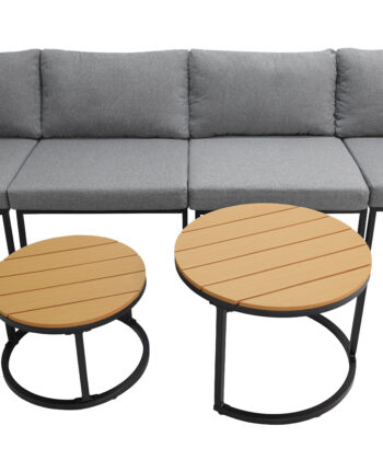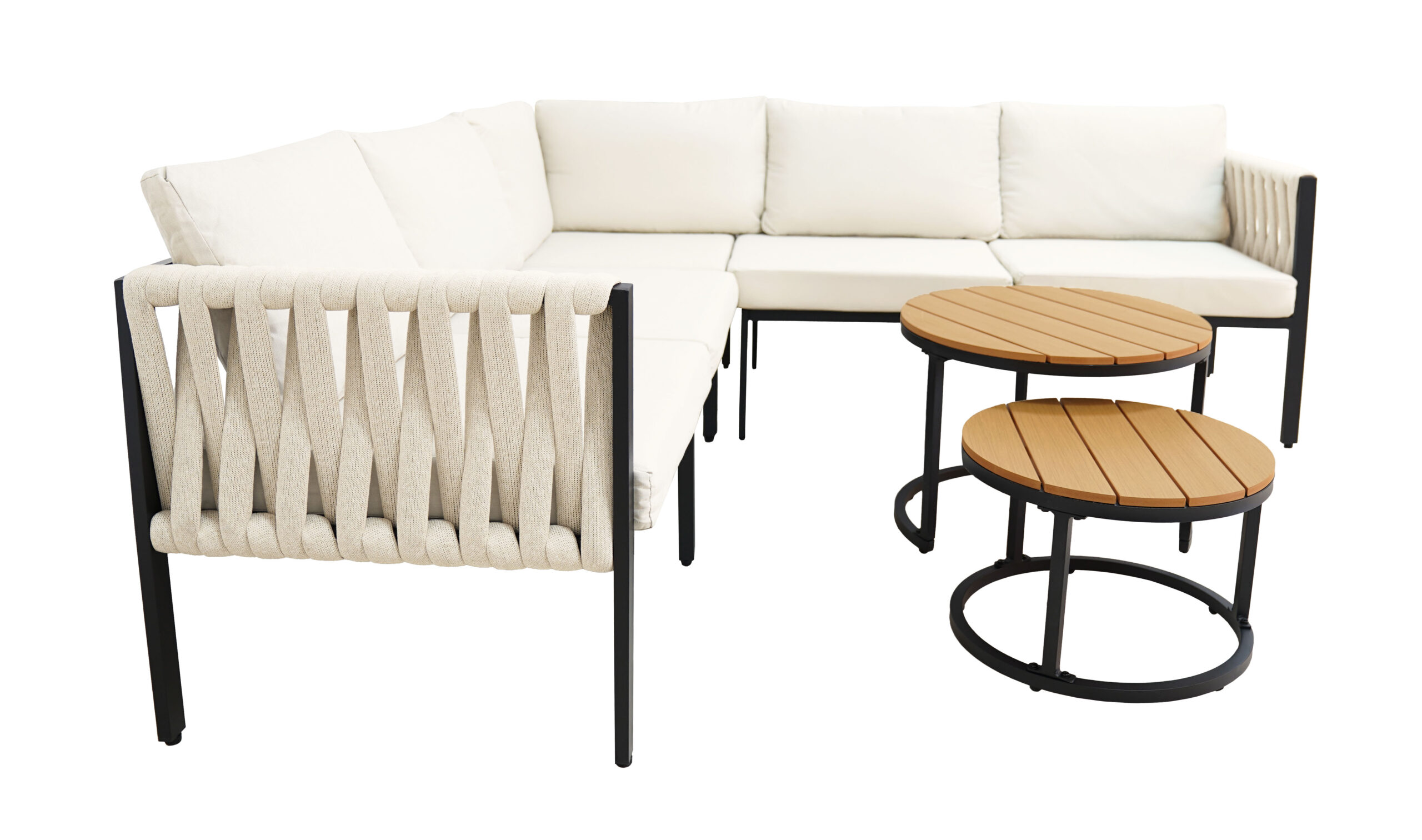 The Rodos modular garden corner set is ideal for social moments in the open air. Its wide seating area fits several people comfortably, making it perfect for chatting, coffee breaks, or light meals outdoors. In addition, the two round coffee tables provide handy surfaces for drinks, snacks, and small accessories. Because of this layout, the set turns any terrace or patio into a welcoming relaxation zone.