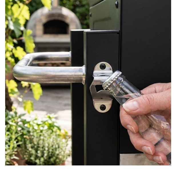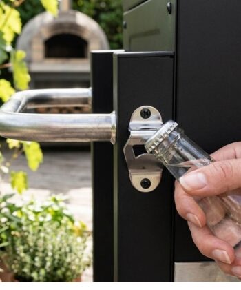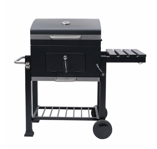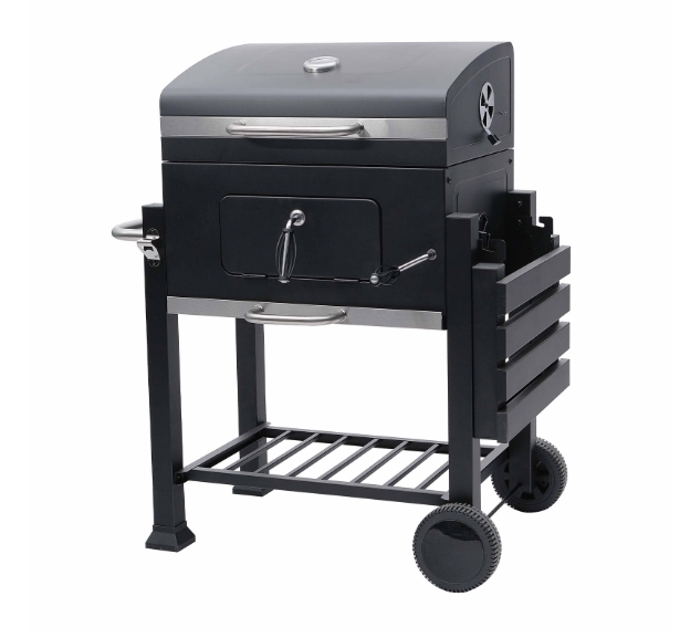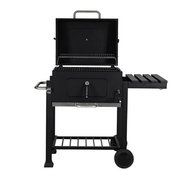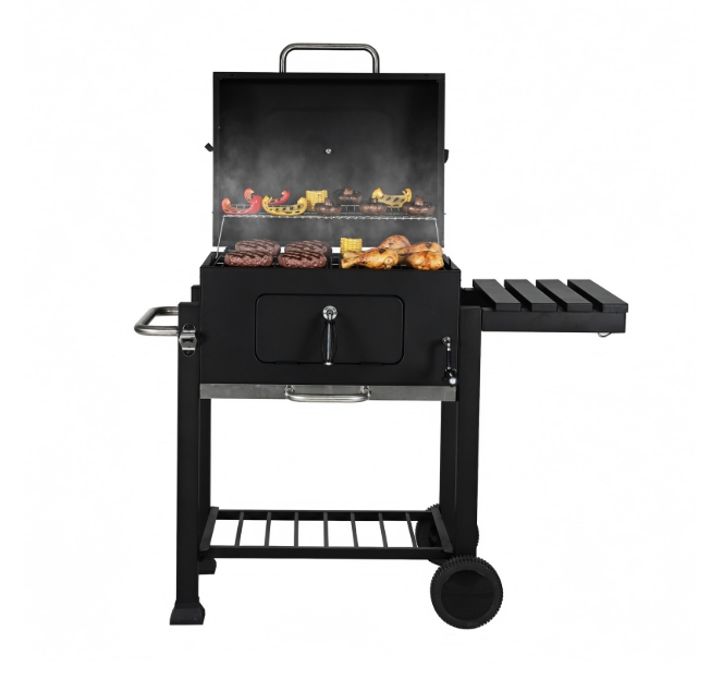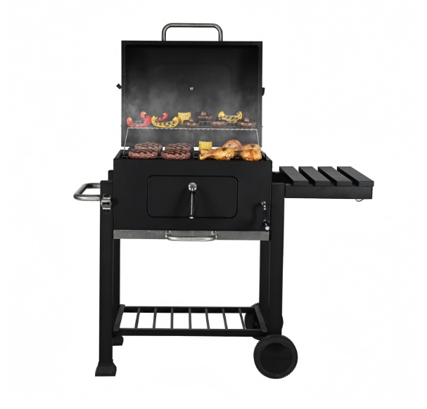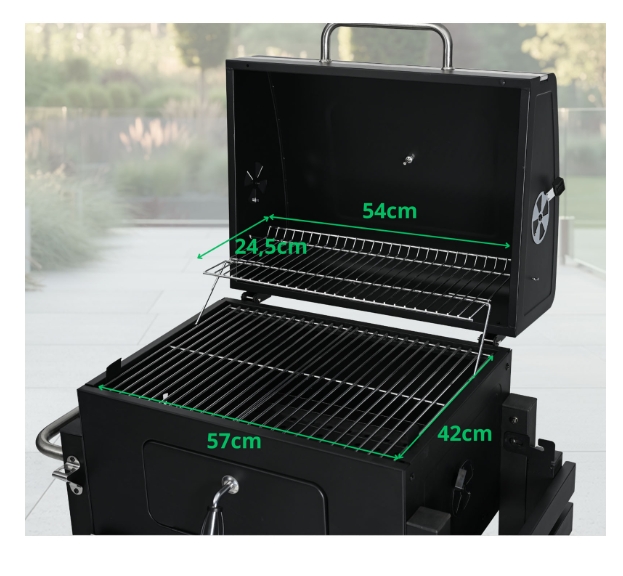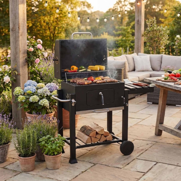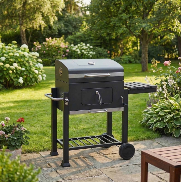 The folding side shelf provides extra space for food, tools, or seasoning, while the stainless steel handles make the grill easier and safer to use. Two transport wheels also help you move the grill around the garden or patio without difficulty. Furthermore, the integrated bottle opener adds a social and practical touch that fits well with outdoor entertaining.