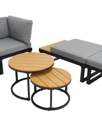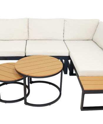 Thick seat and back cushions add softness and support, turning the Tola corner into a true relaxation zone. The grey wood‑like finish gives the set a warm, natural look, yet it also blends with neutral and industrial interiors. Moreover, the two coffee tables provide convenient surfaces for drinks, snacks, and small accessories.