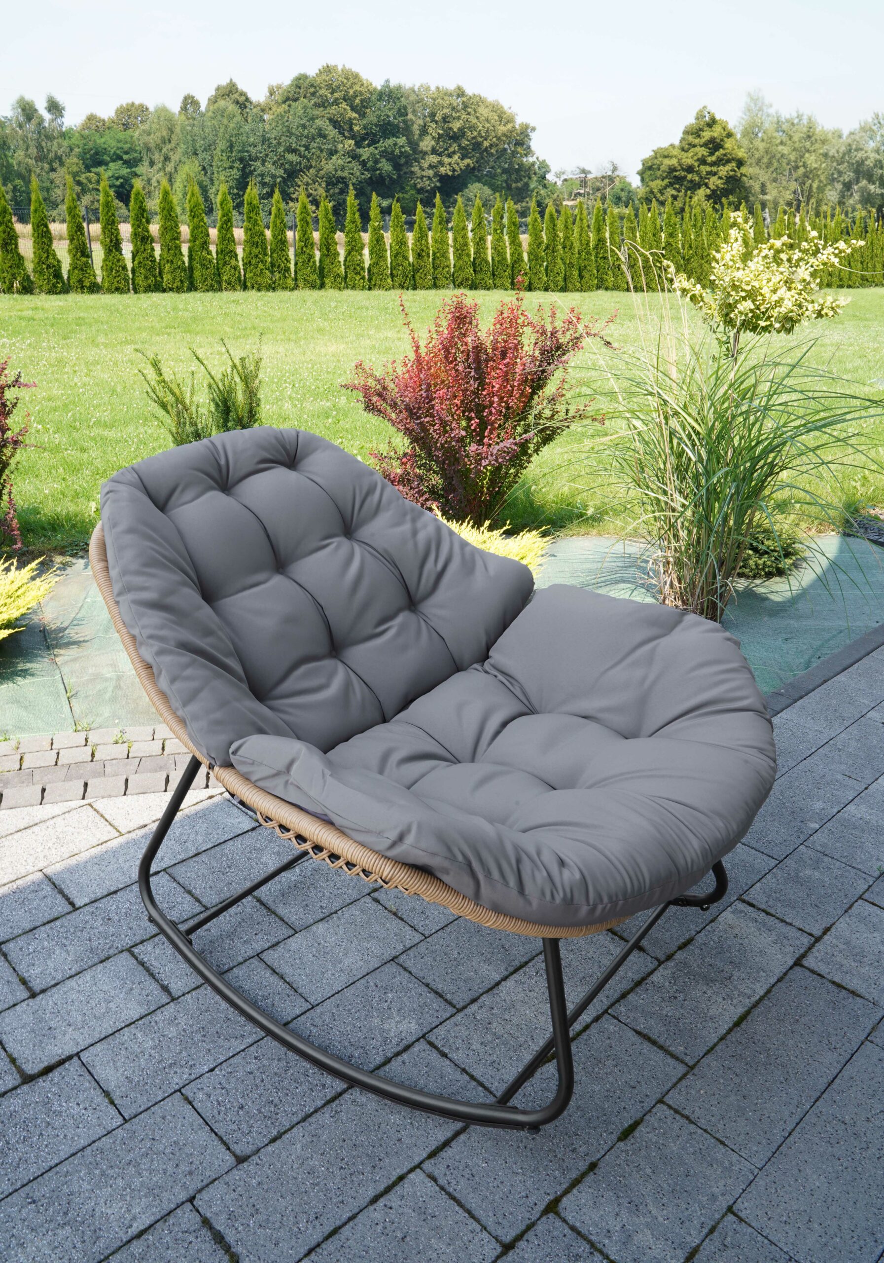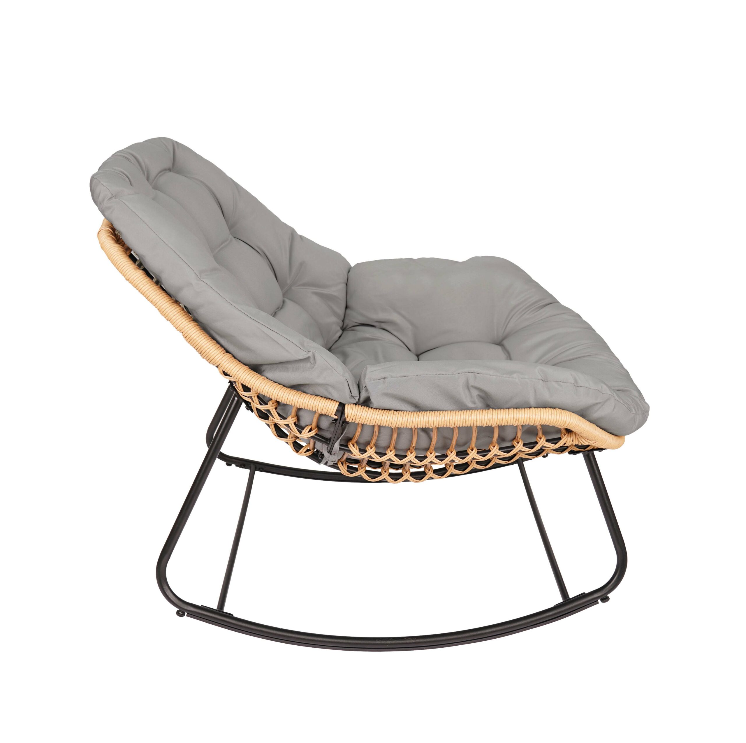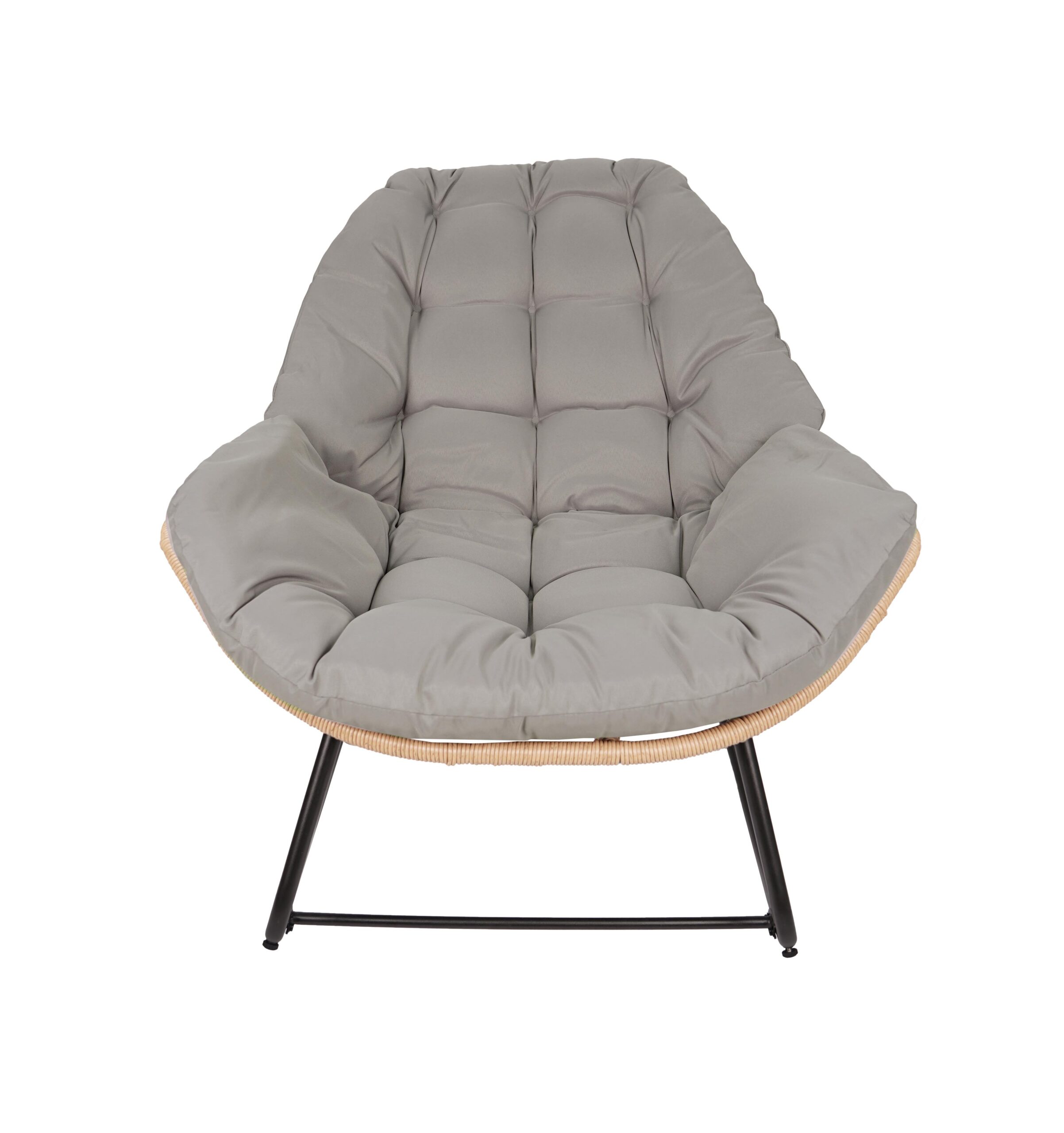 The black metal frame ensures solid stability. In addition, natural technorattan seat looks stylish. The beige outdoor fabric feels comfortable. As a result, you enjoy long relaxation sessions. Therefore, it becomes your favorite spot.