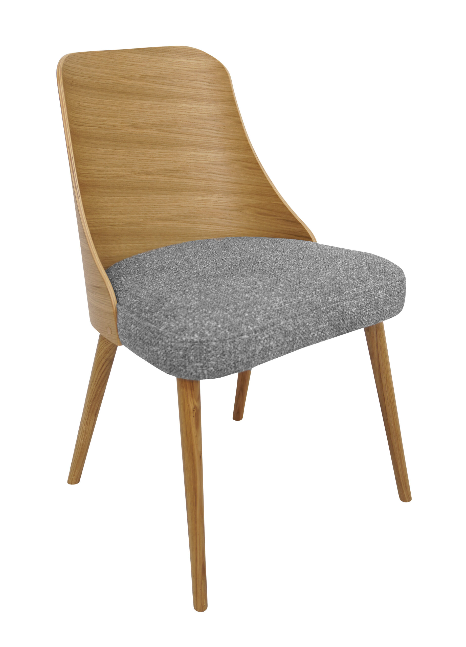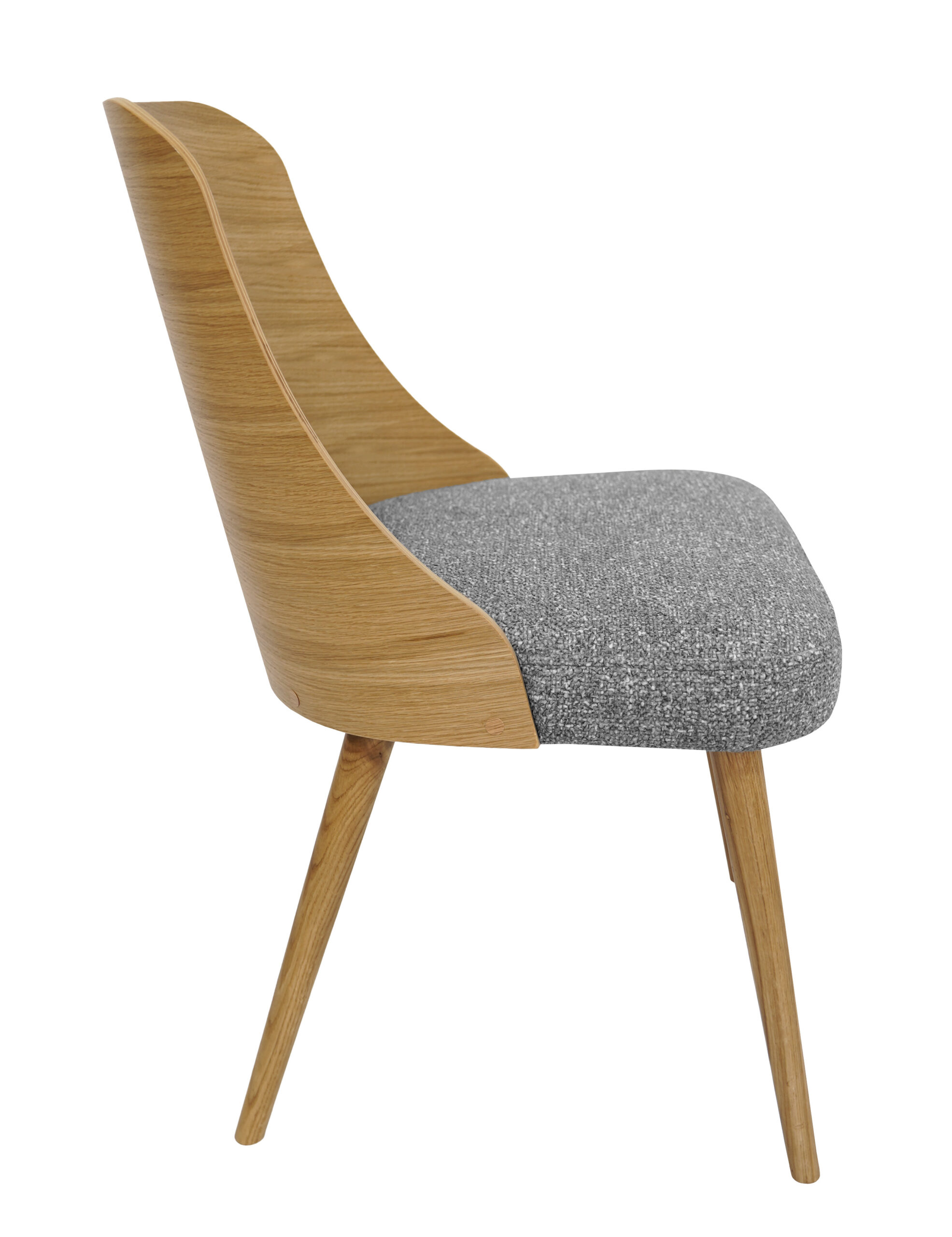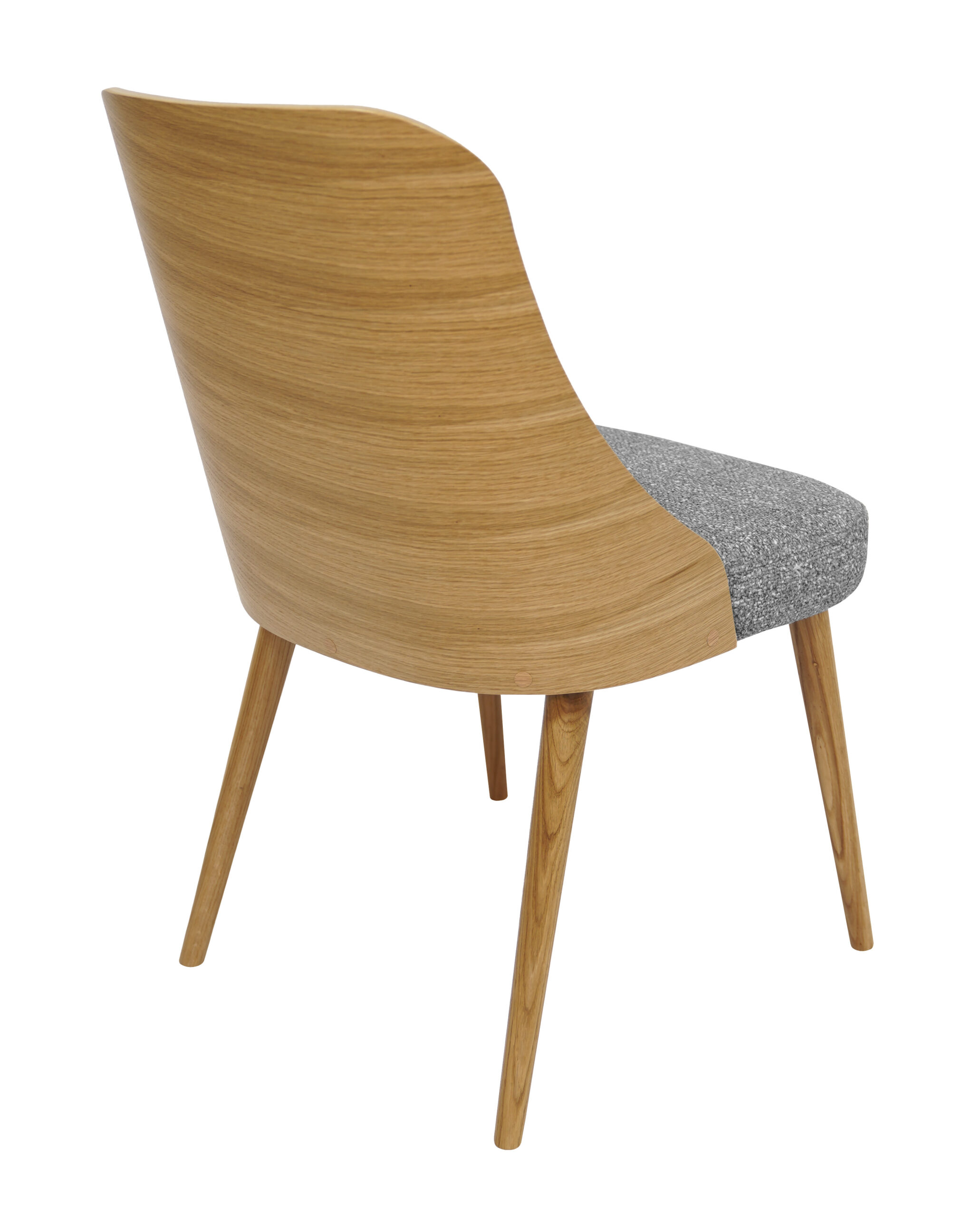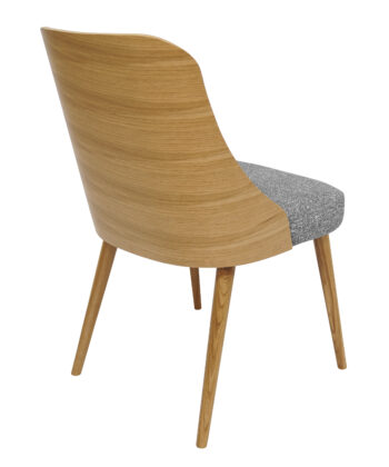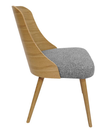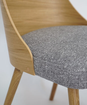 The backrest is formed from a single flowing element that gently wraps around the back, giving stable and comfortable support. A softly padded grey chenille seat makes long meals, work sessions or reading at the table much more pleasant. This combination of simple design and comfort makes the chair suitable for homes and commercial interiors.