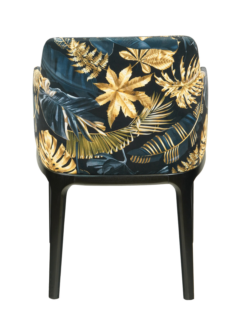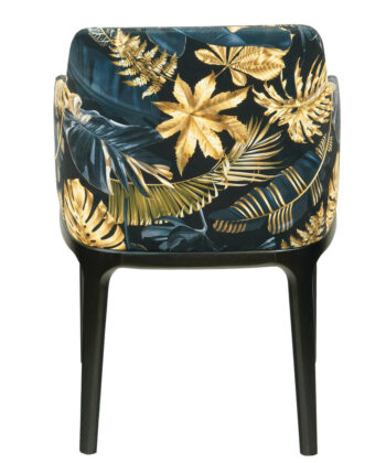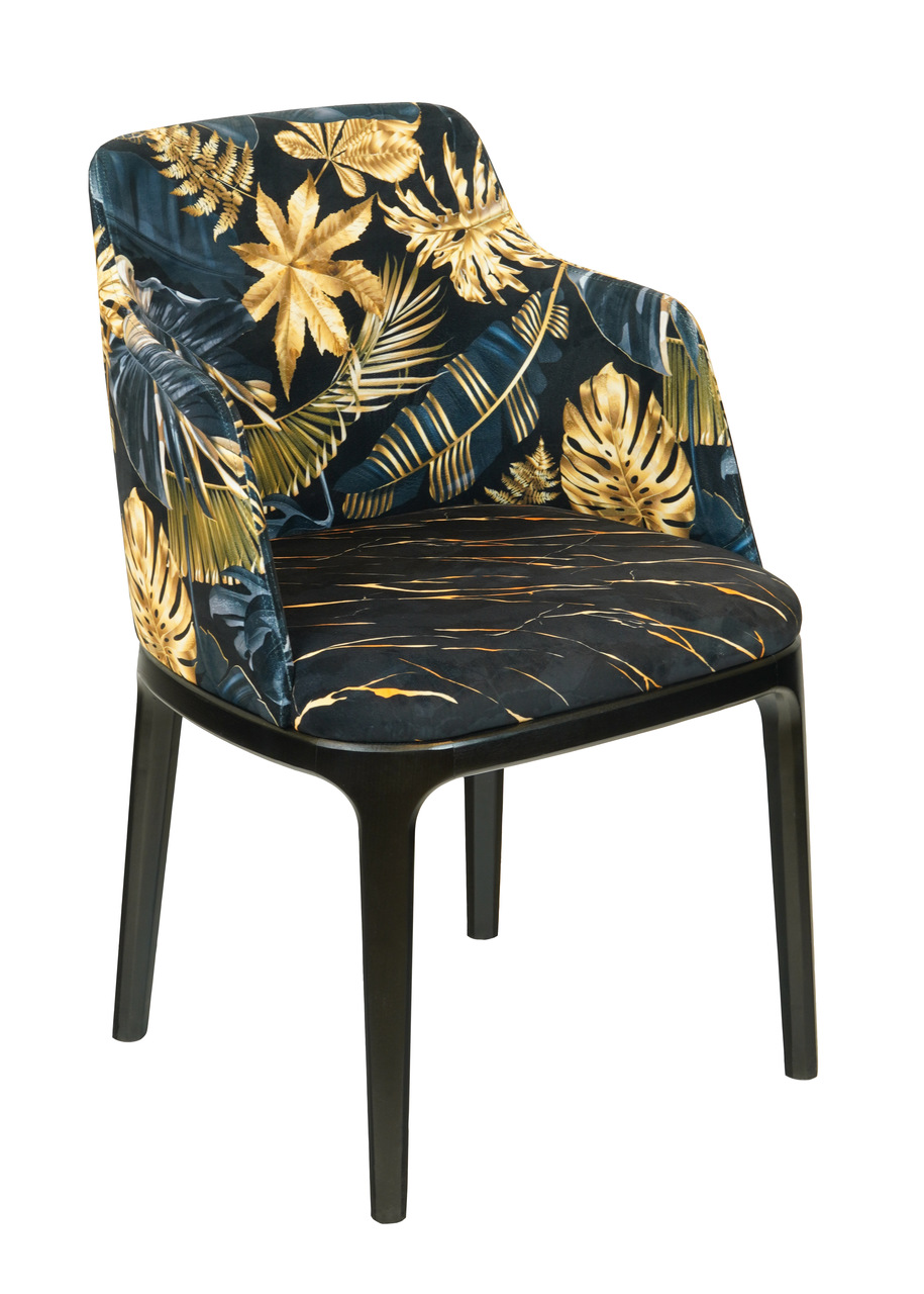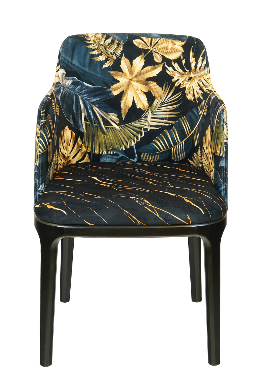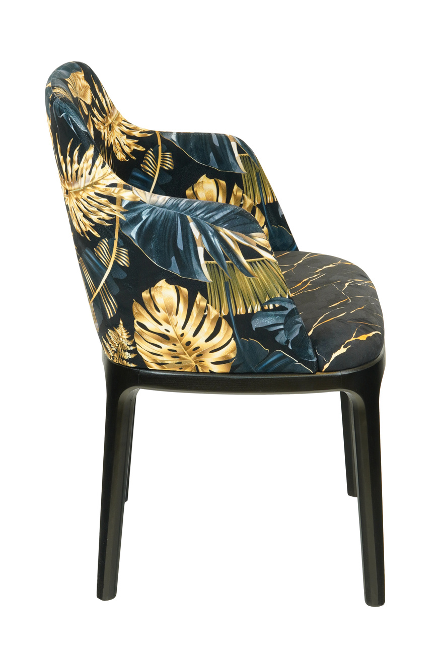 The chair is set on a sturdy beechwood frame finished in black, which adds a refined, modern touch. The seat and backrest are upholstered in multicolour velvet in the Wonder Velvet Monstera 02 / Marble 02 fabric, giving the piece a unique, artistic character. As a result, the chair stands out while still remaining easy to match with different décor styles.