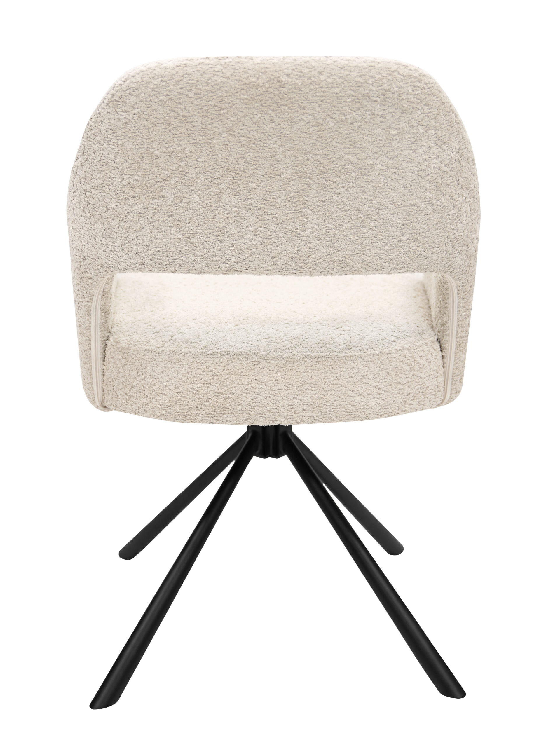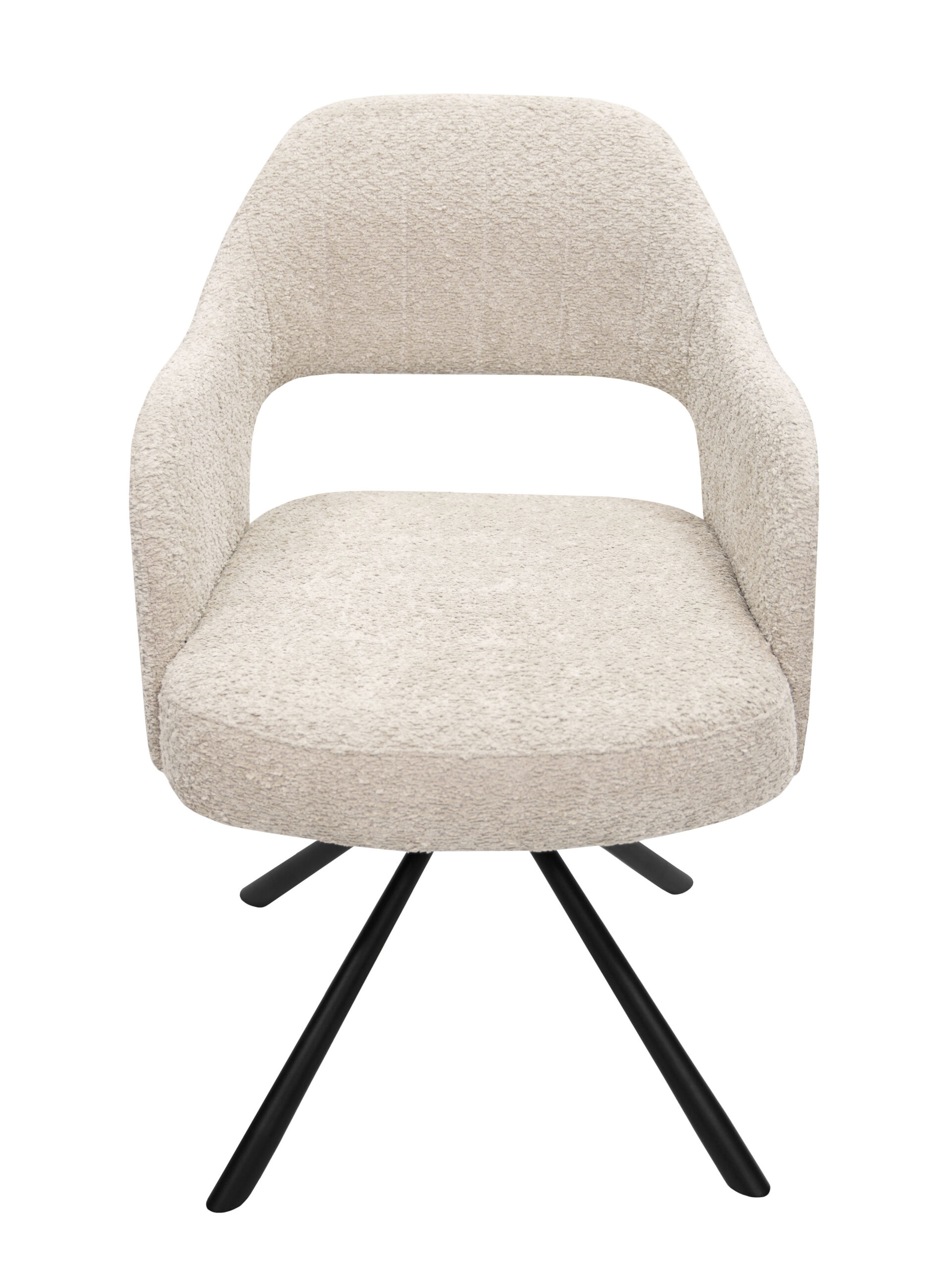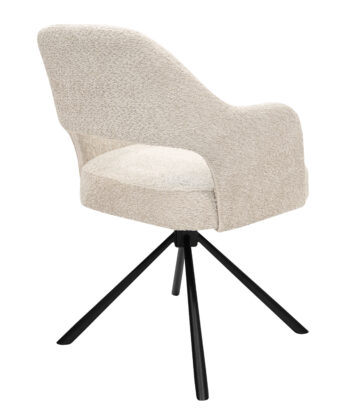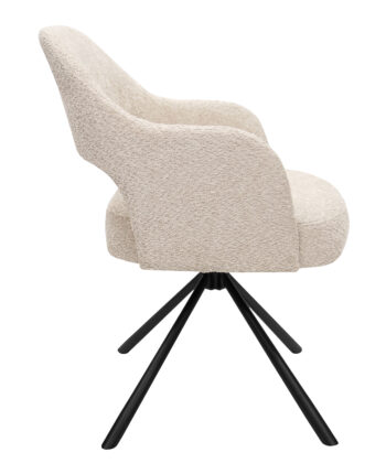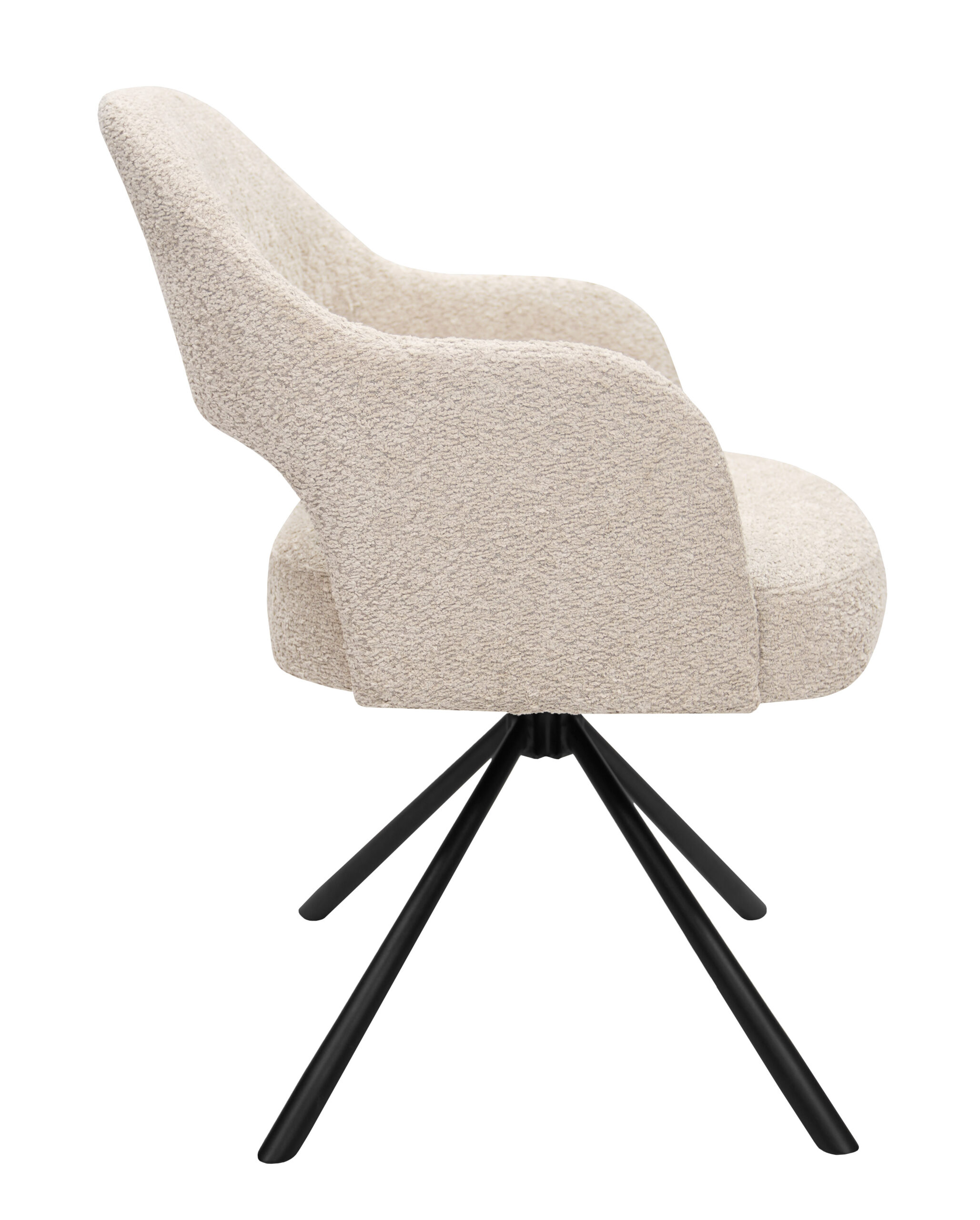 Upholstered in soft beige boucle fabric, the seat and back provide plush comfort with ergonomic shaping for extended sitting during meetings or meals. Integrated armrests at 66.5cm height add extra support, enhancing relaxation without bulk.