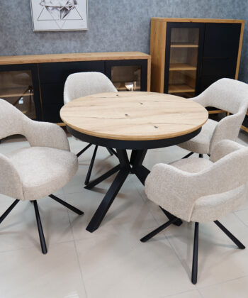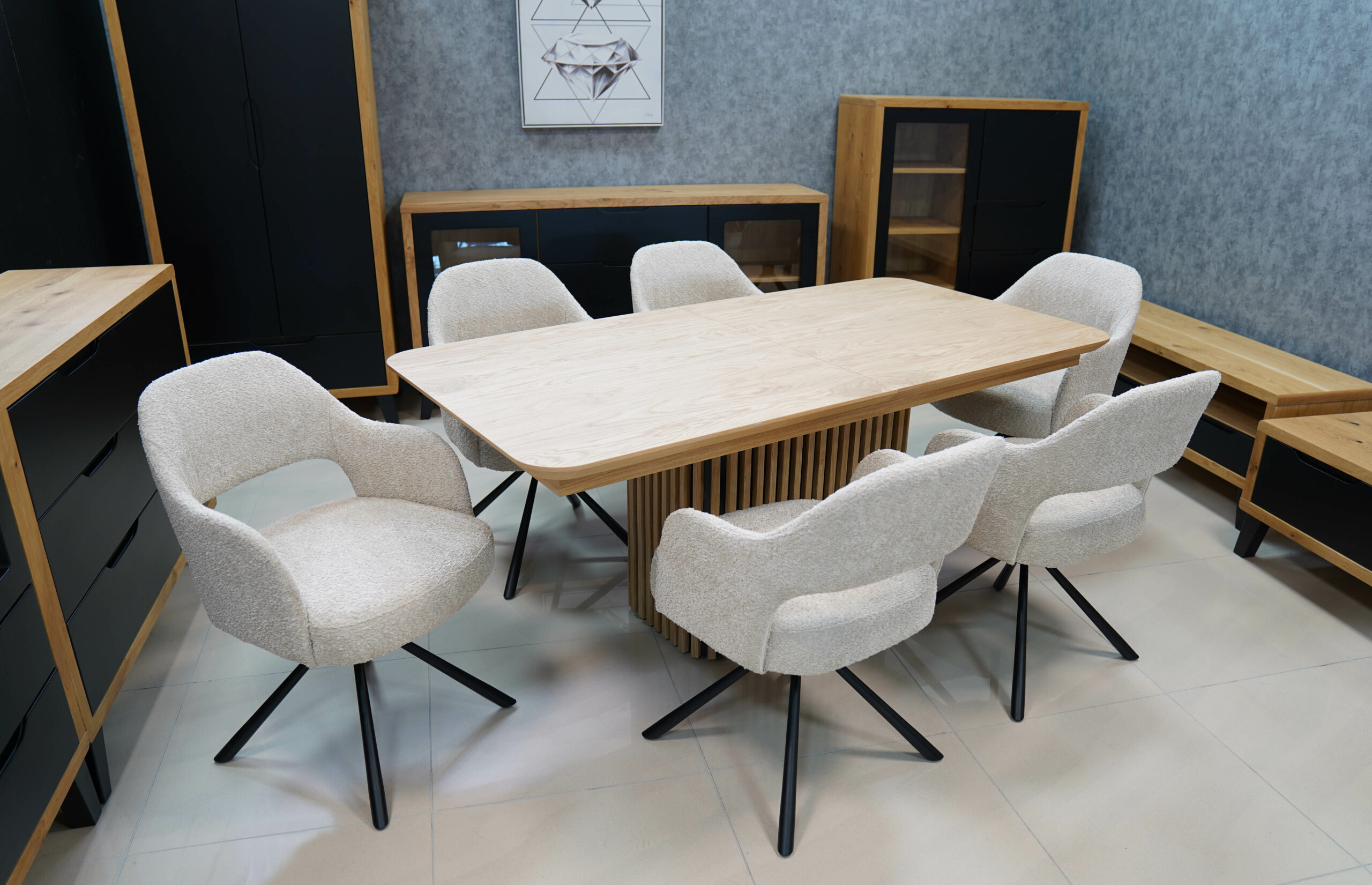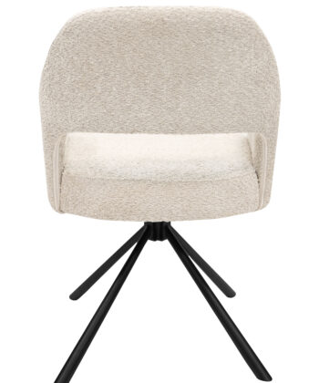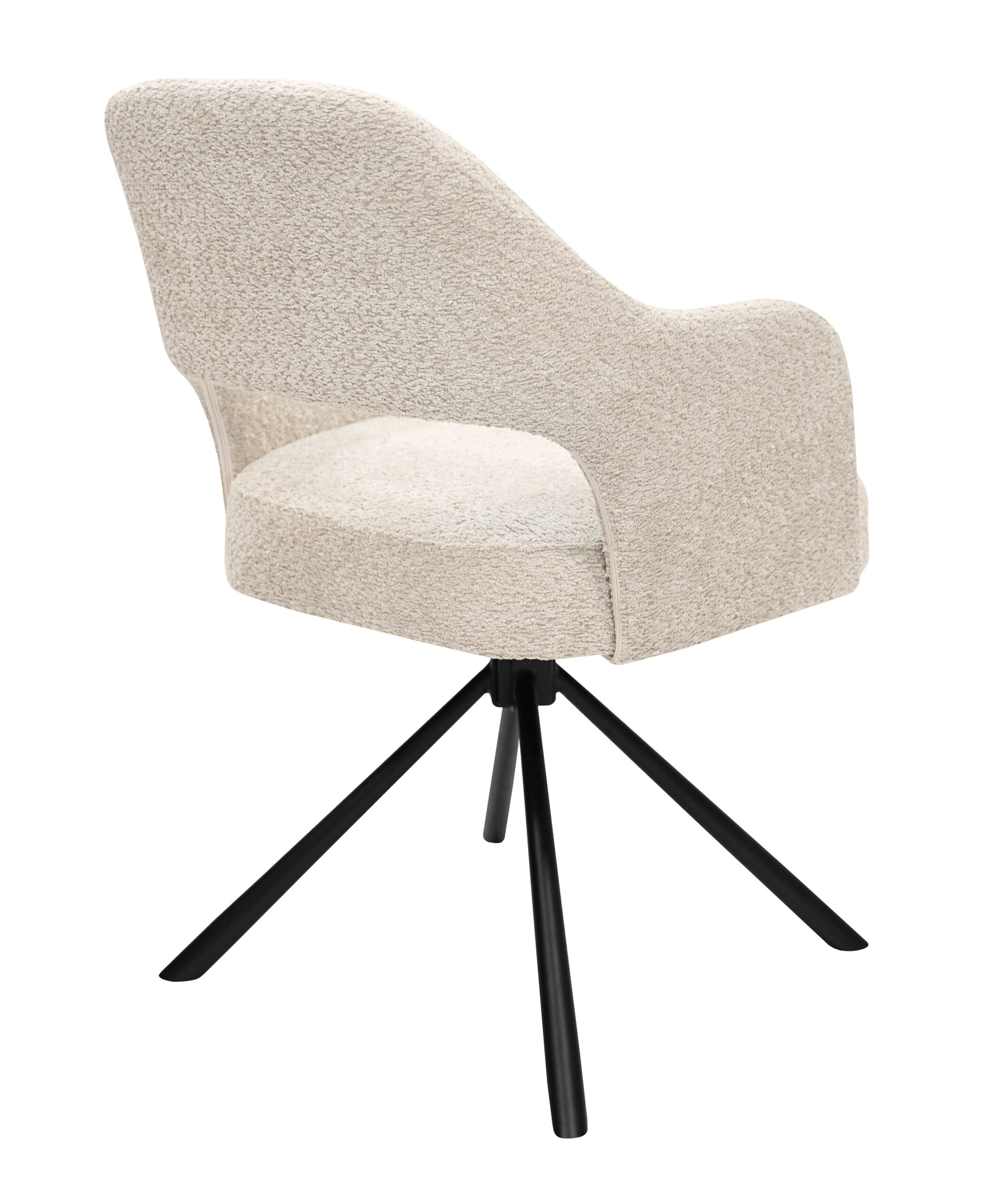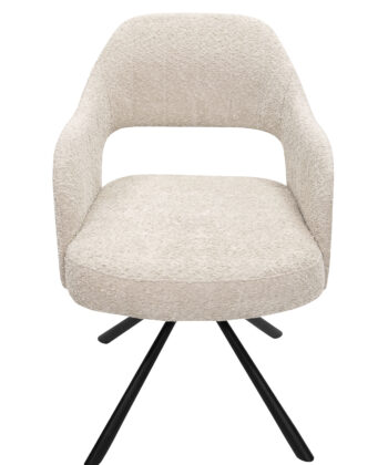 Upholstered in soft beige boucle fabric, the seat and back provide plush comfort with ergonomic shaping for extended sitting during meetings or meals. Integrated armrests at 66.5cm height add extra support, enhancing relaxation without bulk.