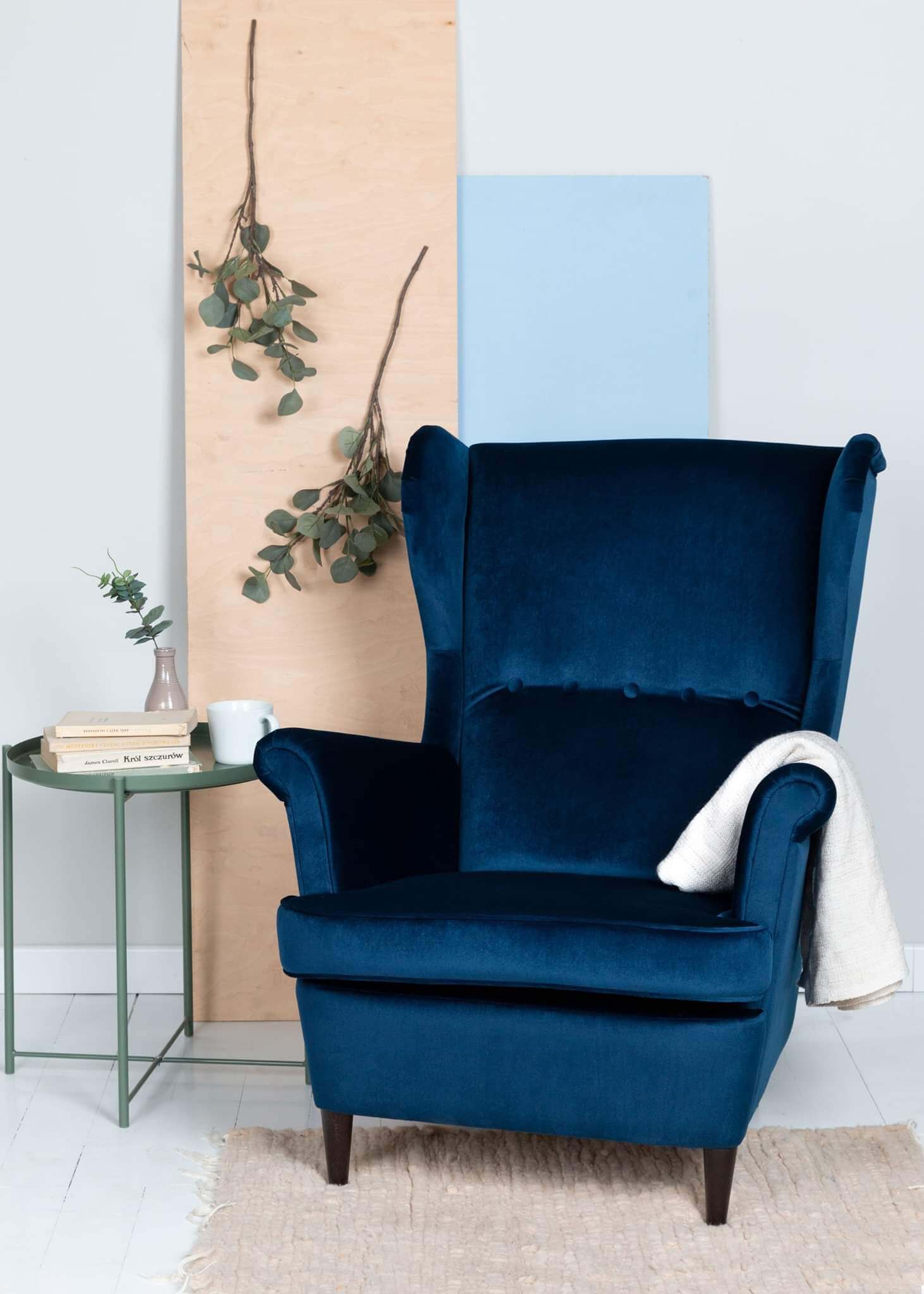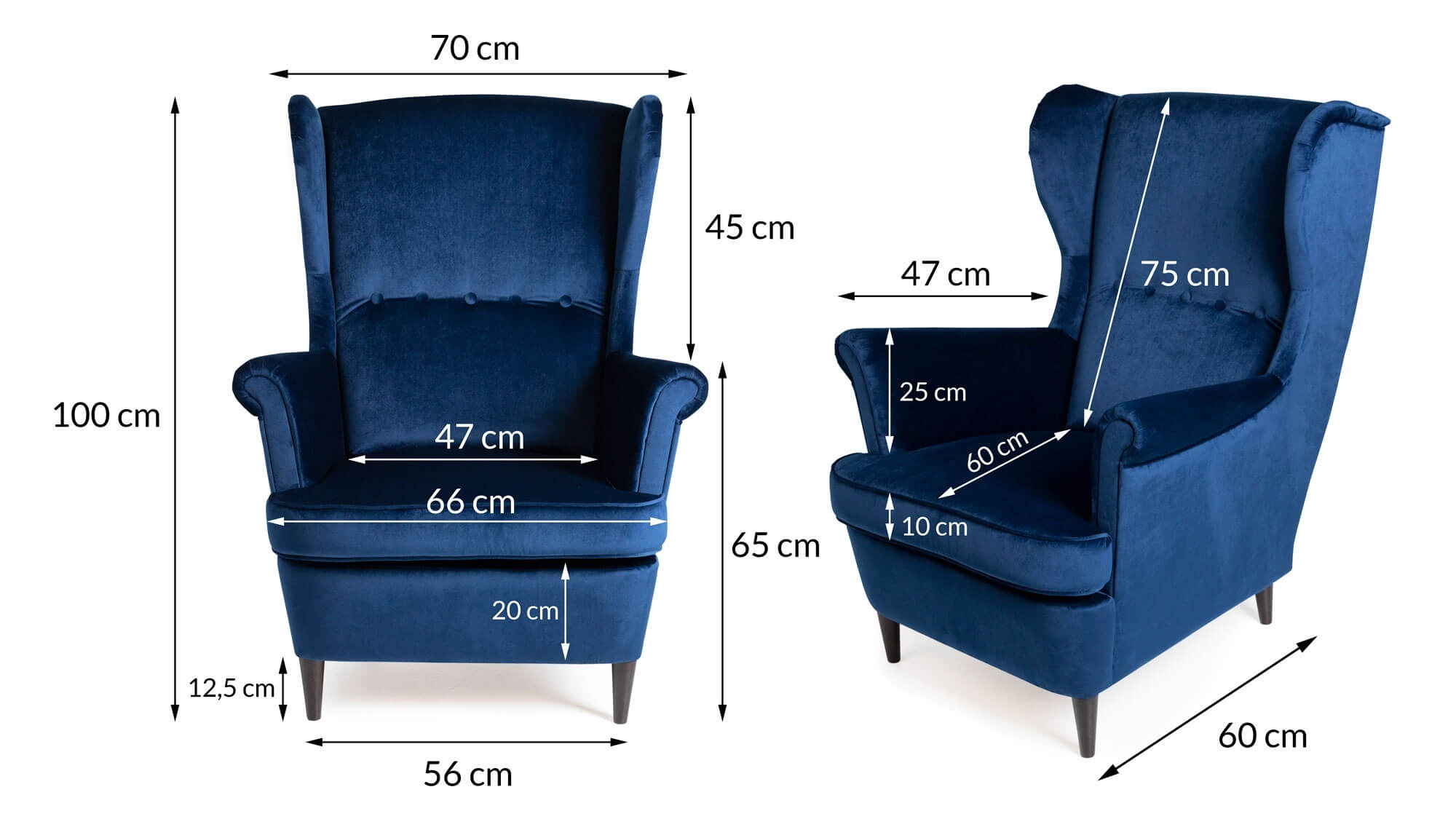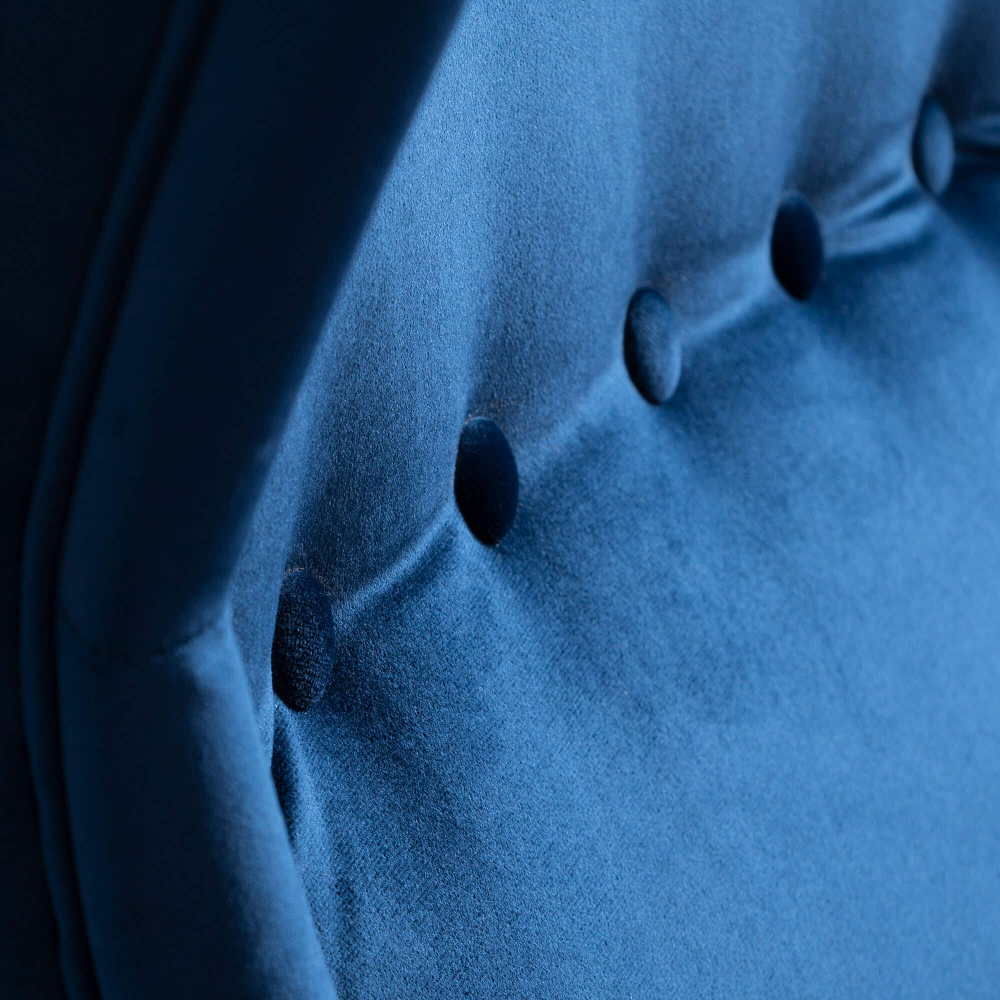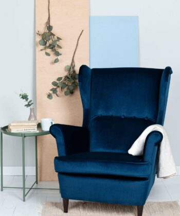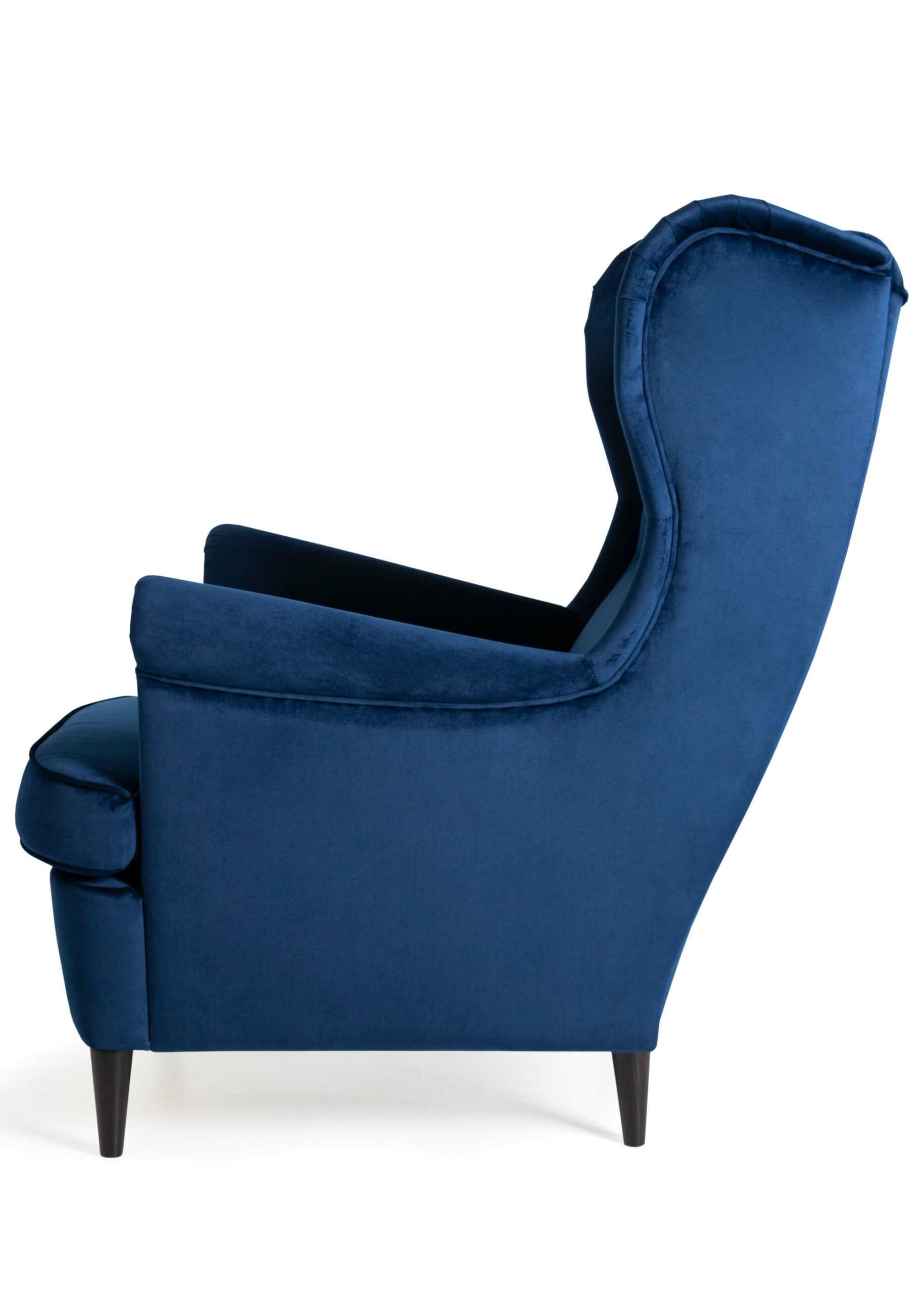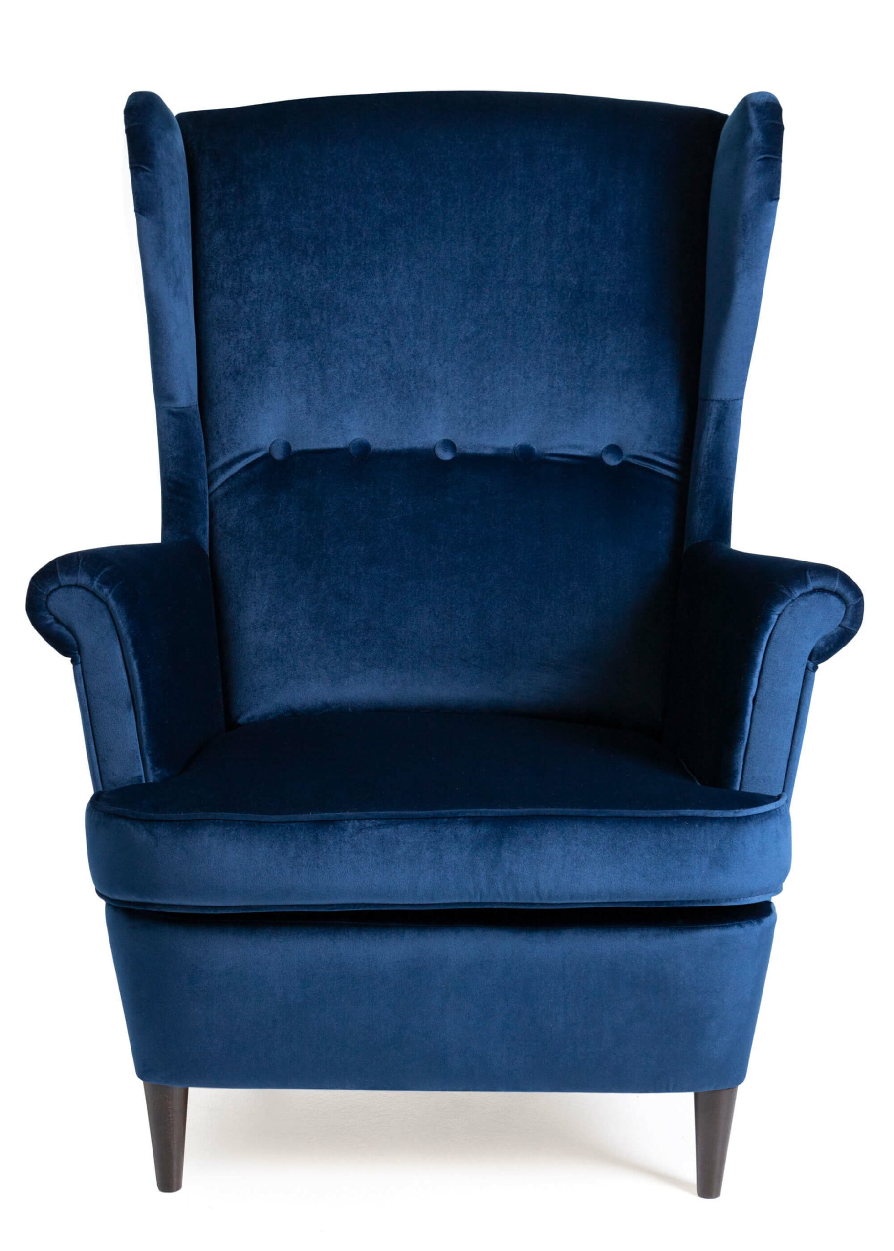 The Sapphire Crown Tufted Wingback elevates living rooms with its classic Scandinavian wingback silhouette enhanced by elegant button-tufted detailing across the plush navy velvet upholstery. The substantial upholstered body rests on slim yet stable wenge-finished beech wood legs that create perfect visual balance between mass and elegance. Luxurious velvet fabric shimmers subtly in light, adding exclusive sophistication to modern classic, Scandinavian or transitional interiors.