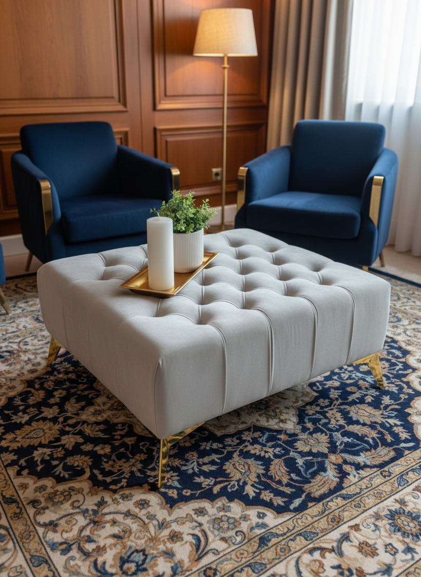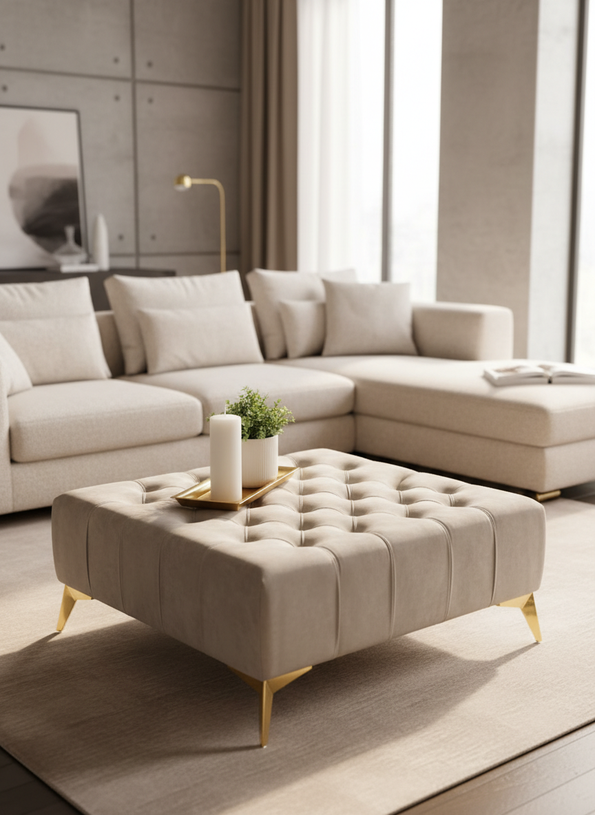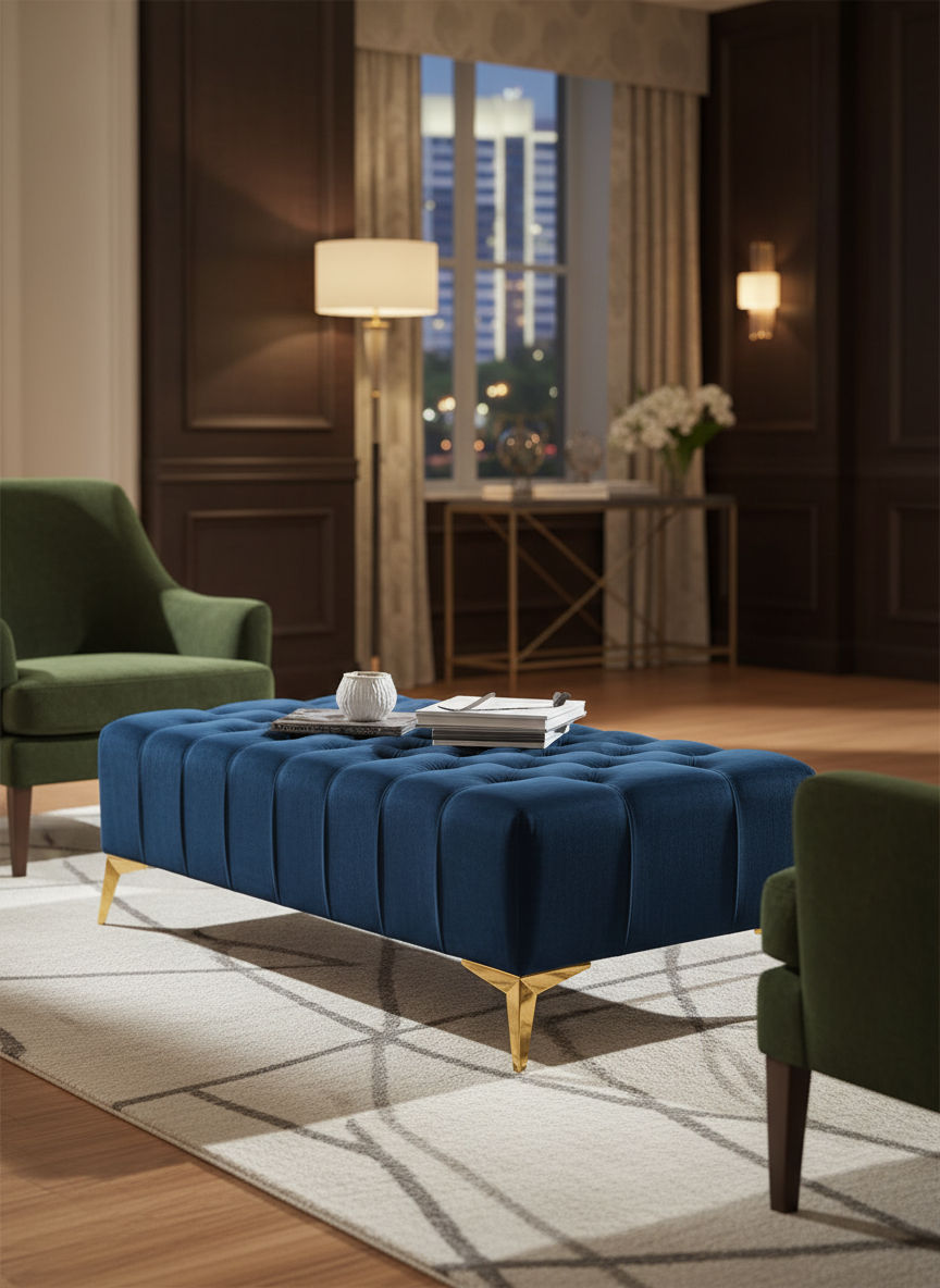 Velvet Chesterfield Lux Coffee Table – Elegant Rectangle, Tufted, 60x80x38 cm, Gold Legs