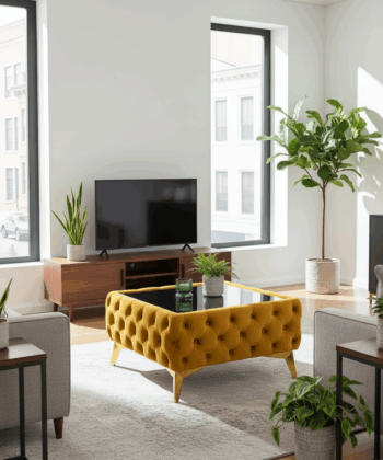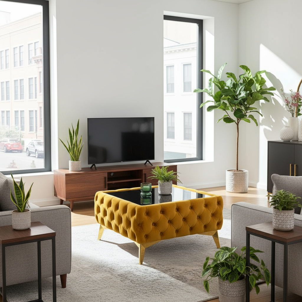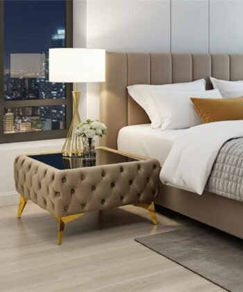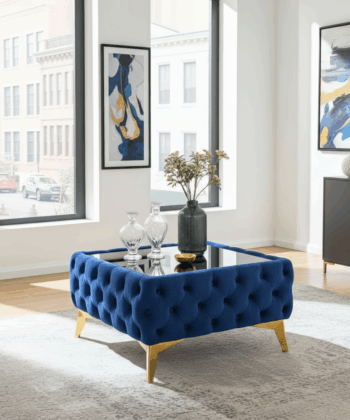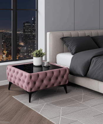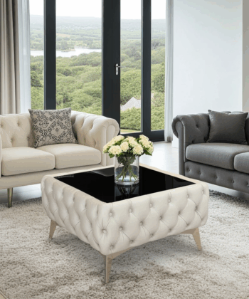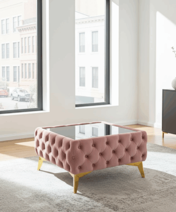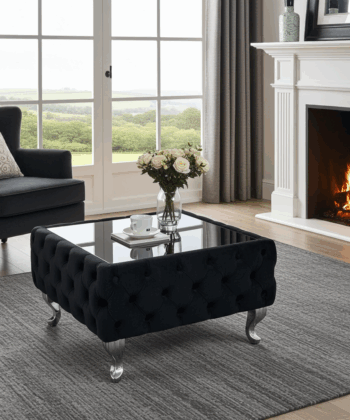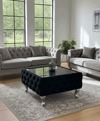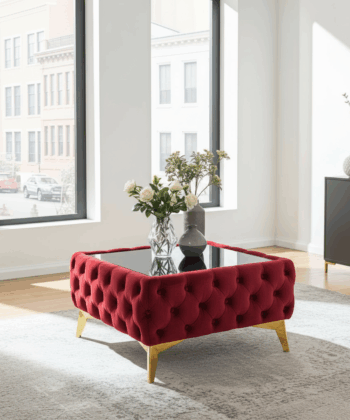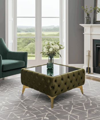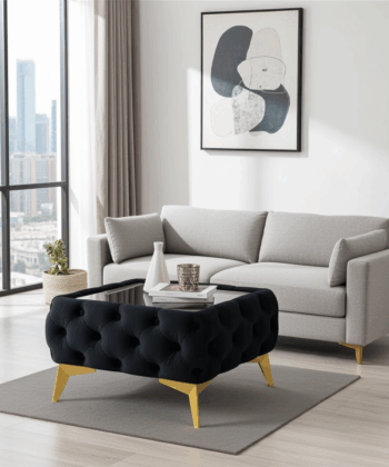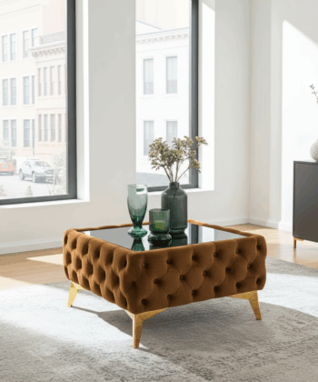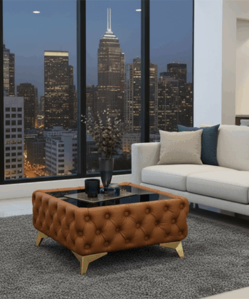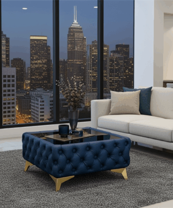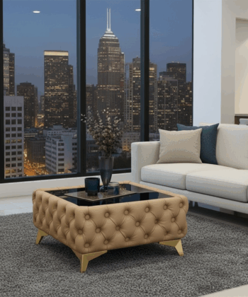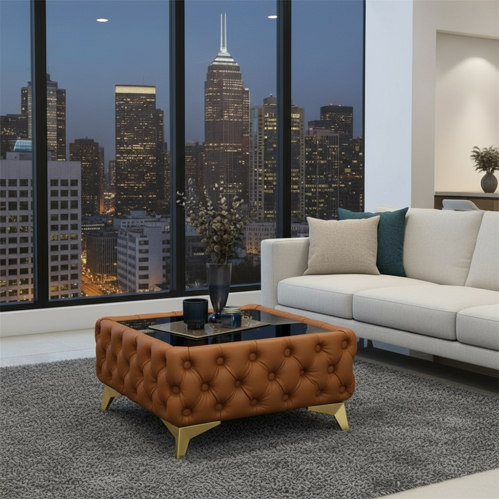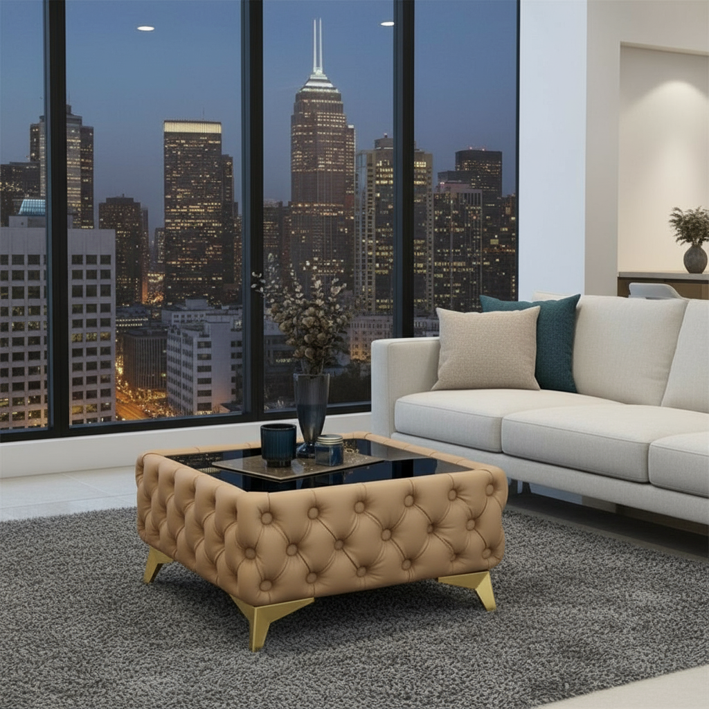 This luxurious square coffee table blends Chesterfield-inspired tufting with contemporary materials, now offering expanded customization. The compact 63×63 cm design remains versatile for small or large spaces, while the glass top now comes in white or black tinted options for varied aesthetic appeal. The legs are available in powder-coated gold, black, or silver finishes, complementing minimalist, industrial, or classic settings.