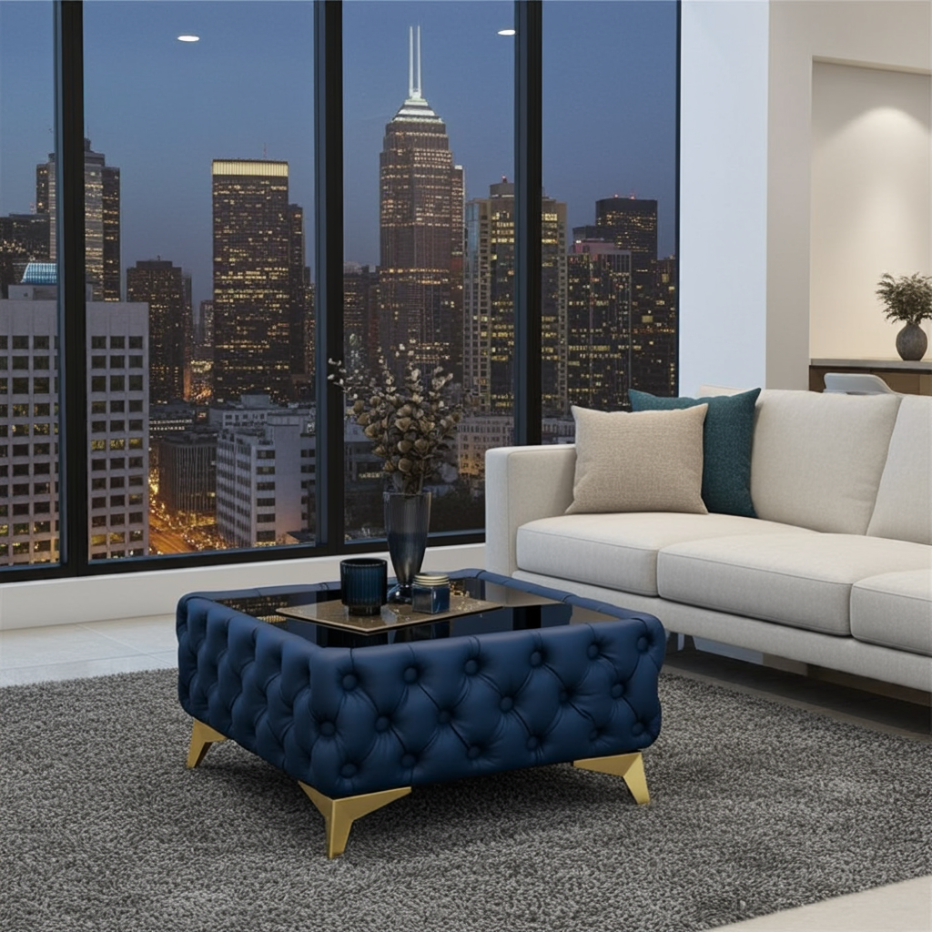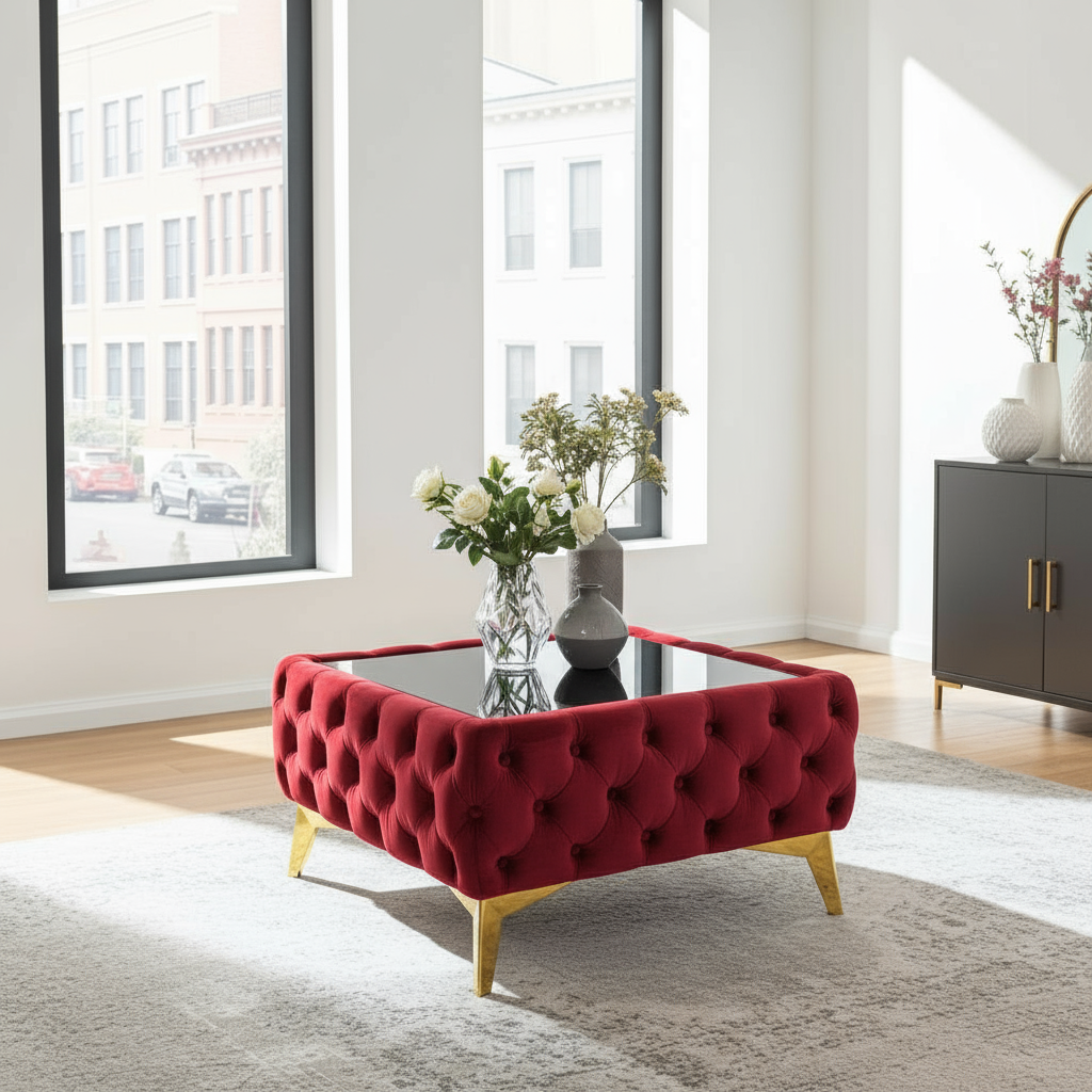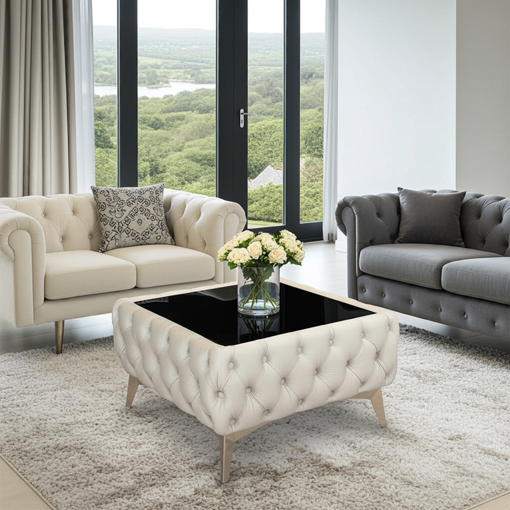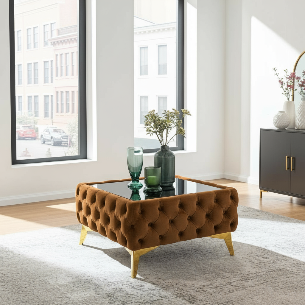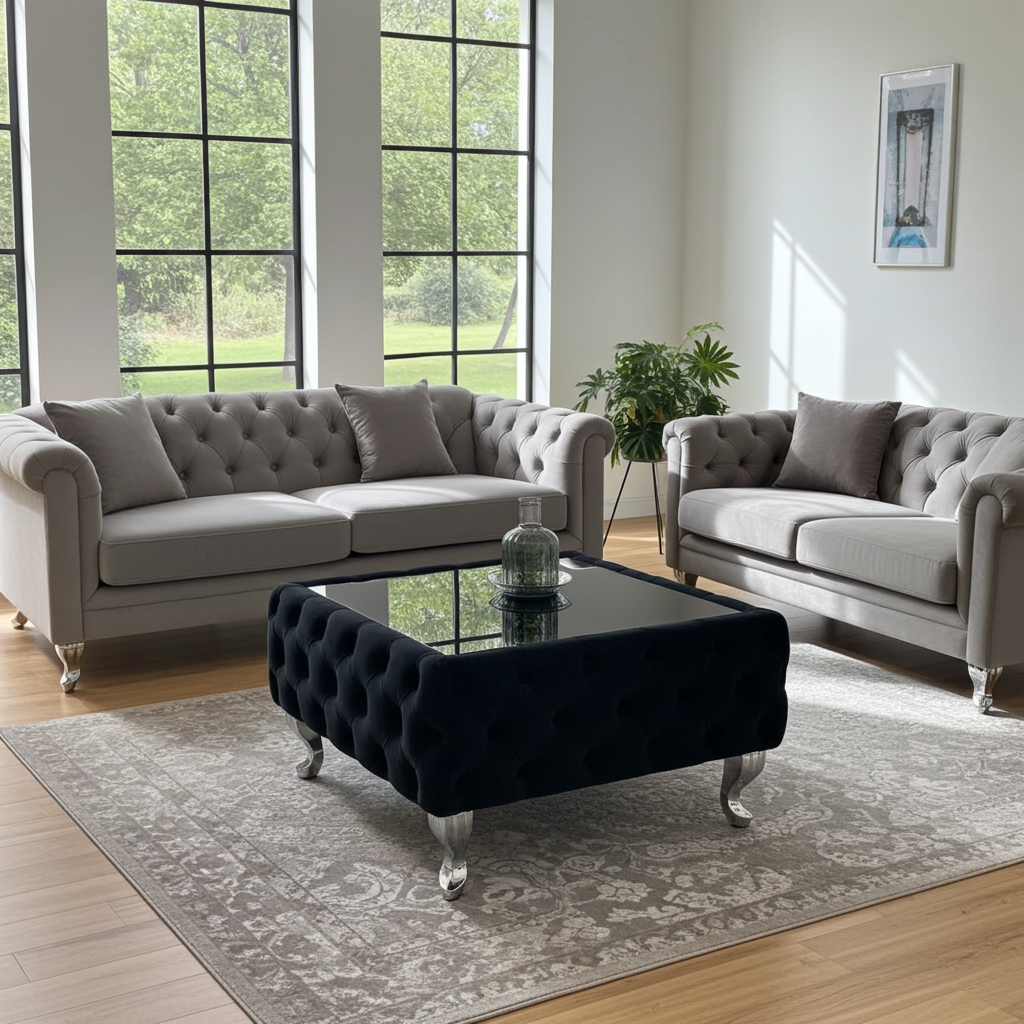 Luxury Velvet Chesterfield Coffee Table – Square Design, Multiple Finishes, Customizable Glass, 63x63x35 cm