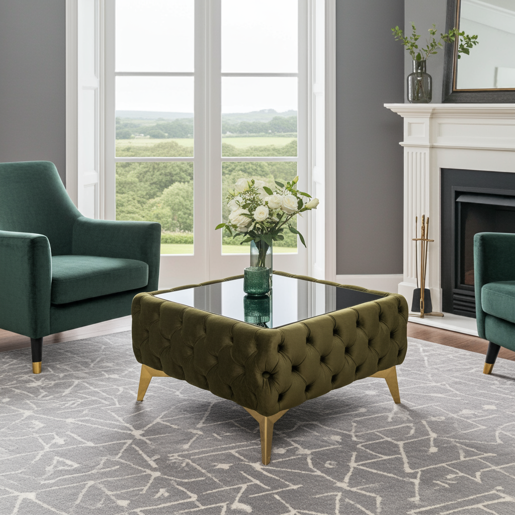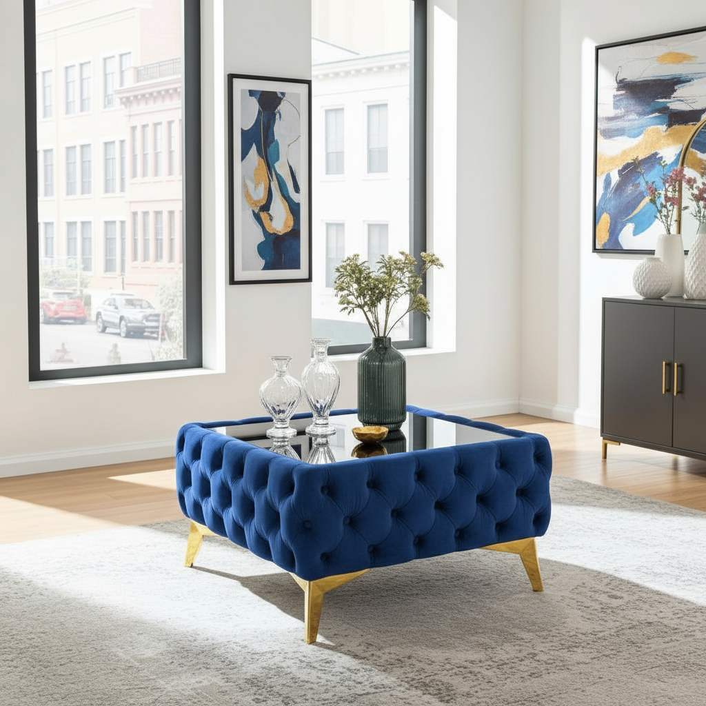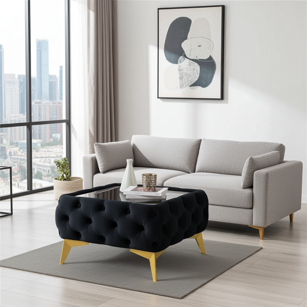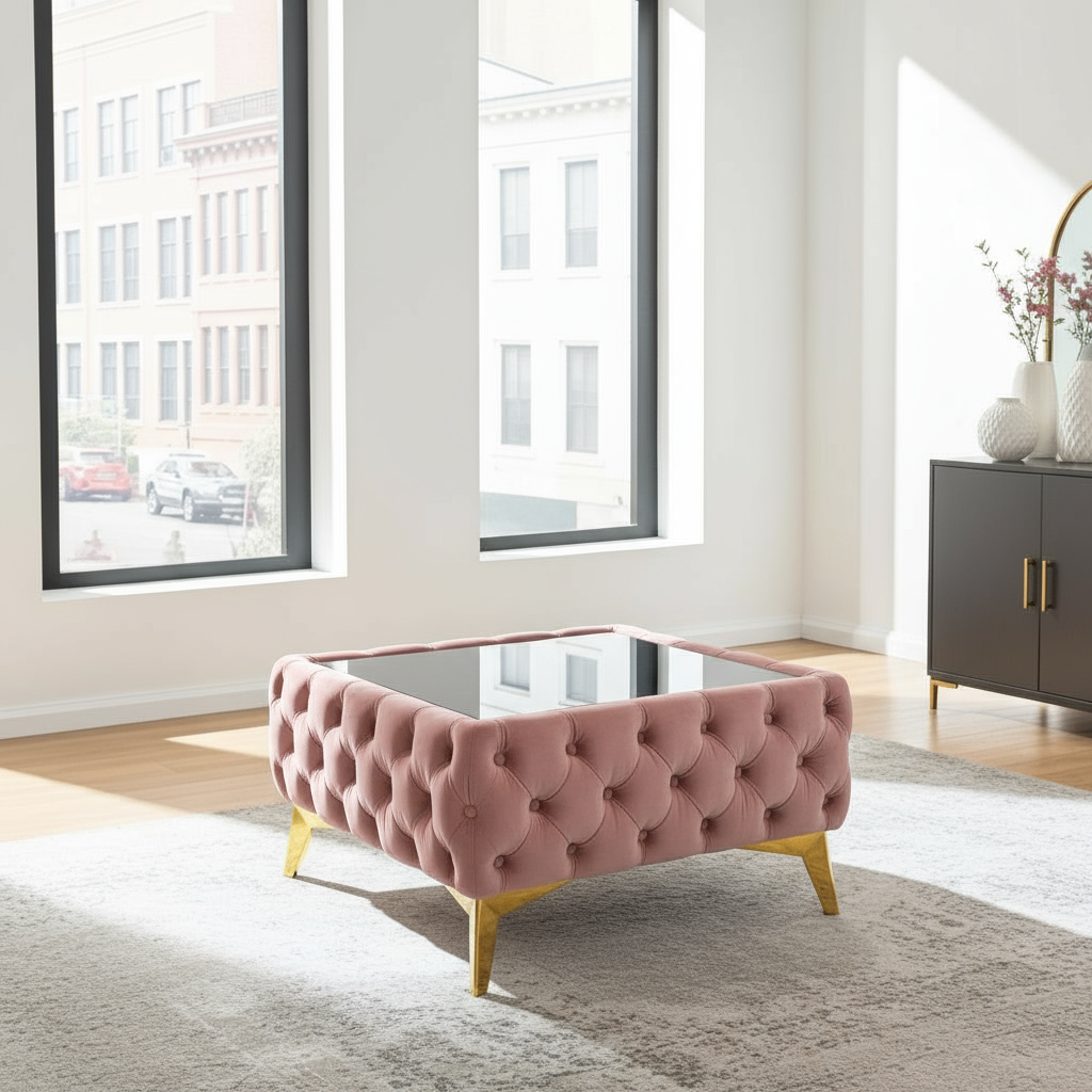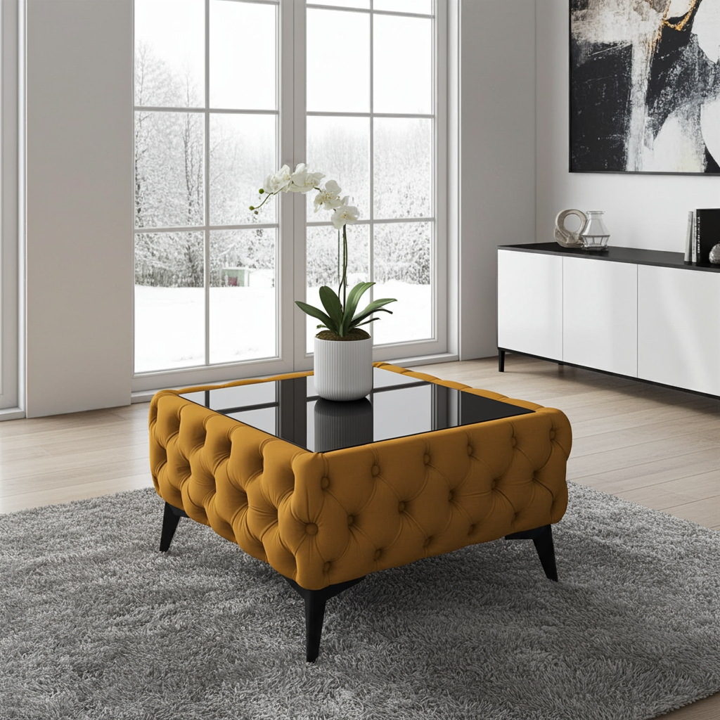 Luxury Velvet Chesterfield Coffee Table – Square Design, Multiple Finishes, Customizable Glass, 63x63x35 cm