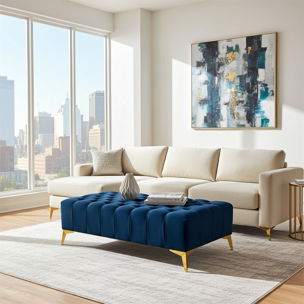 This sophisticated coffee table seamlessly blends traditional and contemporary styles. The classic Chesterfield-inspired tufting adds a touch of elegance, while the tinted glass top introduces a modern element. The contrast between the plush velvet upholstery and the sleek glass surface creates a visually striking piece.The table’s solid base ensures stability and longevity without compromising its overall light appearance. Its versatile design makes it suitable for both traditional and modern interiors, adapting effortlessly to various decor styles.For those seeking a personalized touch, the manufacturer offers customization options, including the ability to adjust the table’s dimensions to suit specific requirements.