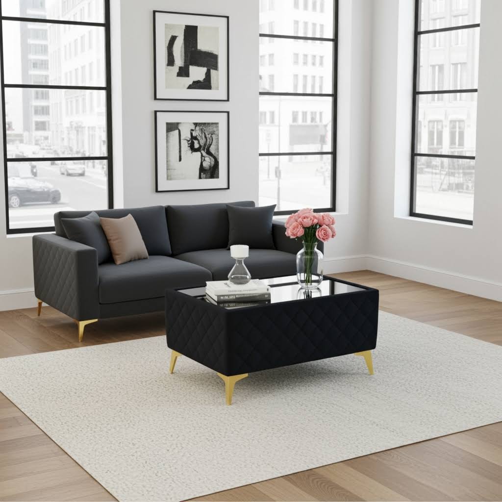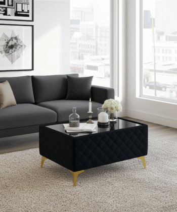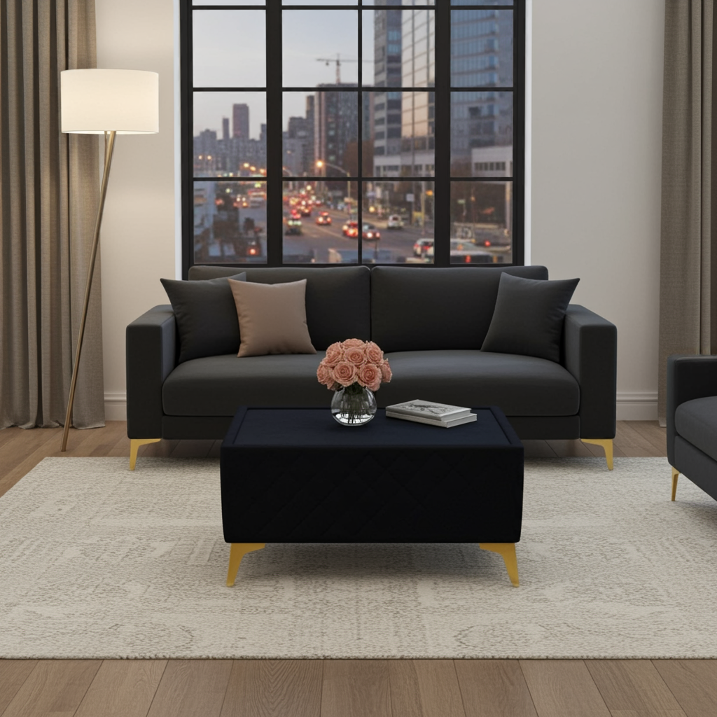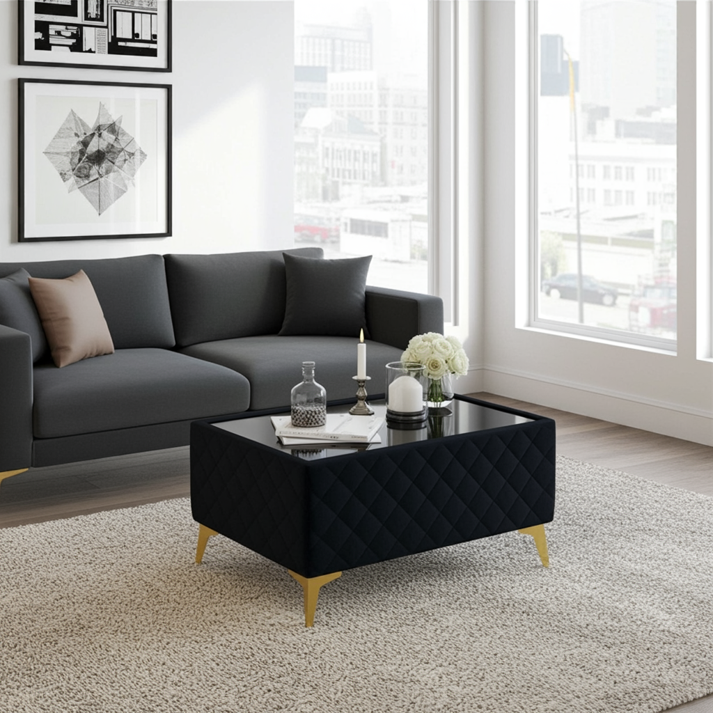Premium Handcrafted Velvet Coffee Table with Black Glass Surface and Elegant Gold Metal Legs for Irish Homes