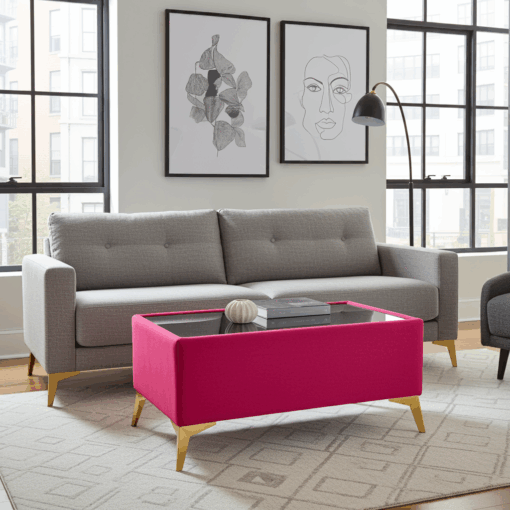 Revolutionise your interior space with PouffeLove’s exceptional custom velvet coffee table featuring luxurious upholstered sides. Additionally, this outstanding piece showcases a premium glass top surface for modern sophistication. Moreover, it’s meticulously designed for discerning Irish interiors. Furthermore, the designer metal legs provide contemporary elegance and structural integrity to any environment.