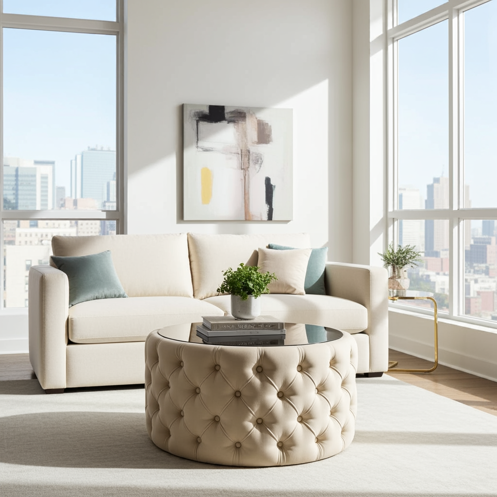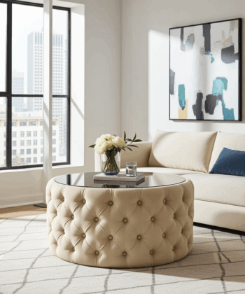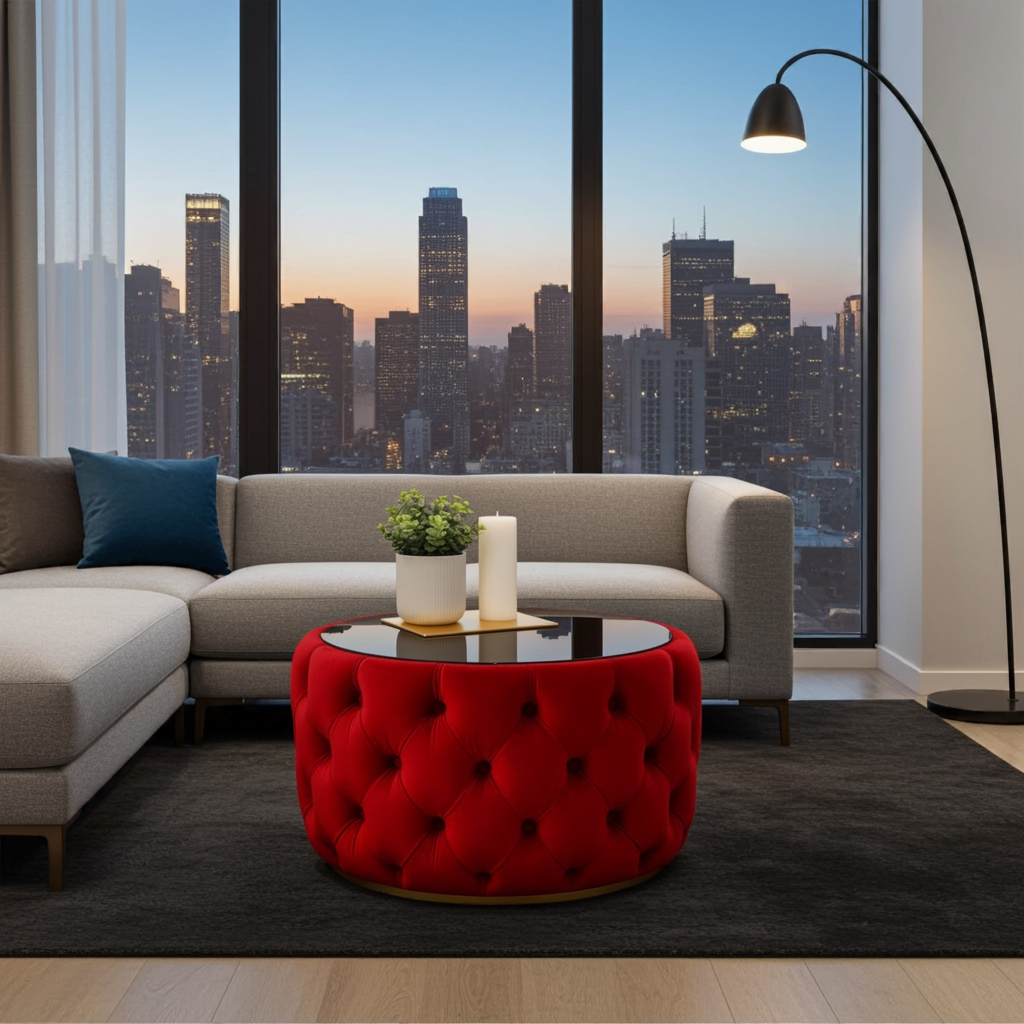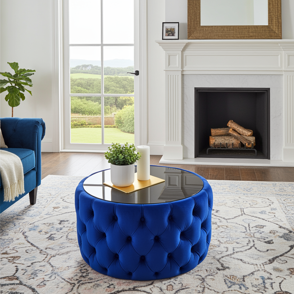 Refresh your seating area with this 60 cm round velvet coffee table, marrying classic Chesterfield button-tufting with a sleek, dark-tinted safety-glass surface. The enlarged diameter offers generous space for lattes, books and décor, while the plush, fully upholstered base introduces a luxe tactile element that draws the eye. Crafted on a solid hardwood/engineered frame and padded with high-density foam, the table delivers hotel-lounge elegance plus everyday durability—ideal for style-savvy Irish homes.