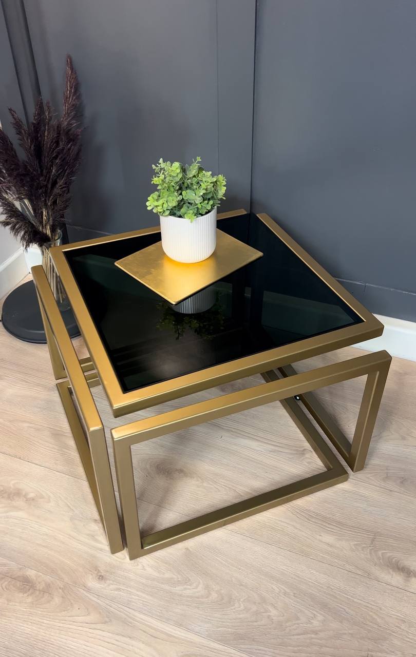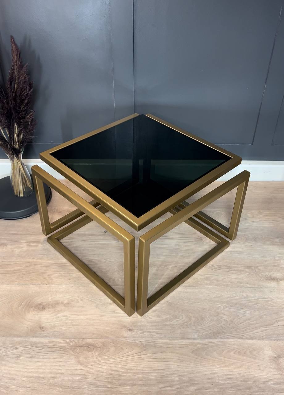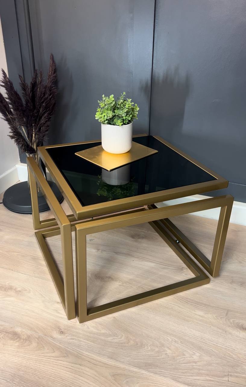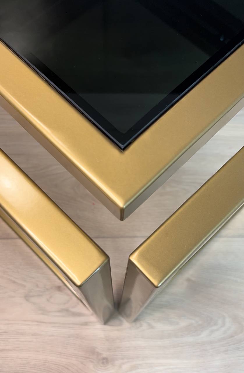 Introduce striking elegance to a living room with the Levitas Gold Coffee Table, a minimalist piece that appears to float thanks to its seamless 30 mm steel profile and hidden joins. The old‑gold, powder‑coated frame brings warm luxury, while the dark‑tinted tempered glass adds depth and a refined, contemporary edge.