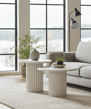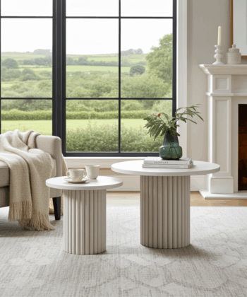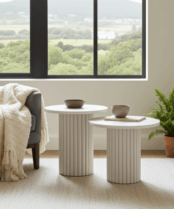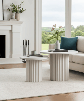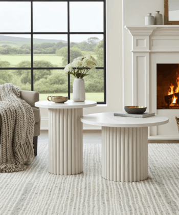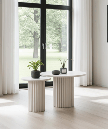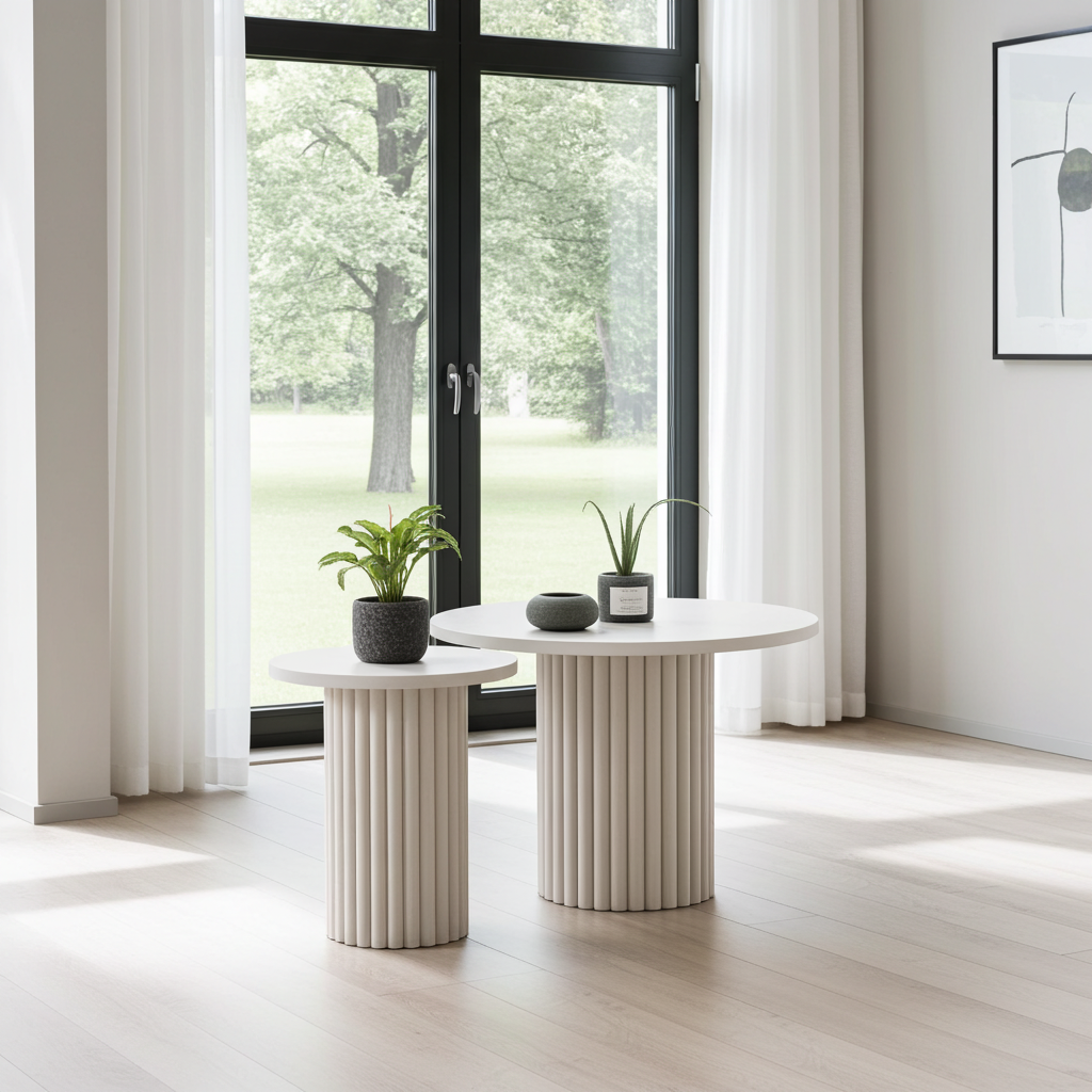 – ✓ Set includes two tables: large and small – ✓ Colour: Cashmere – ✓ Table 1: Diameter 67 cm × Height 42 cm – ✓ Table 2: Diameter 42 cm × Height 47 cm – ✓ Top thickness: 1.8 cm – ✓ Base: Sculptural ribbed design, solid build – ✓ Material: High-quality laminate & MDF, durable finish – ✓ Delivered in flat packs with easy assembly – ✓ Designed for living rooms, lounges, or modern offices