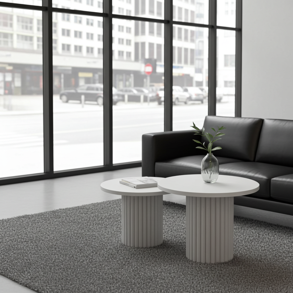 Upgrade your living space with the Modo coffee table set—a statement pairing of modern design and practical function. These tables stand out with elegantly ribbed cylindrical bases and smooth, round tops in an on-trend cashmere shade, making them eye-catching focal points for contemporary, minimalist, or art-inspired spaces. The durable construction and versatile sizing fit any living room, lounge, or open-plan flat, offering ample space for coffee, decorative accessories, or books. Use together for dramatic impact or separately to zone interior layouts. Modo tables combine quality craftsmanship, smart proportions, and contemporary character to bring effortless sophistication and utility to any room.