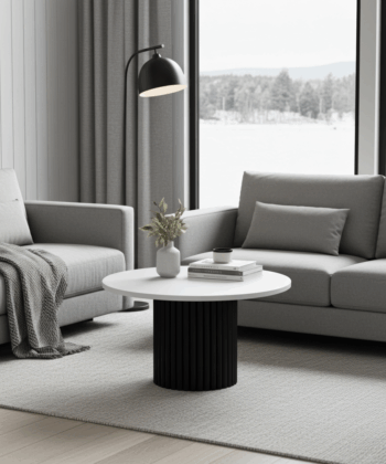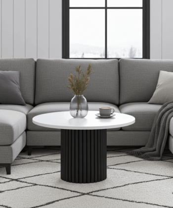 For fans of contemporary lofts and interiors with industrial flair, we present the Luna coffee table. It is the perfect combination of a crisp, white laminate top and a cool, textured black base. Furthermore, its unique fluted pedestal design creates a stunning visual statement. Consequently, this table is an ideal choice for adding a touch of sophisticated, monochrome character to your living space in Ireland.