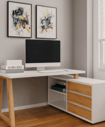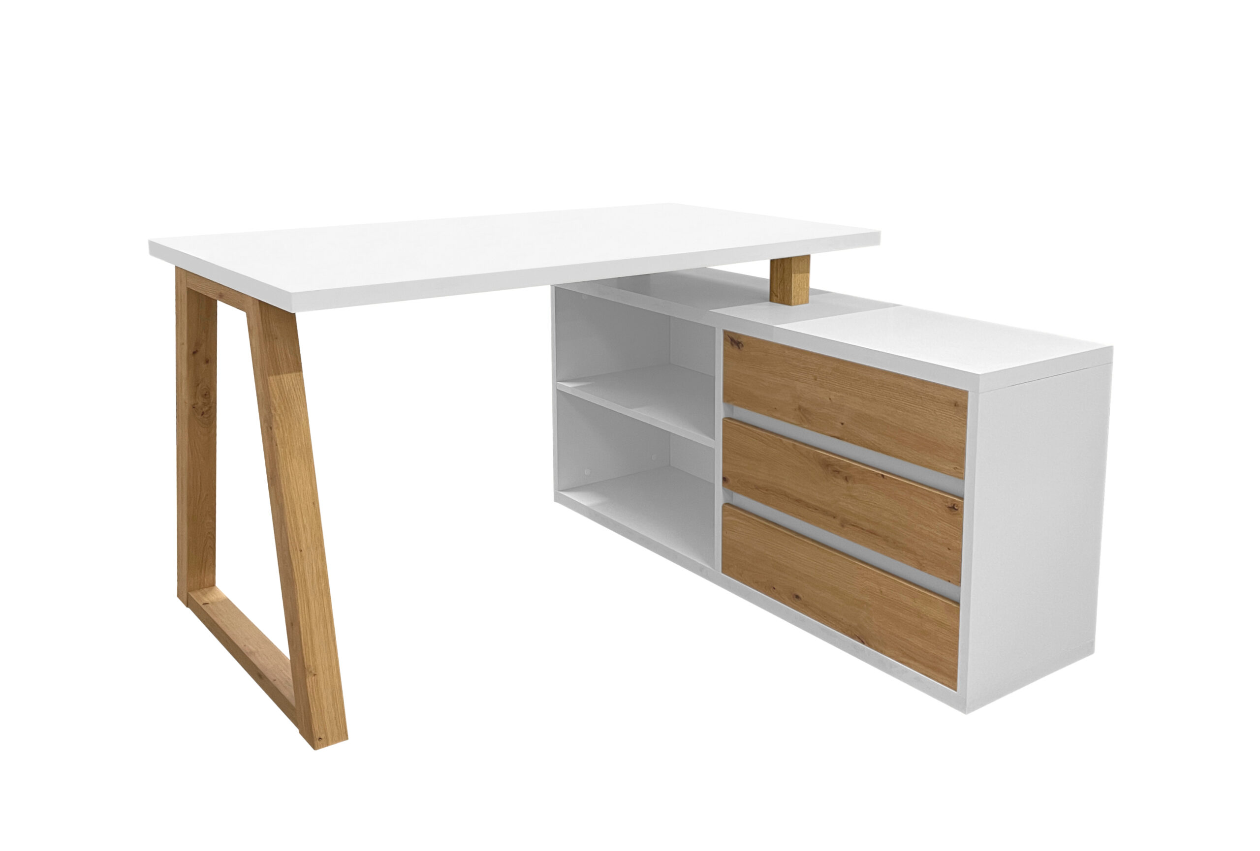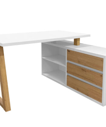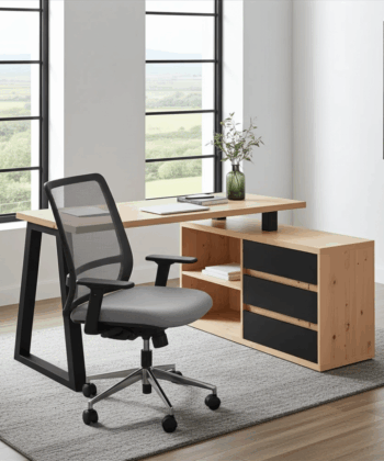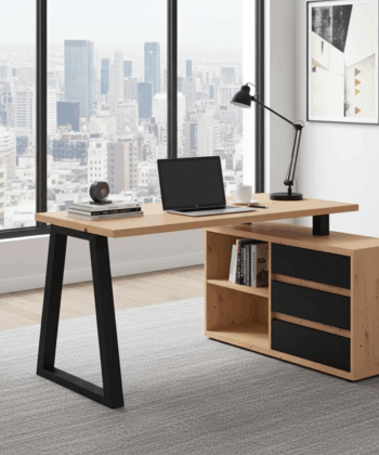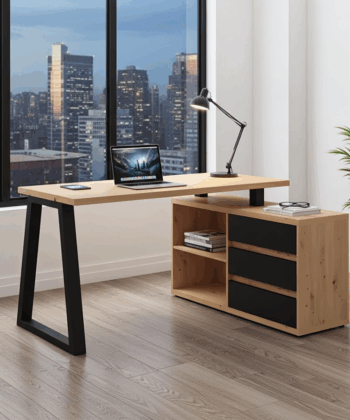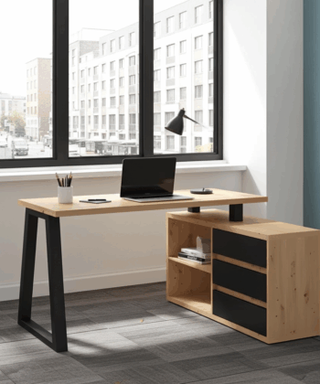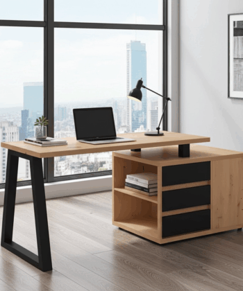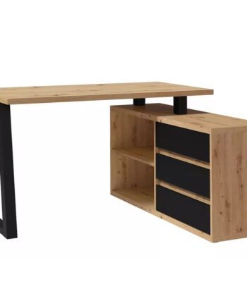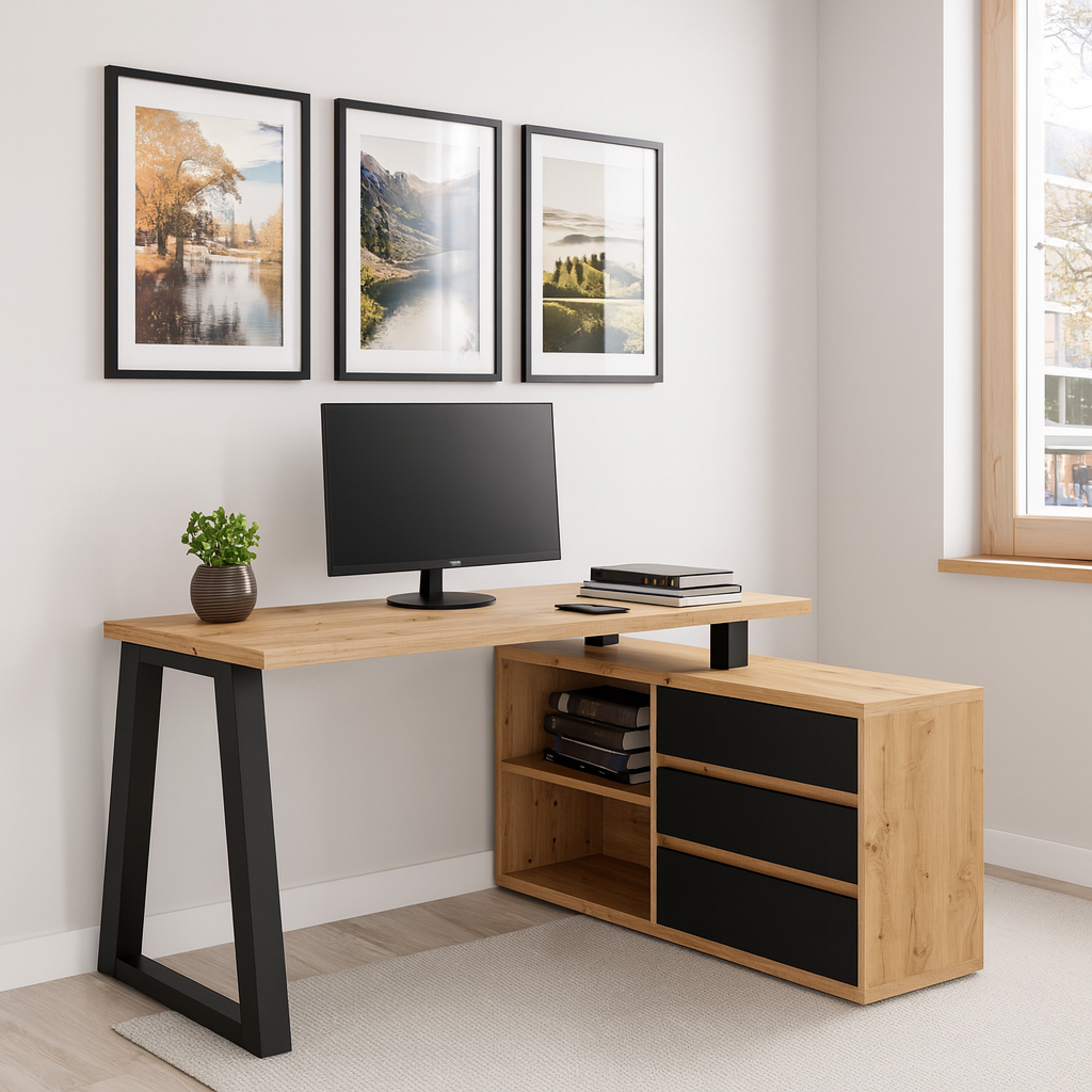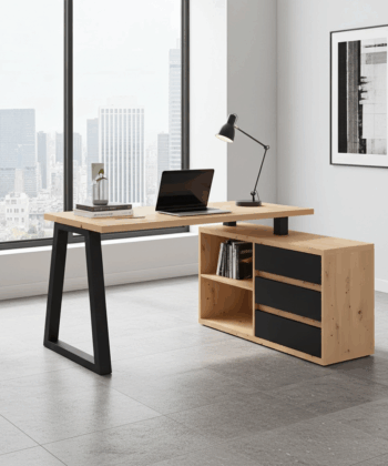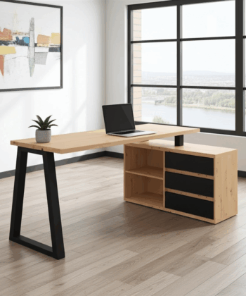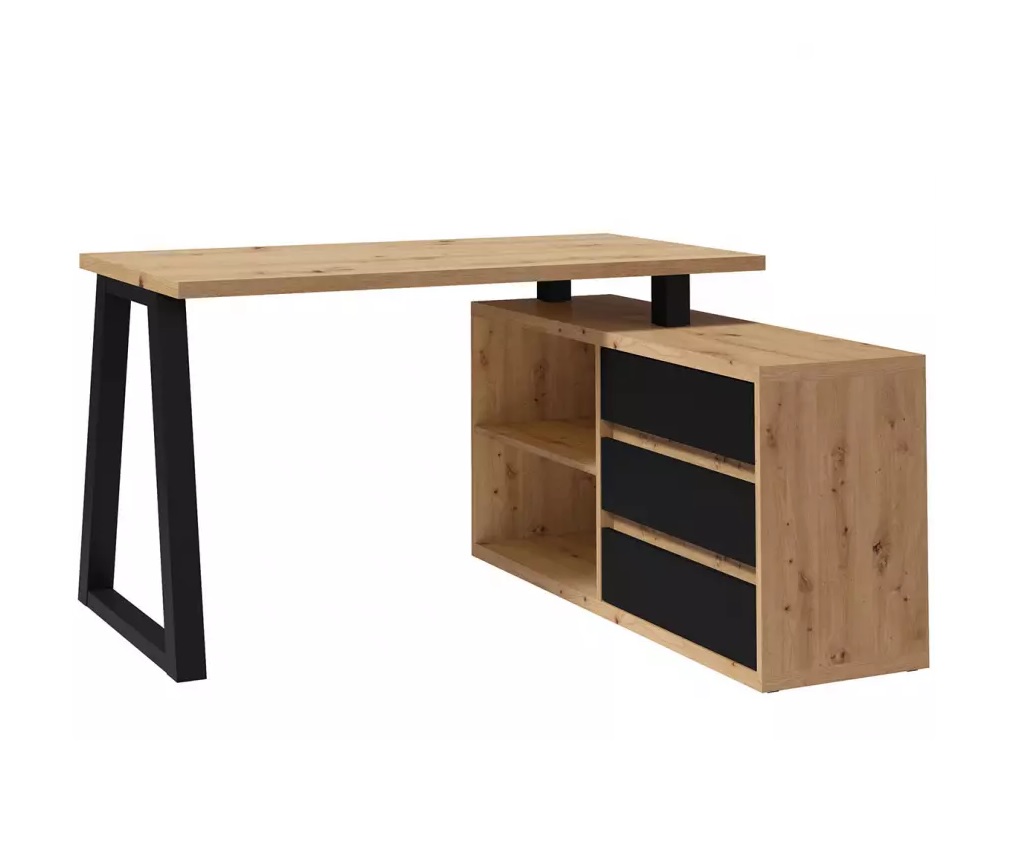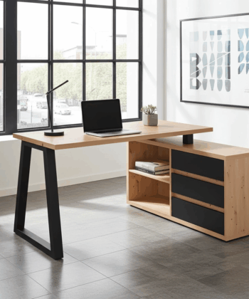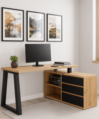 The Iga II set combines a spacious corner desk with a matching storage cabinet to build a tidy home office quickly and affordably. Moreover, the artisan oak finish warms modern interiors, while black accents add a clean, contemporary edge that pairs well with most décor. Because both pieces use durable laminated chipboard and careful detailing, the set remains easy to clean and ready for everyday work.