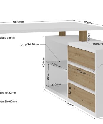 Desk: width 135 cm, height 75 cm, depth 115 cm.