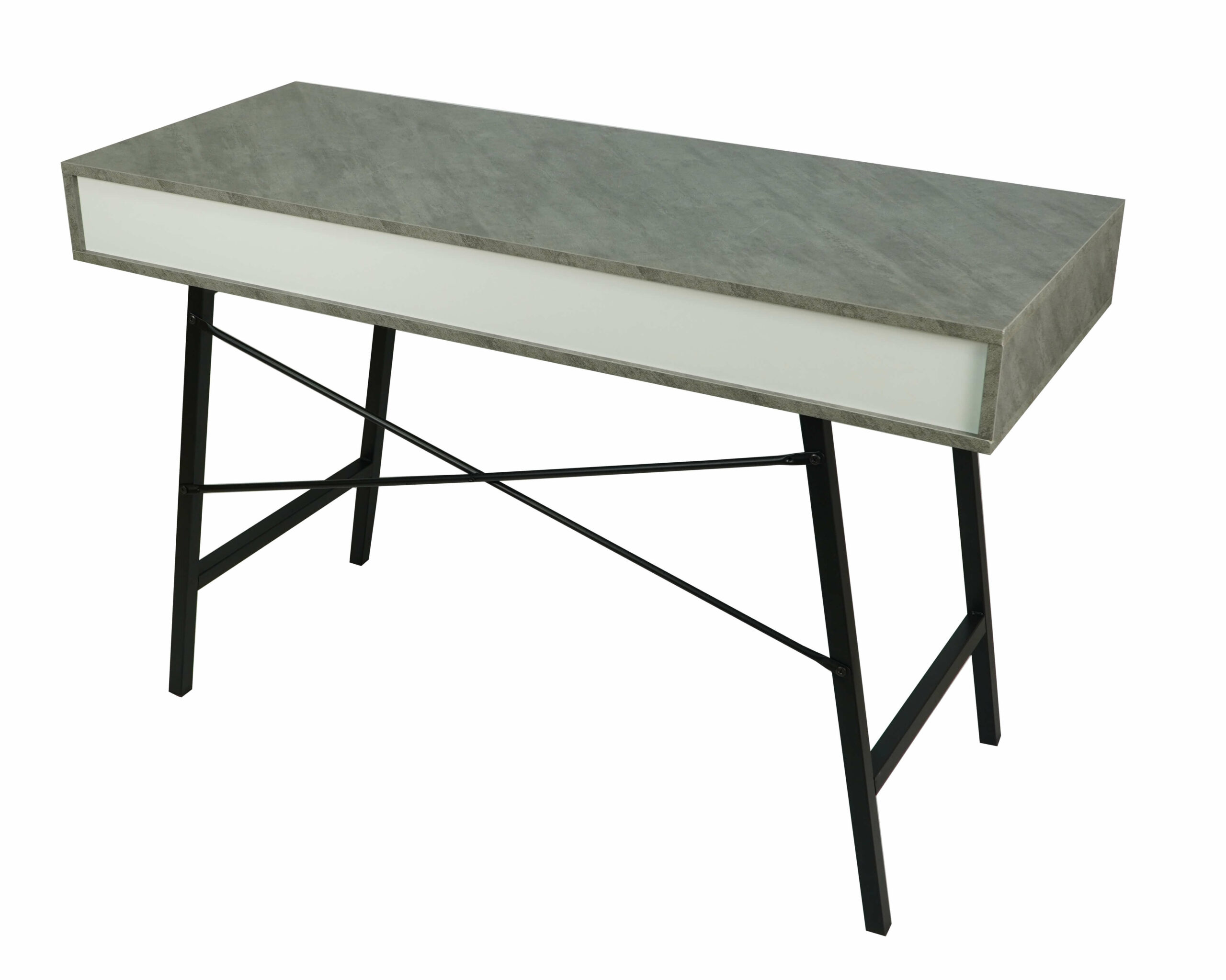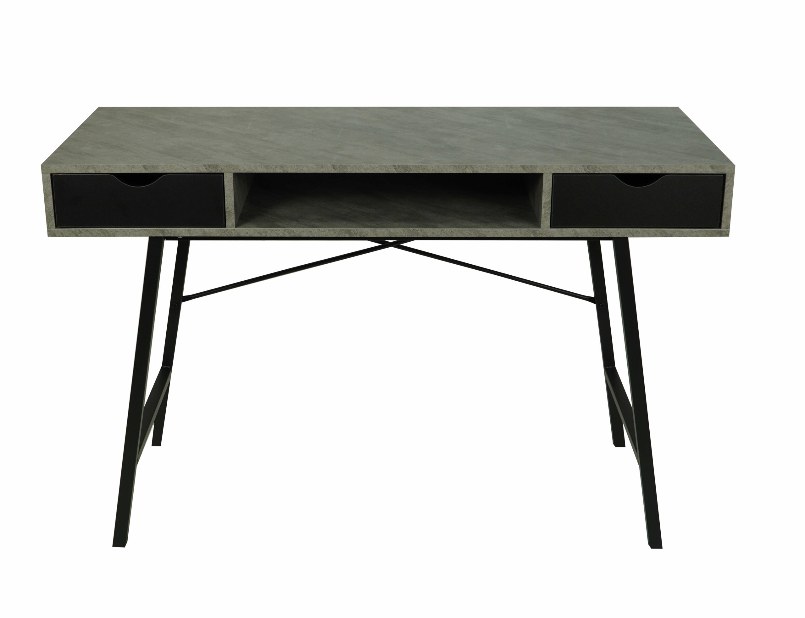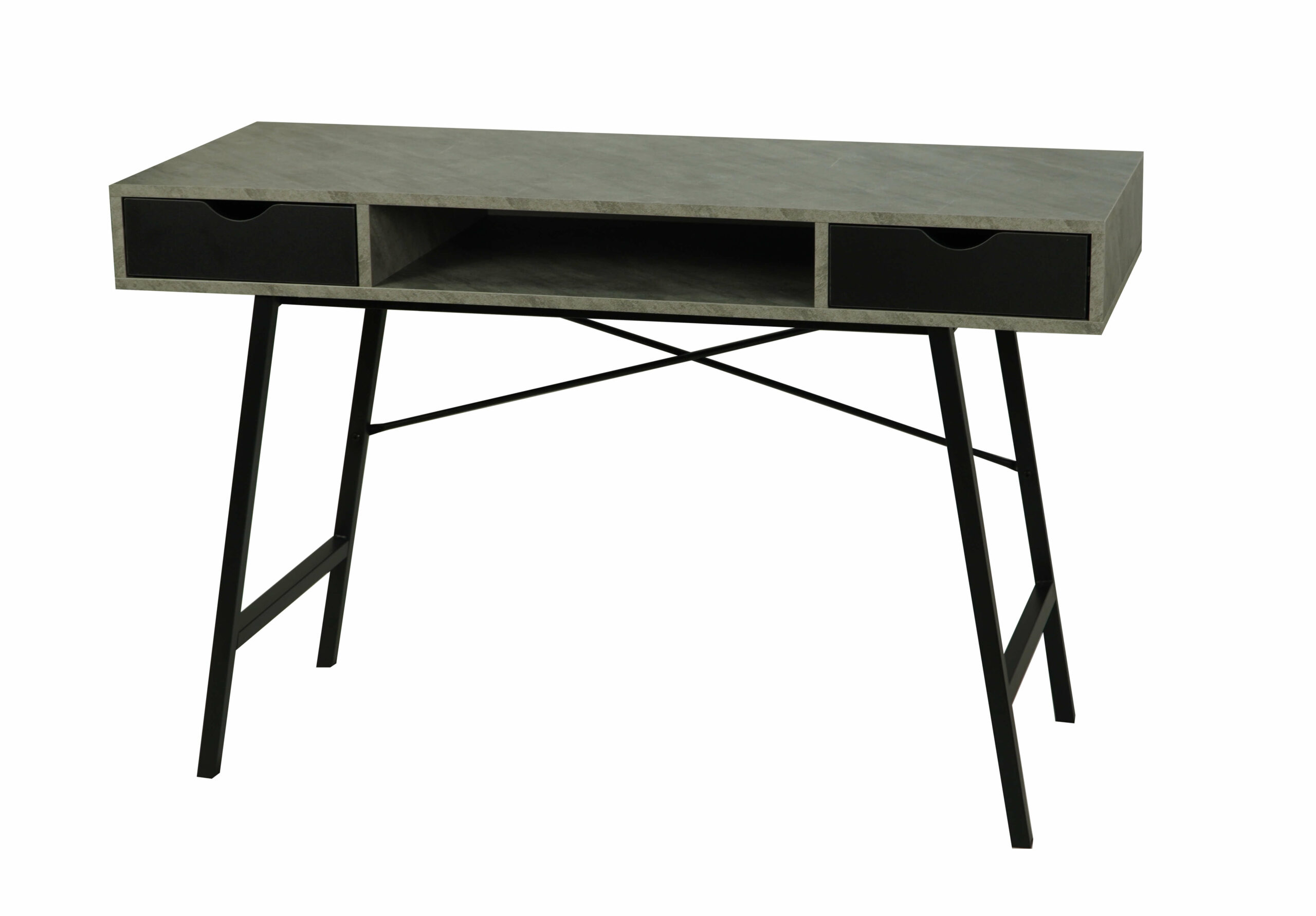 The light concrete‑effect MDF top adds an industrial yet elegant touch. Moreover, the black metal base provides excellent stability and visual contrast. Two pull‑out drawers help you organise office accessories, while a convenient shelf under the top offers extra storage for daily essentials.