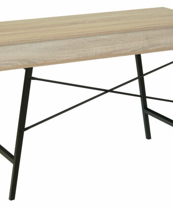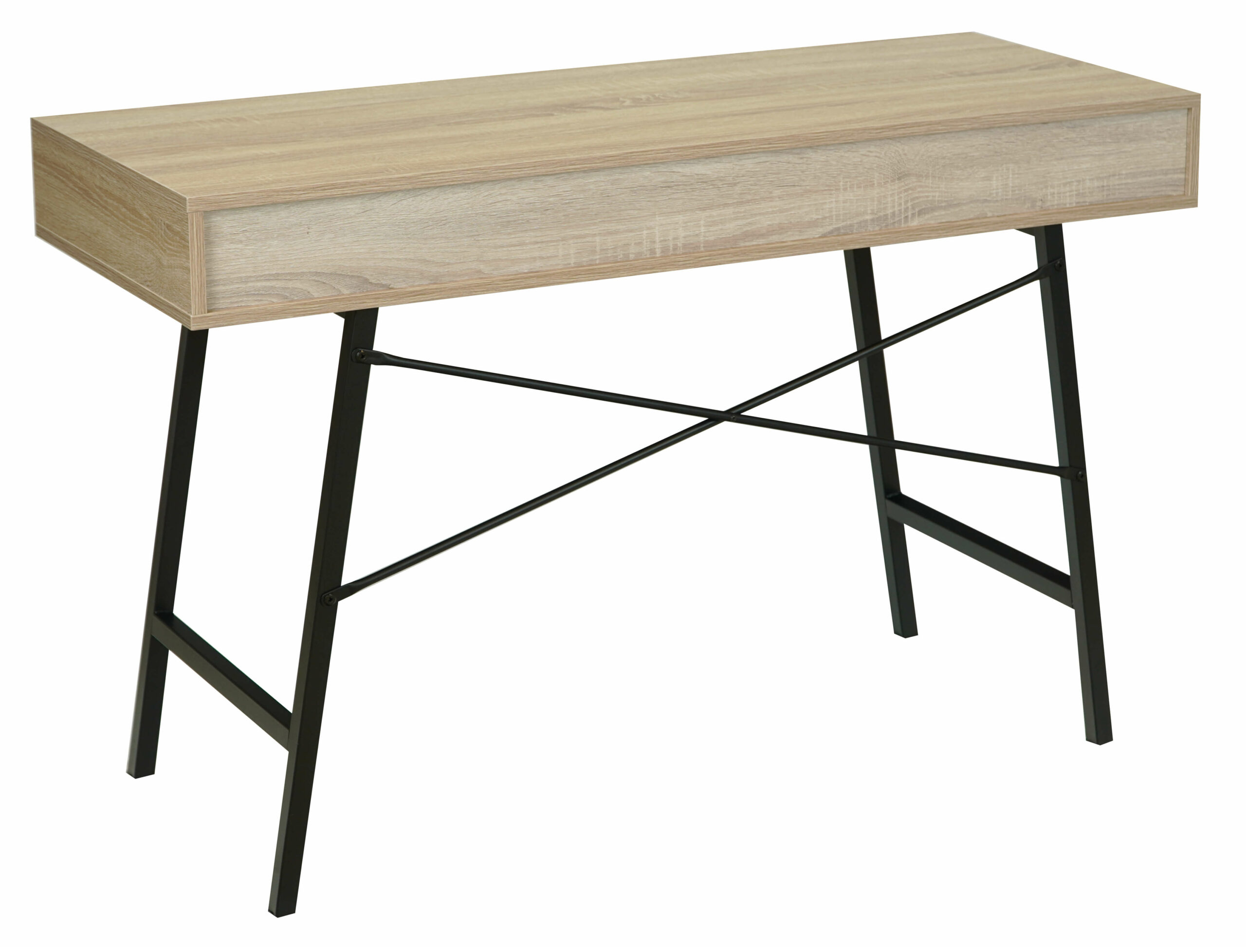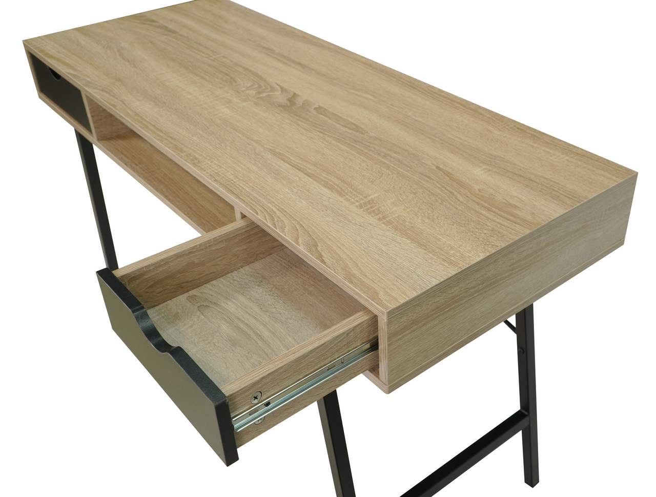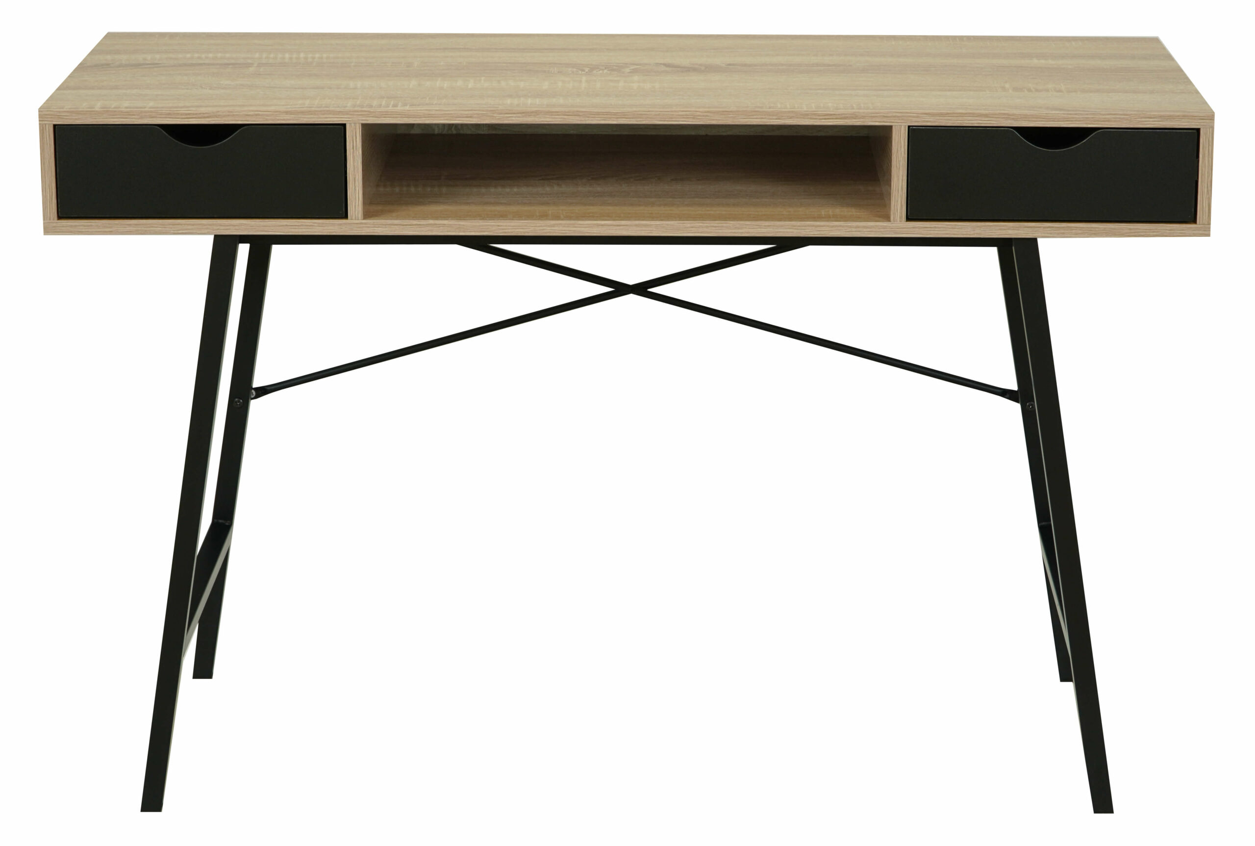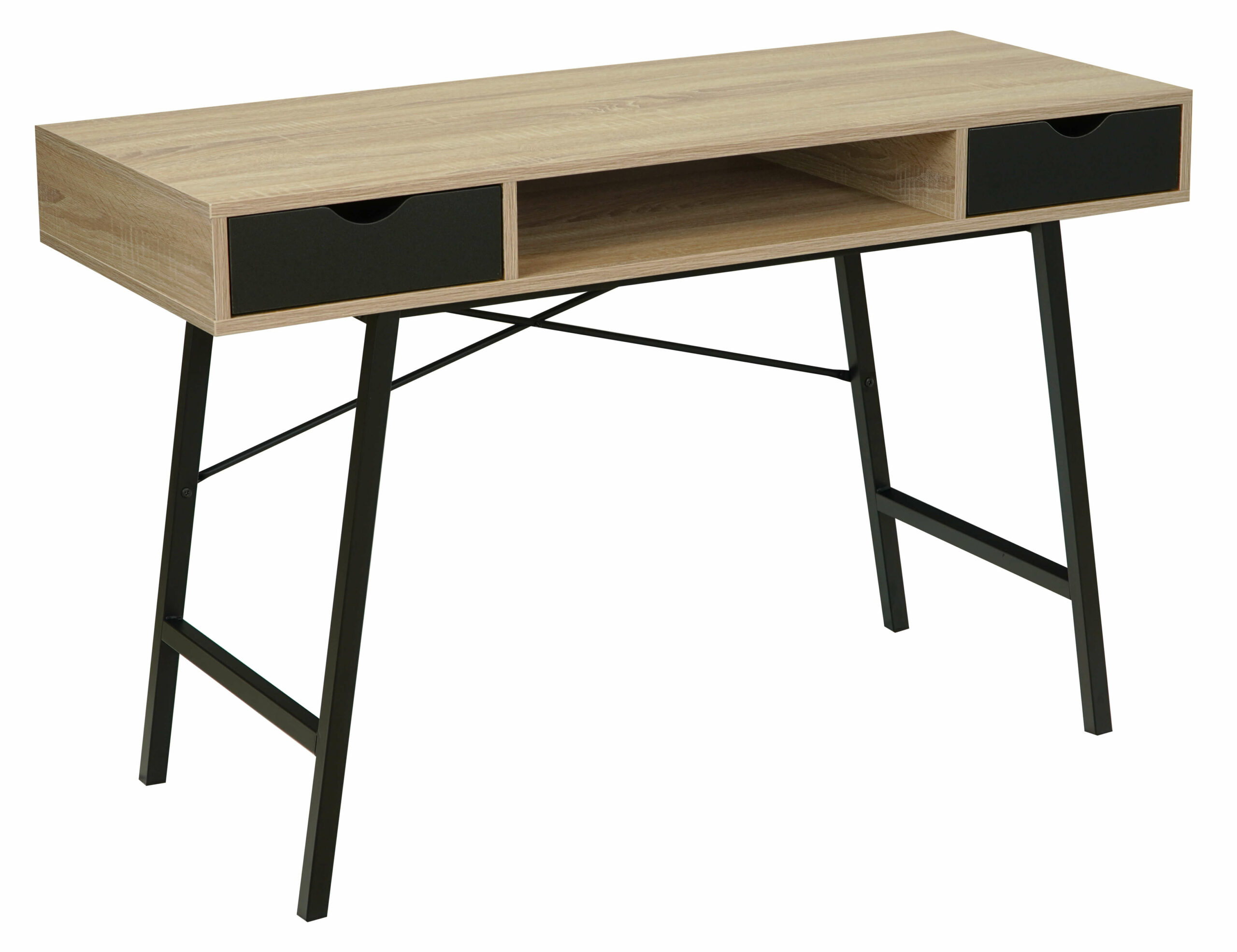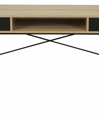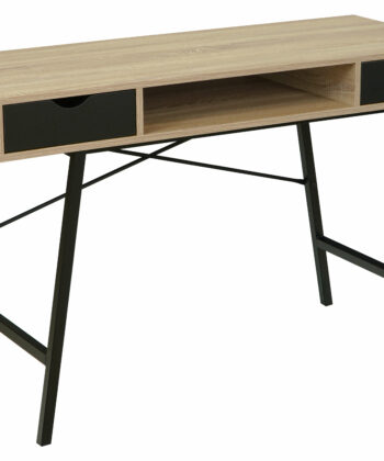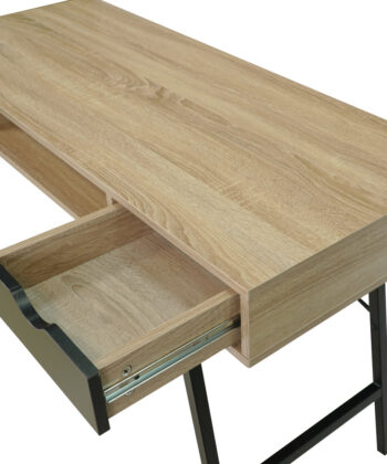 The oak sonoma MDF top delivers a warm, textured surface that echoes natural wood grain. In contrast, the black metal frame adds modern structure and stability. Two pull‑out drawers provide practical storage for everyday essentials. Furthermore, a convenient shelf under the top offers extra room for quick access items.