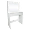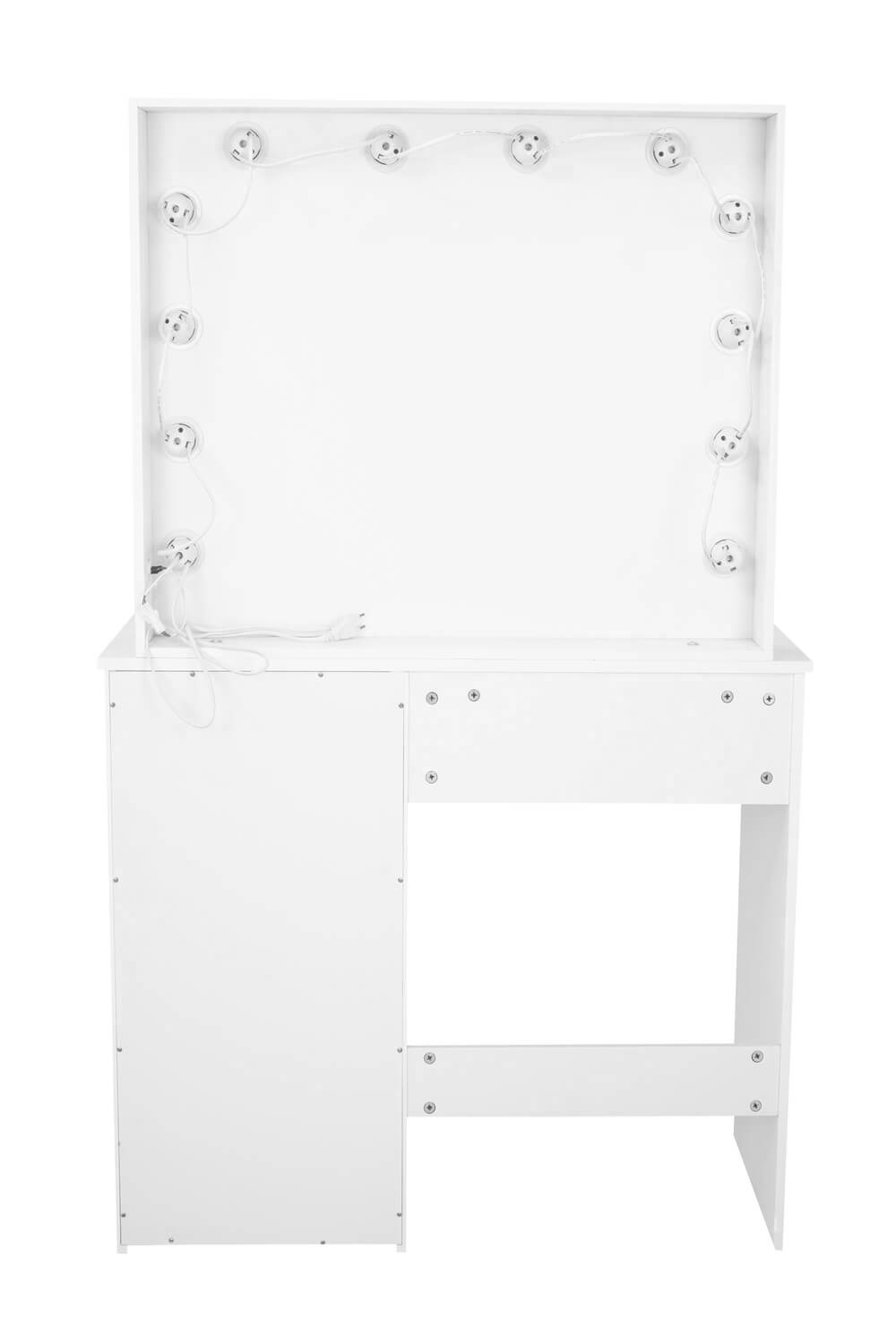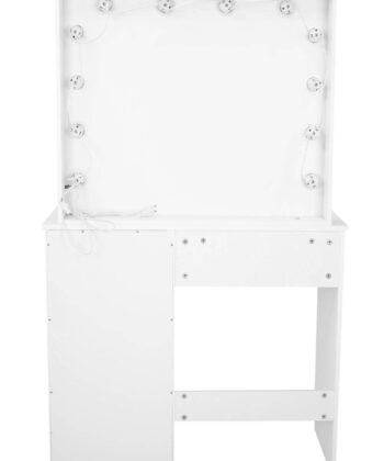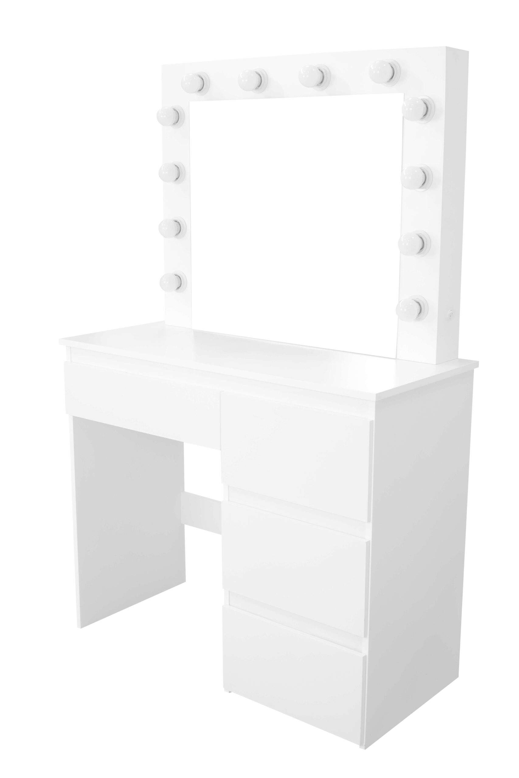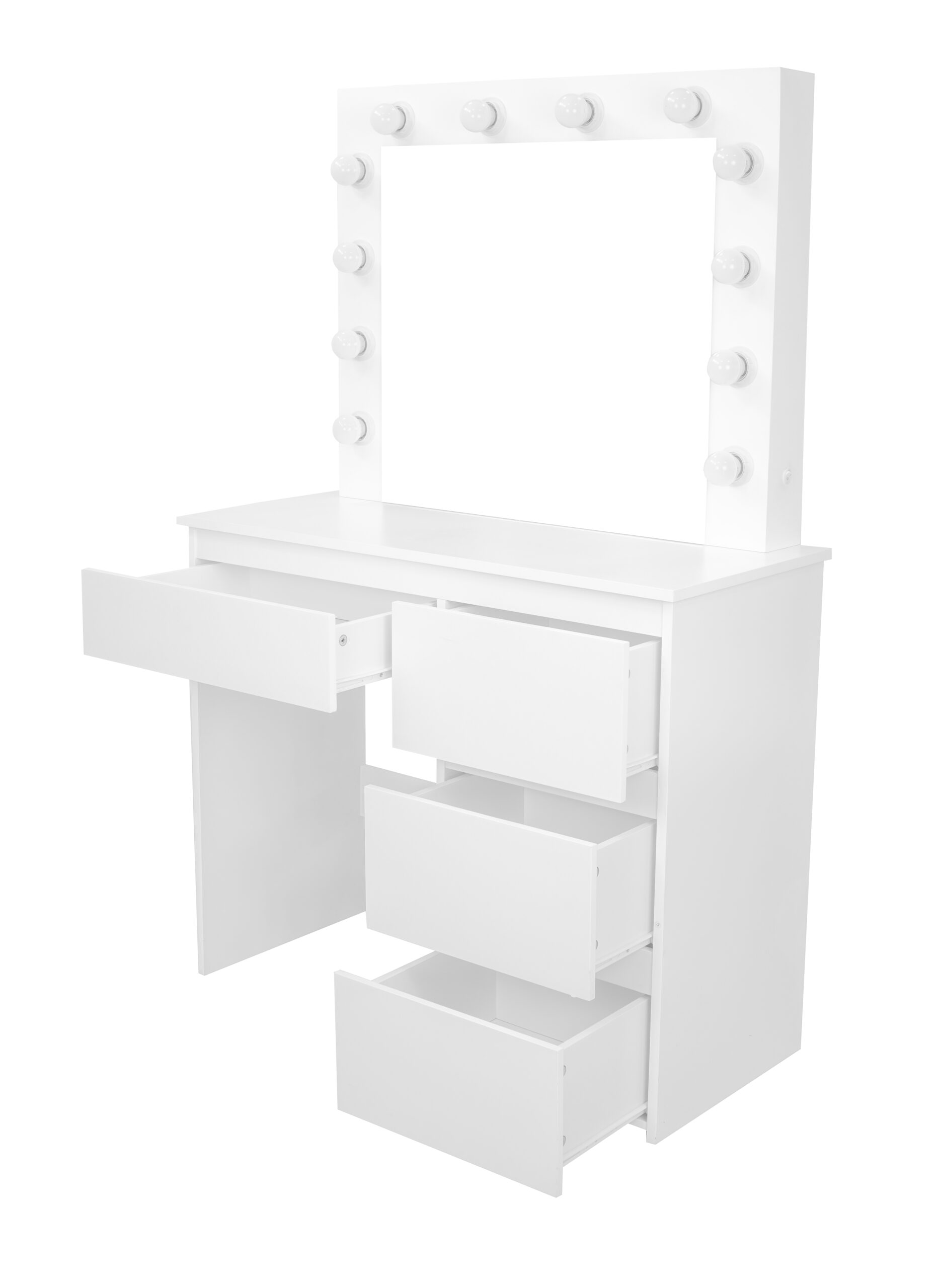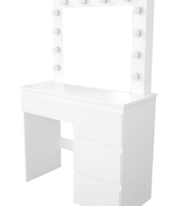 EmmaGlow features matte white MDF, large mirror with 12 LED bulbs and 4 drawers for organized beauty or work routines. Ideal for PouffeLOVE compact living spaces.