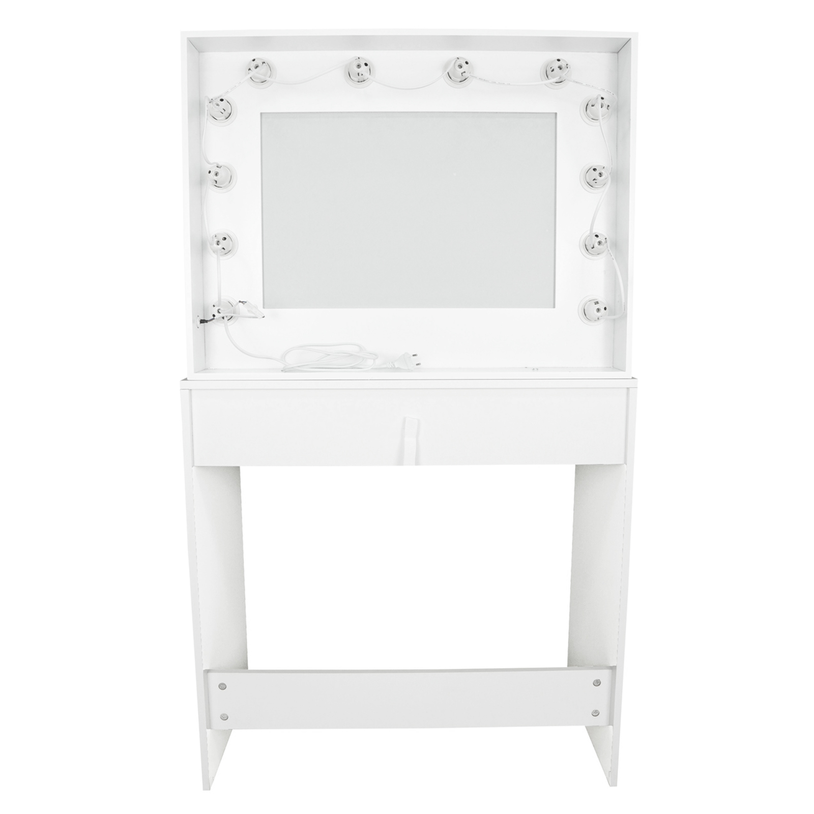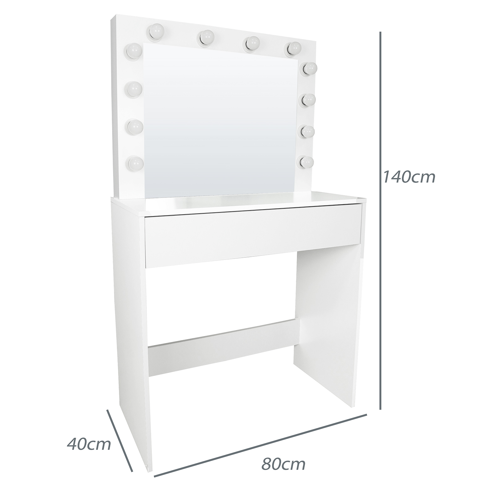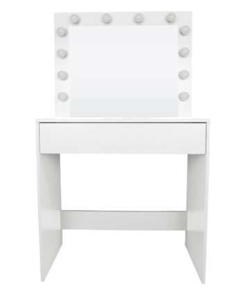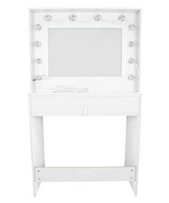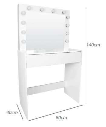 – Finish: Matte white – Material: Durable MDF board – Drawer: 1 large storage drawer – Lighting: Integrated LED system with 12 bulbs (warm tone) – Width: 80 cm – Depth: 40 cm – Height: 140 cm – Includes mirror: Yes – Includes stool: No