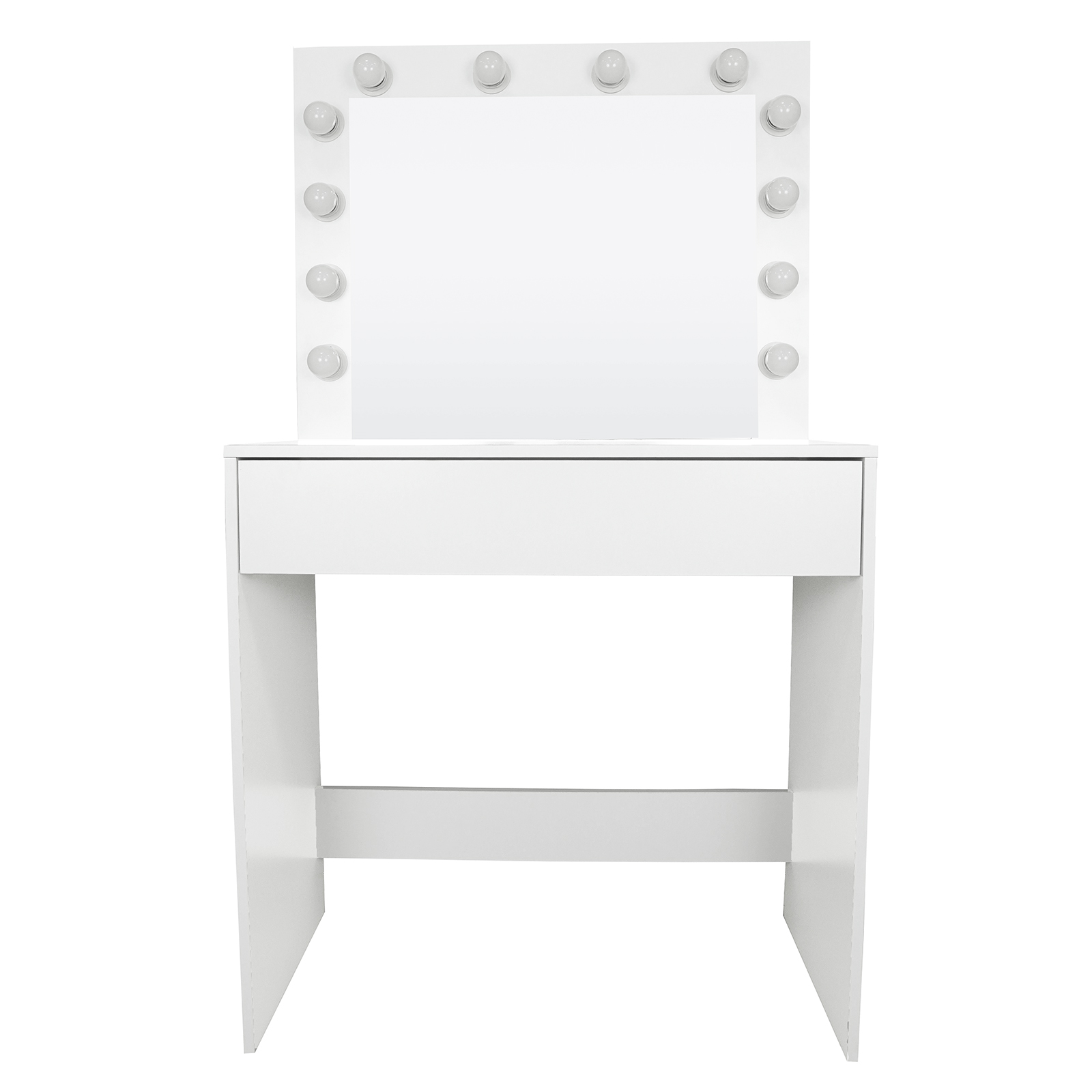 Crafted from high-quality MDF board with a matte white finish, this vanity table exudes timeless elegance while ensuring durability. The large mirror with 12 warm LED bulbs offers perfect lighting for flawless makeup application, resembling a professional studio.