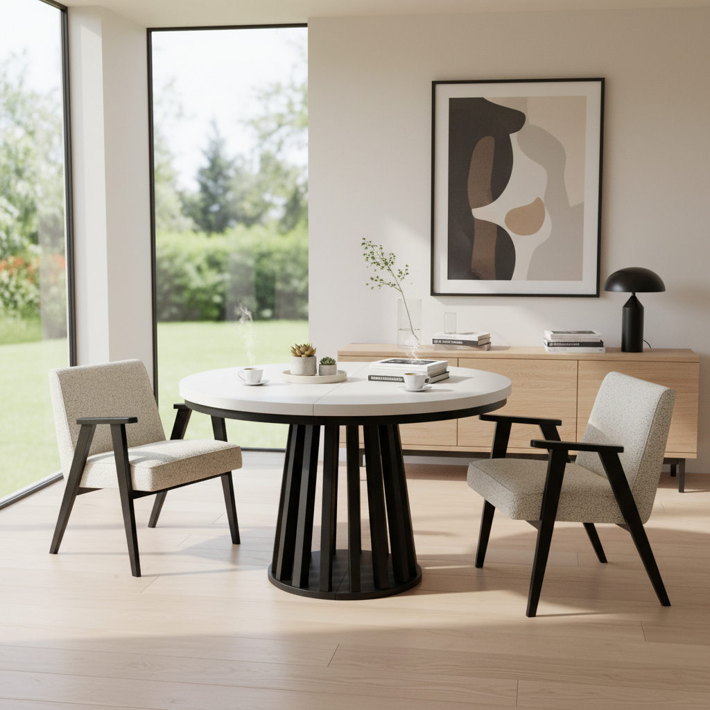The Tovo table is designed for homes where flexibility matters. In its compact form, the round 100 cm top is ideal for daily meals and smaller rooms. When extended to 180 cm, it becomes a spacious oval table that comfortably supports family gatherings, dinners with friends, or weekend entertaining. Moreover, the extension mechanism is smooth and convenient, making size changes quick and effortless.