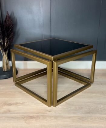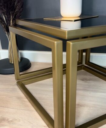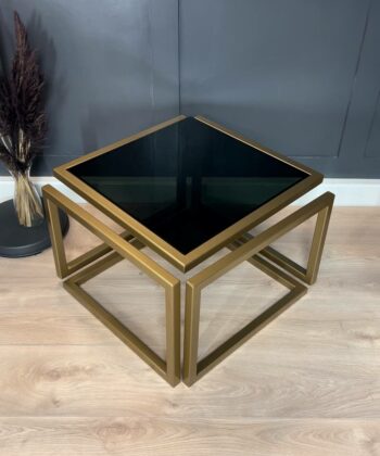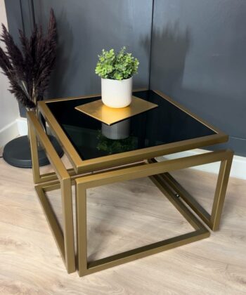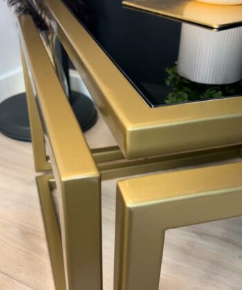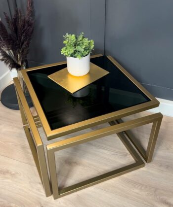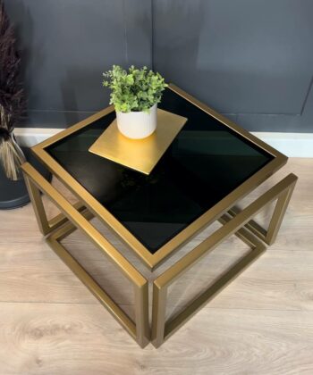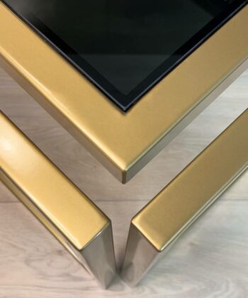 The Levitas Gold Coffee Table 60x60cm is a striking blend of modern minimalism and timeless elegance. This designer table features a powder-coated frame in a rich old-gold finish and a unique floating effect, thanks to its seamless 30 mm metal profile construction with no visible screws or connections1. The dark-tinted, tempered glass top adds a sophisticated touch while ensuring durability for everyday use.