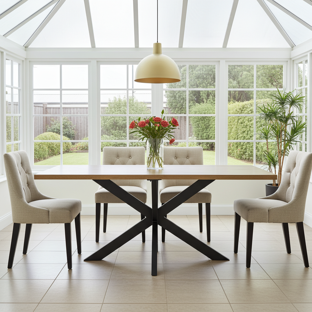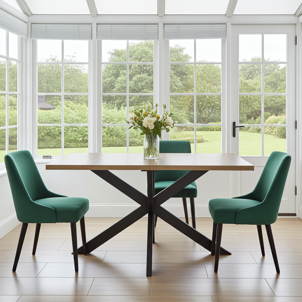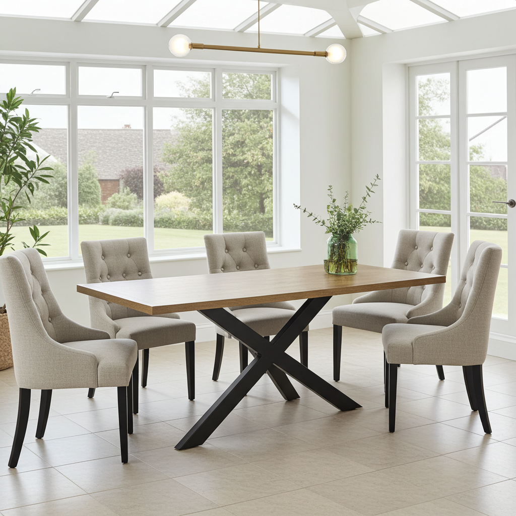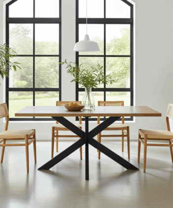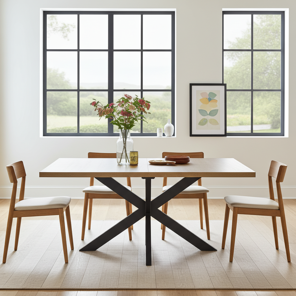 – ✓ Top: Laminated board, 3.6 cm thick – ✓ Colours: Wide choice of wood and modern finishes (see photo) – ✓ Frame: Powder-coated steel, matte black – ✓ Width: 150 cm (extends to 190 cm) – ✓ Depth: 80 cm – ✓ Fast extension system – ✓ Durable and scratch-resistant – ✓ Easy-clean surface – ✓ Self-assembly, all fittings included