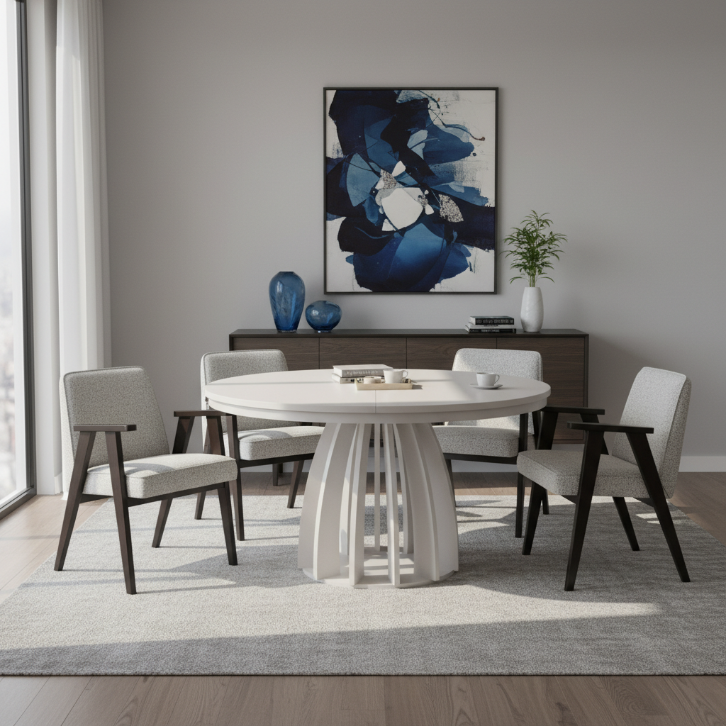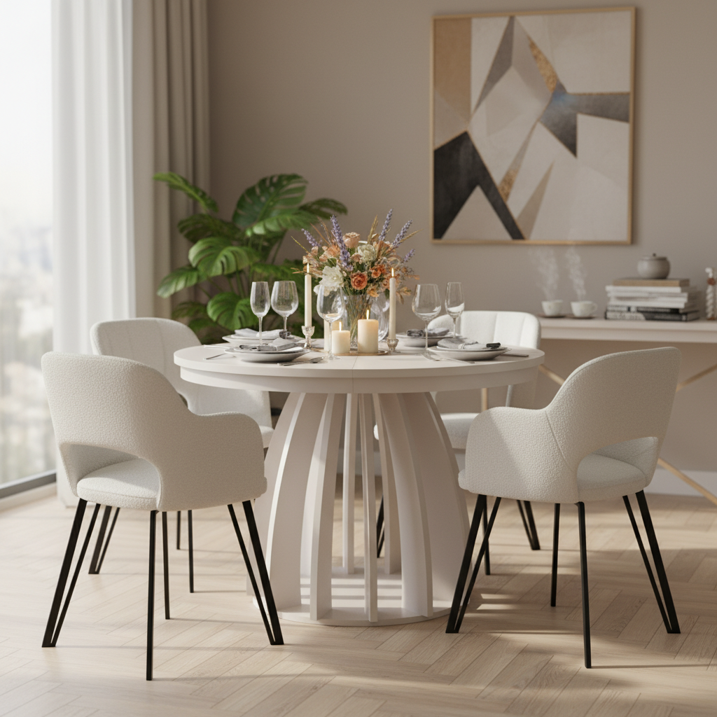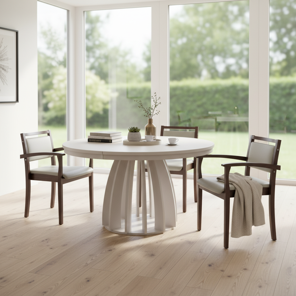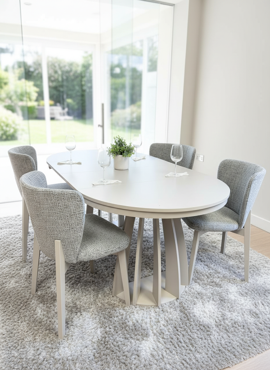 – ✓ **Finish**: Cashmere U12168 (Pfleiderer) – ✓ **Top**: Laminated furniture board with wear-resistant ABS edging – ✓ **Shape**: Round (extends to oval) – ✓ **Extendable**: Top opens from 100 cm to 180 cm instantly – ✓ **Base**: Decorative arched panels for strength and striking style – ✓ **Use**: Dining room, kitchen, open-plan living – ✓ **Care**: Easy-clean, stain-resistant surfaces – ✓ **Assembly**: Delivered flat-packed with clear instructions – ✓ **Warranty**: 24 months – ✓ **Delivery Time**: 2–4 weeks