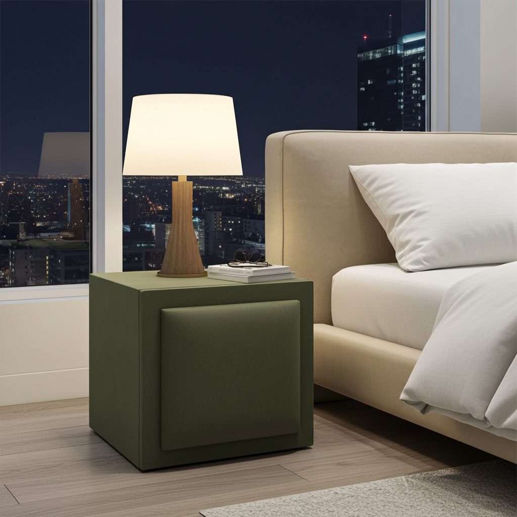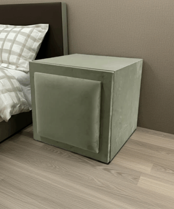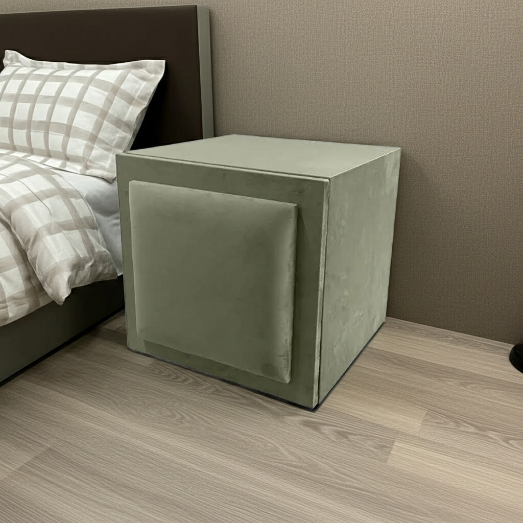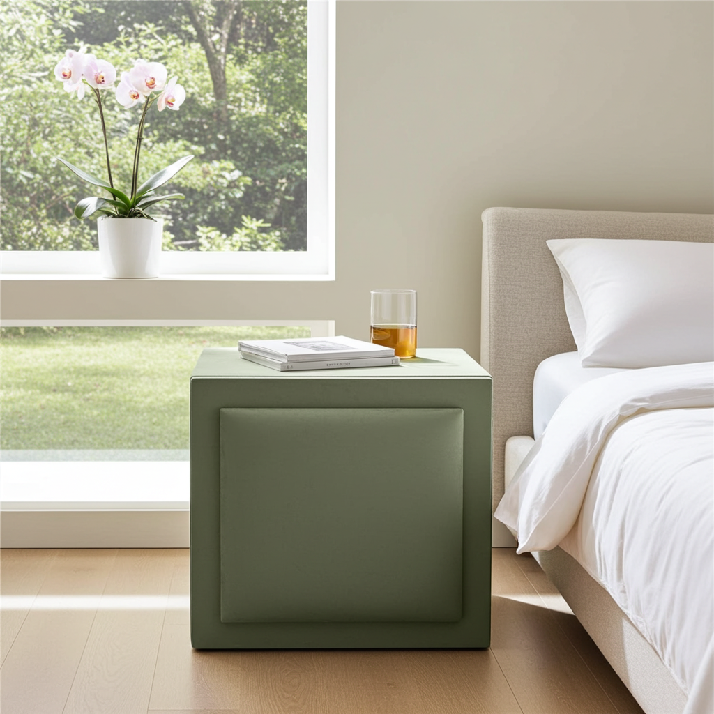 Lori brings a soft, hotel‑style finish to the bedside with full upholstery over the top, sides, and front, so the cube looks refined from every angle and feels gentle to the touch. Moreover, the recessed cushioned panel adds depth and character, while the hinged front opens smoothly to reveal an internal shelf that keeps books, glasses, and chargers neat yet within reach. Consequently, the night routine stays calm and organised, even in compact rooms. ✅
