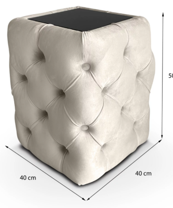 - Construction: Built on a sturdy frame made of 16 mm chipboard reinforced with wooden elements. The filling consists of 5 cm thick T25 foam for durability and comfort, complemented by an additional layer of wadding. The tabletop is crafted from black Lacobel glass (25×25 cm), which is easy to clean and scratch-resistant. The structure stands on durable triangular sliders with a height of 15 mm.