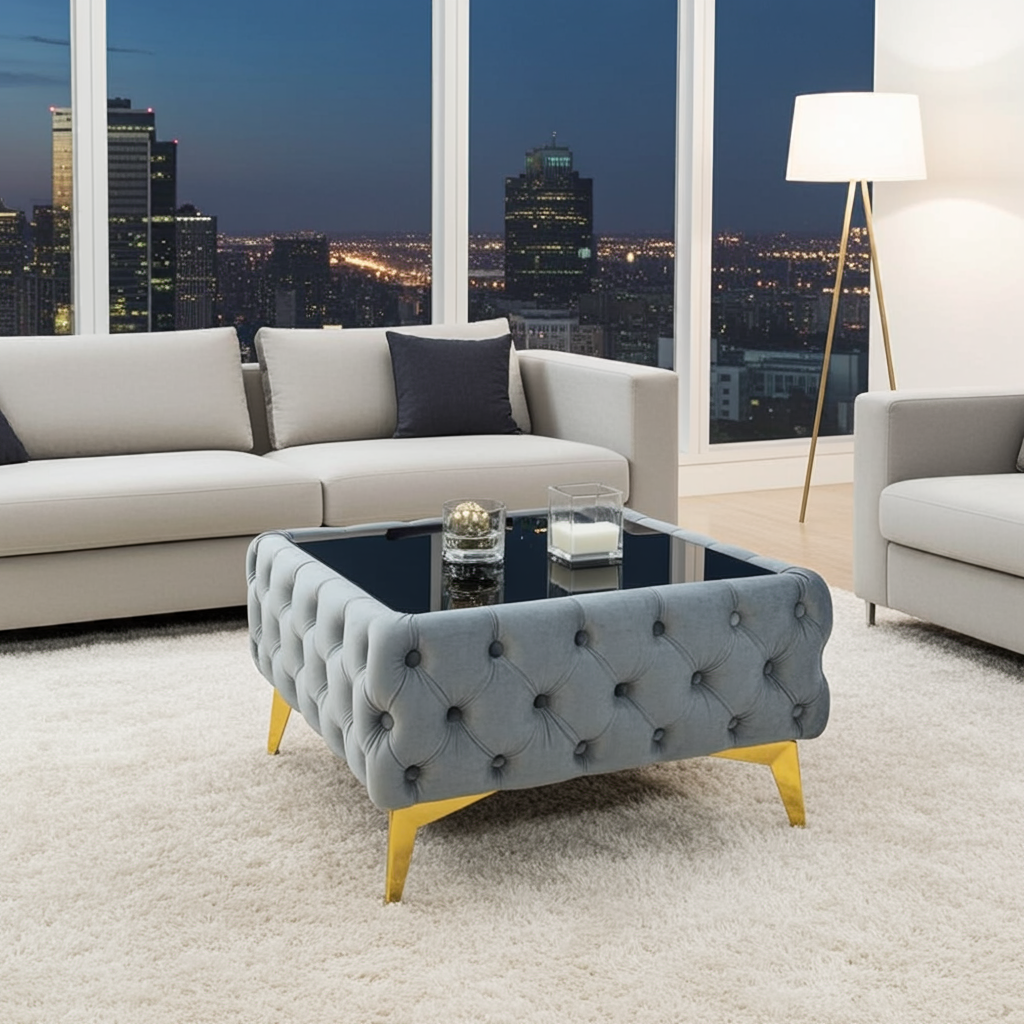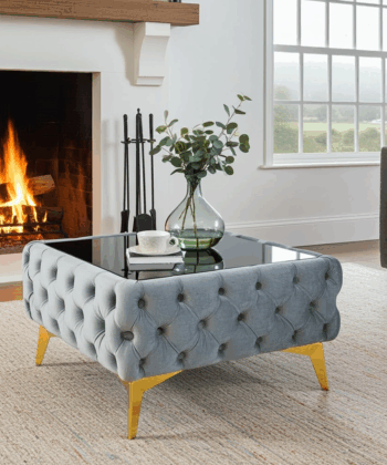 The Azure Coffee Table is a stunning addition to any modern living space. Featuring plush velvet upholstery in a soothing azure shade and a durable glass top, this coffee table combines elegance and functionality for Irish homes. The tufted premium velvet brings a refined look and a soft touch, while the black glass top adds a sleek, contemporary edge. Whether you’re serving coffee, displaying décor, or storing magazines, this table is both practical and eye-catching.